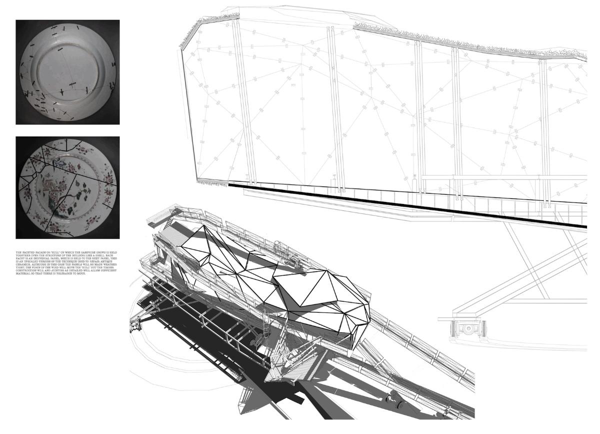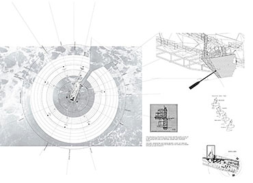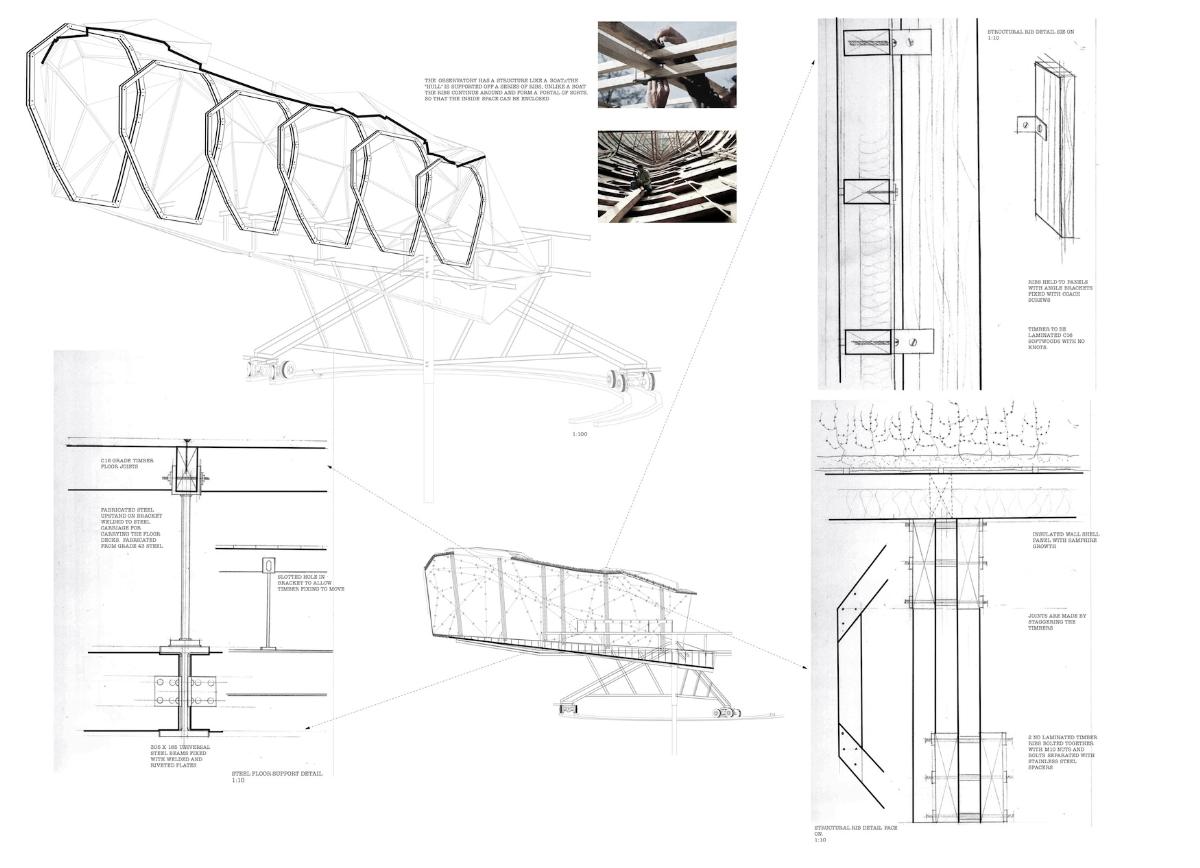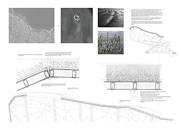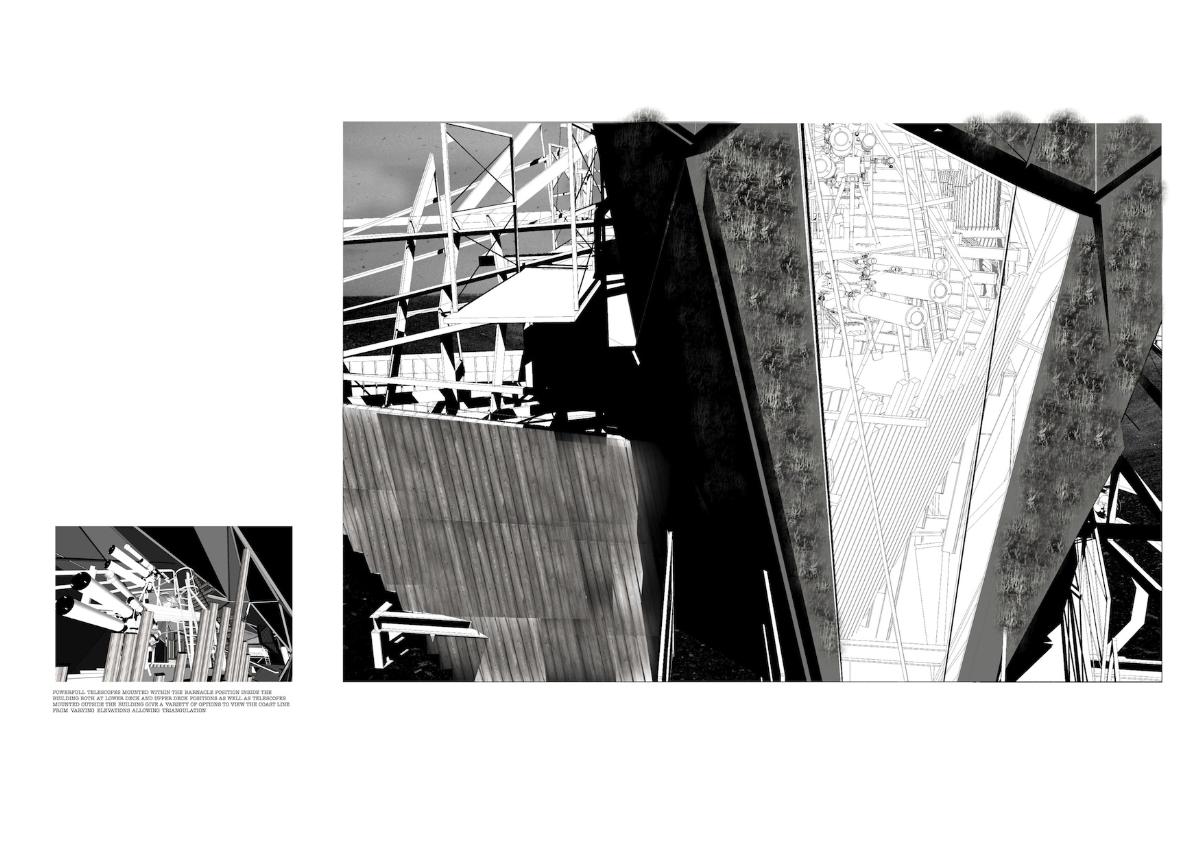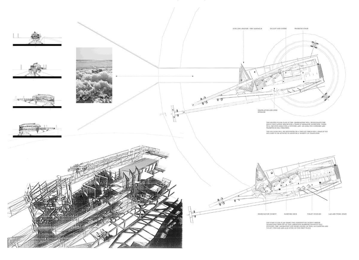Scientists living within the building will have to learn to adapt to life in the building, waking and working with the tides, and warming themselves in the heated bunks when it gets to cold, and maintaining the Samphire planted façade of the building and resmothering it with silt and clay, gathered when the tide goes out.
