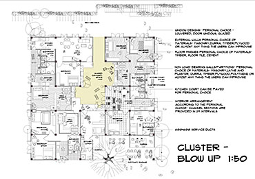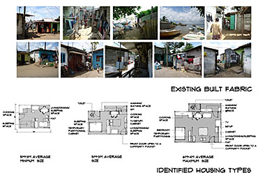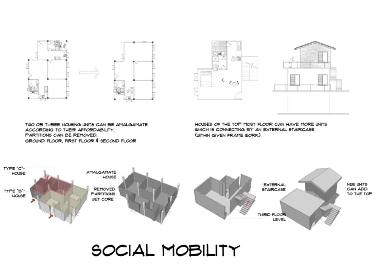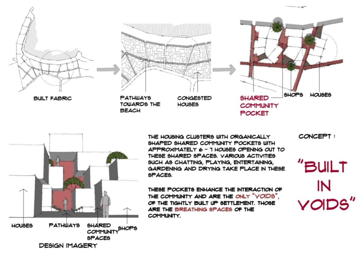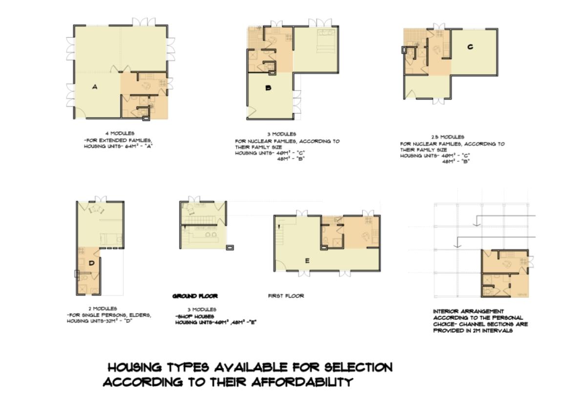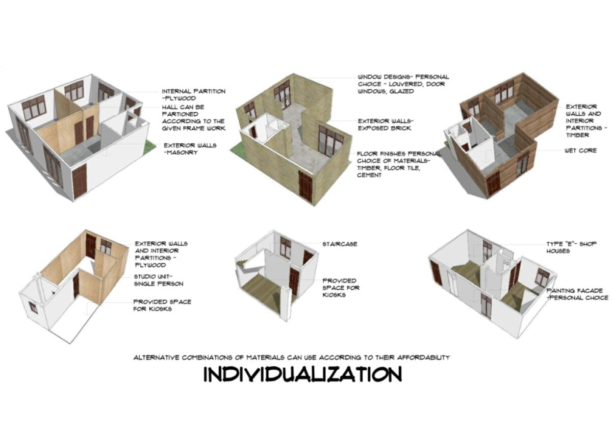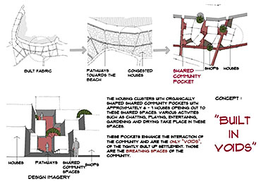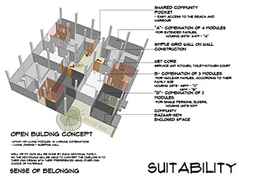 Community Housing Part 2 Project 2012 Chamika Jayarathne University of Moratuwa | Sri Lanka It has been revealed that about 40% of Colombo’s night population lives in under-served, low-income settlements. This project seeks to look at new architectural possibilities for the regional housing predicament by providing flexible, adaptable and incremental residential units for more than 180 squatter families living in a coastal urban edge.The main objective of the design is to provide a shared community pocket to support an interdependent community structure, while maintaining the individuality and ownership of the private housing units. The subsequent spatial design caters to the perceived activity patterns of the community as well as the need to introduce new activities to sustain the community’s future. The ability to personalize the interior and exterior to reflect one’s own individuality- without disrupting the housing environment as a whole - and the need to create a strong public realm have therefore been the key design parameters.The planning of the settlement is based on a network of clustered housing units and pedestrian pathways, linking the whole community together. A typical cluster consists of approximately 6 - 7 houses, opening out to a shared community space. The houses are informally organized around these organically-shaped community pockets, which provide the backdrop to community activities such as chatting, playing, entertaining, gardening and drying of clothes.These pockets enhance the interaction of the community and are the only "voids" in the otherwise tightly built up settlement. These planned – or ‘built-in’ - voids thus are the breathing spaces of the new community. The multi level nature of the building, however, required the ground-based community activities (voids) to be carried across to the upper levels to preserve the community identity and facilitate social interaction.The building as such is designed as three parts: (1) a structural skeleton with the associated provisions for wet services, (2) modular dwelling units to be incrementally inserted to the given structural frame, and (3) the ‘built-in voids’ organized around the dwelling units. The height of the building is limited to four storeys to achieve a walk-able building while complying with the nominal building density regulations proposed for this type of buildings. Tutor(s) Archt. N. Perera