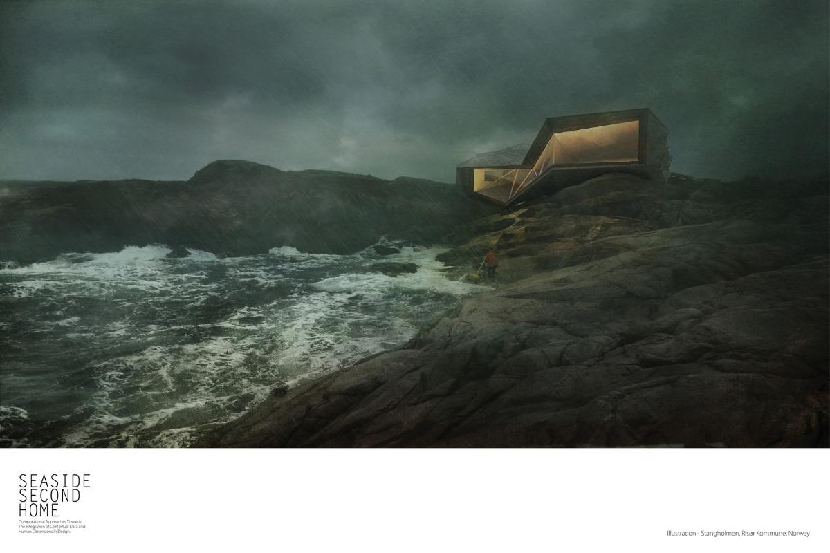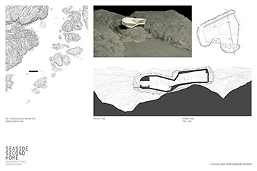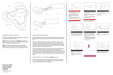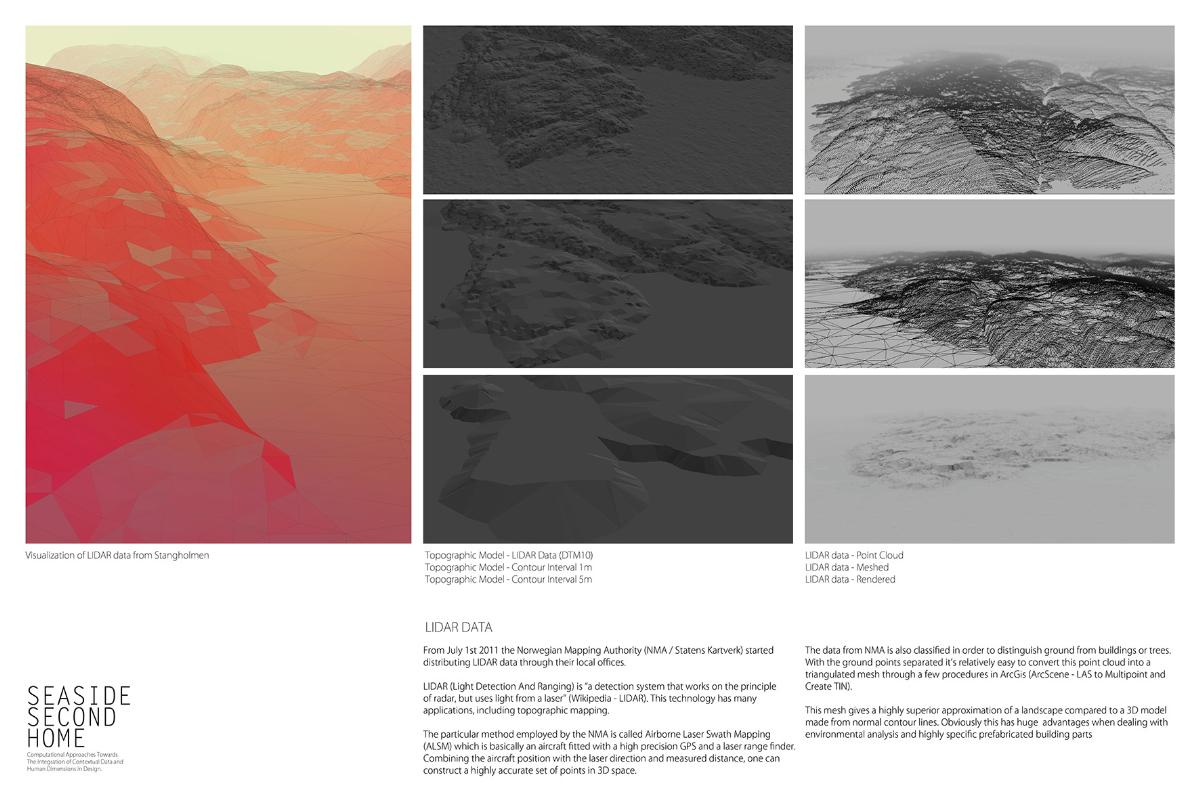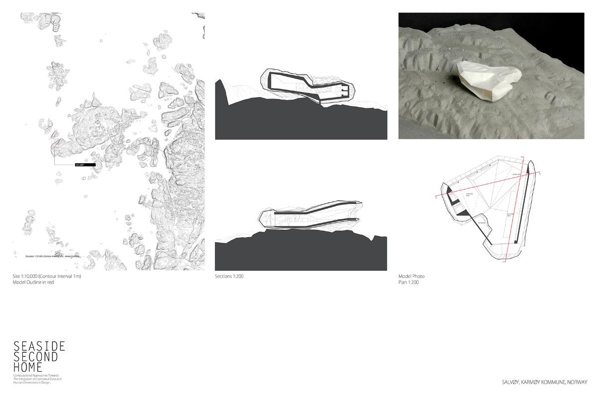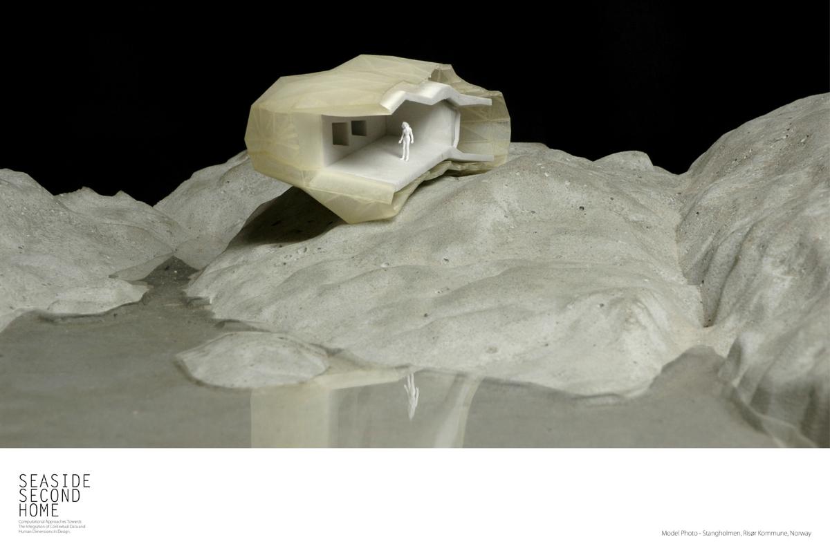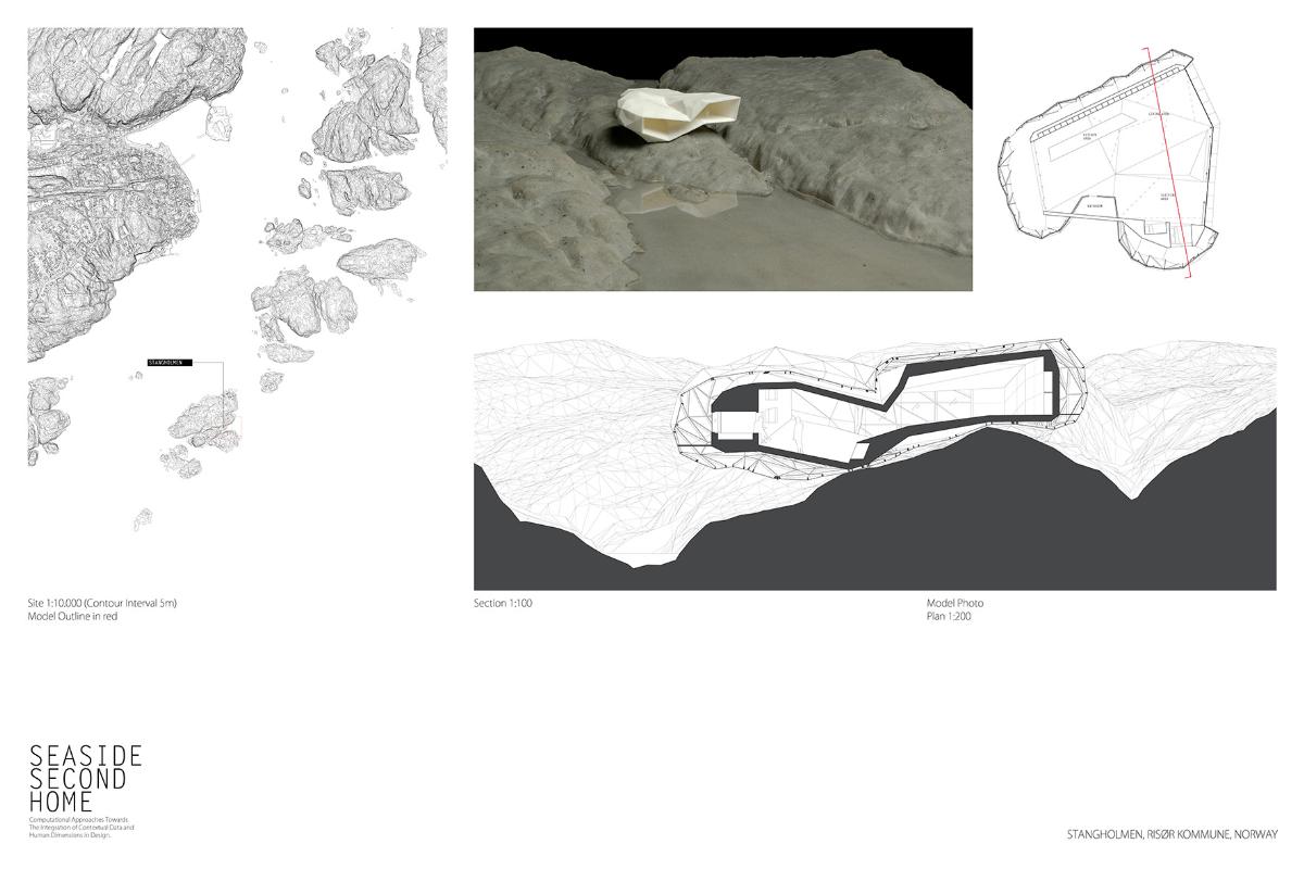 Seaside Second Home Part 2 Project 2012 Joakim Hoen Oslo School of Architecture and Design Oslo | Norway ‘Seaside Second Home’ aims to create a model for digitally conceived and fabricated houses and highlight how contextual parameters can be the main drivers of design. What is important is the process, or processes, which lead to the final architectural design.Greg Lynn argued in 1999 that we should be designing in an animate environment, where form is a result of ambient forces over time. In order to do this efficiently we need to employ computational strategies for simulation of these environments as well as means of analyzing and altering form according to these.The project is an attempt to integrate contextual data (weather and topography) as well as human dimensions in the digital conception of a series of second homes. These are designed to be specific responses to instances of a particular type of site which can be found everywhere along the Norwegian coastline, characterized by bare rocks, marine climate and spectacular views.Instead of designing a single discrete cabin, the project tries to establish data structures, describing the relationship between the various needs of the inhabitants and the extrinsic data that articulates the layers of the building envelope. To demonstrate this, three sites were chosen as examples.The project required the development of a series of custom software tools.The first set of these interface with Meteorologisk Institutt and Statens Kartverk in order to effectively gather and prepare weather and LIDAR-data for use in the design process. The other looks at the use of this data as input in a generative process leading to a similar but different design for every site of the same type.Simultaneously a spatial idea were developed, based on a continuous space where vertical communication is the space and that this space is divided by inclining the floor and ceiling surfaces to block off or provide visual contact between functions as one moves through the building. This challenges not only the way we look at ‘the floor’ but also the cellular room arrangement that according to Robin Evans (“Figures, Doors and Passages”) has been predominant in our dwellings for the last 500 years. Tutor(s) Michael Hensel