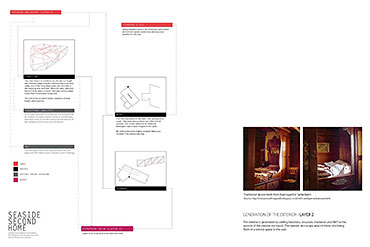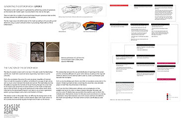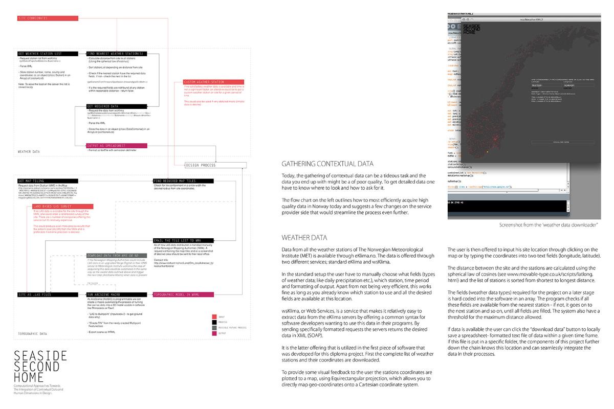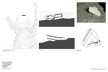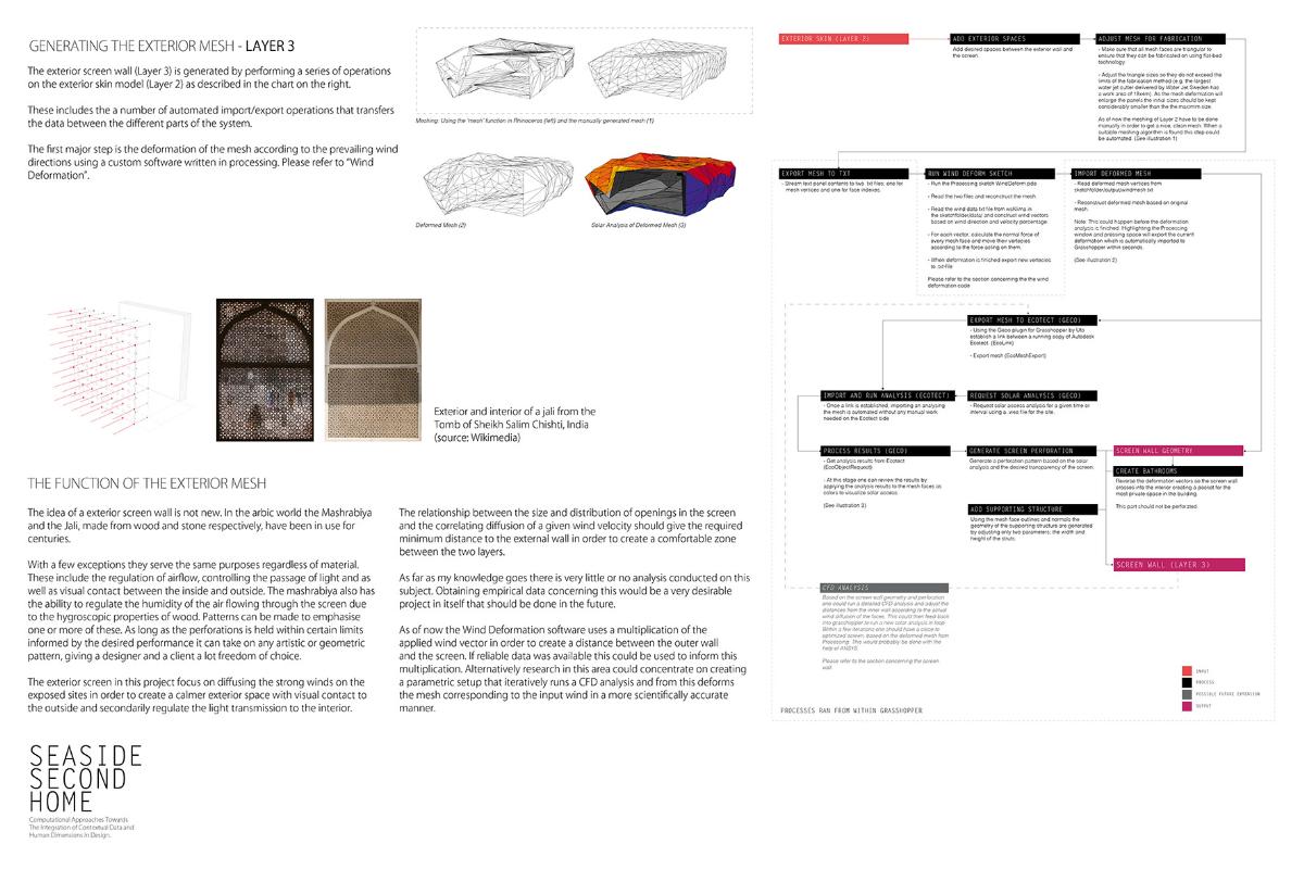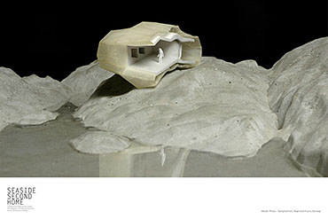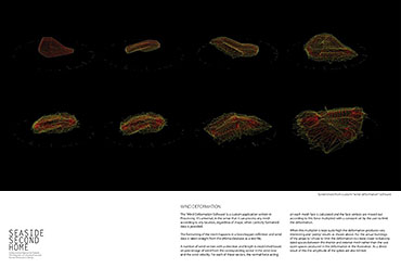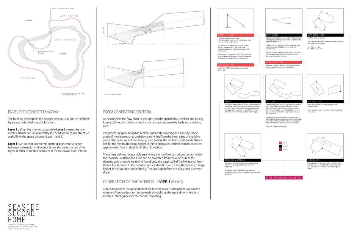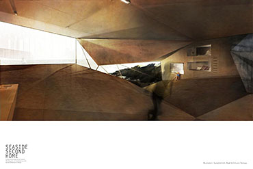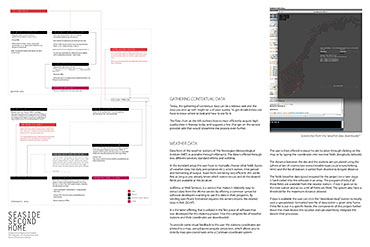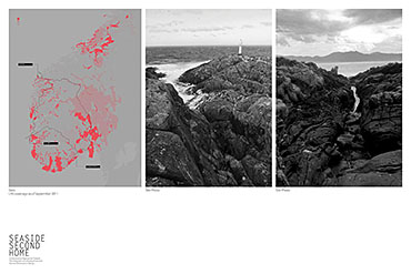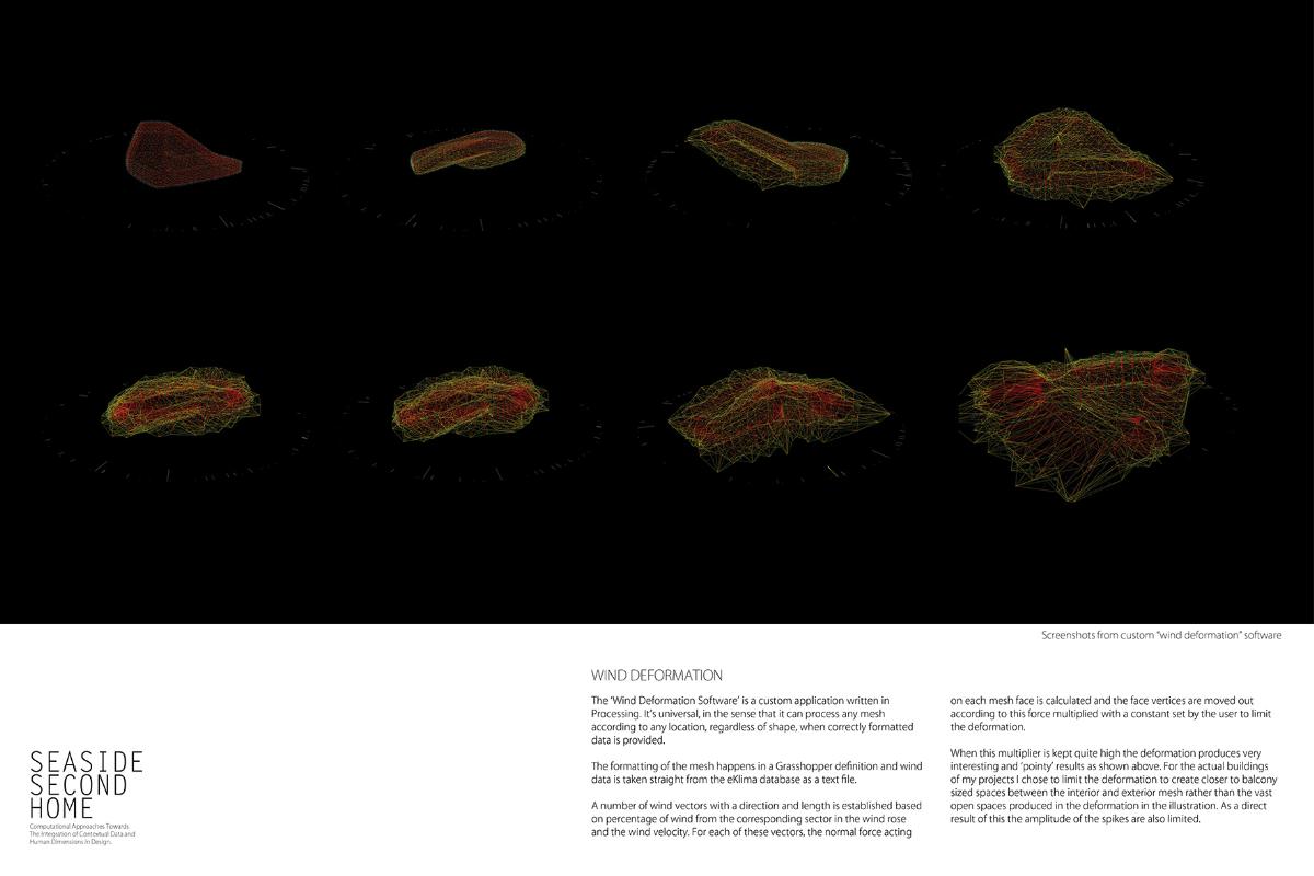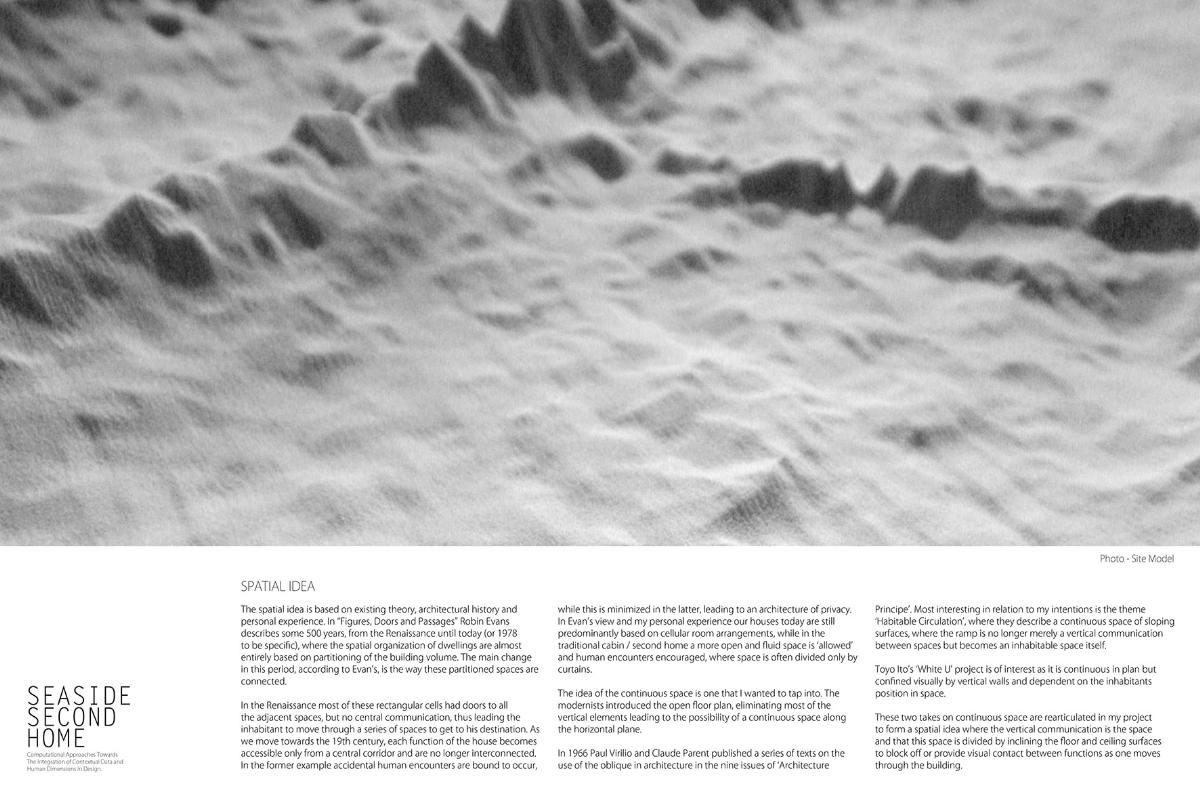 Seaside Second Home Part 2 Project 2012 Joakim Hoen Oslo School of Architecture and Design Oslo | Norway ‘Seaside Second Home’ aims to create a model for digitally conceived and fabricated houses and highlight how contextual parameters can be the main drivers of design. What is important is the process, or processes, which lead to the final architectural design.Greg Lynn argued in 1999 that we should be designing in an animate environment, where form is a result of ambient forces over time. In order to do this efficiently we need to employ computational strategies for simulation of these environments as well as means of analyzing and altering form according to these.The project is an attempt to integrate contextual data (weather and topography) as well as human dimensions in the digital conception of a series of second homes. These are designed to be specific responses to instances of a particular type of site which can be found everywhere along the Norwegian coastline, characterized by bare rocks, marine climate and spectacular views.Instead of designing a single discrete cabin, the project tries to establish data structures, describing the relationship between the various needs of the inhabitants and the extrinsic data that articulates the layers of the building envelope. To demonstrate this, three sites were chosen as examples.The project required the development of a series of custom software tools.The first set of these interface with Meteorologisk Institutt and Statens Kartverk in order to effectively gather and prepare weather and LIDAR-data for use in the design process. The other looks at the use of this data as input in a generative process leading to a similar but different design for every site of the same type.Simultaneously a spatial idea were developed, based on a continuous space where vertical communication is the space and that this space is divided by inclining the floor and ceiling surfaces to block off or provide visual contact between functions as one moves through the building. This challenges not only the way we look at ‘the floor’ but also the cellular room arrangement that according to Robin Evans (“Figures, Doors and Passages”) has been predominant in our dwellings for the last 500 years. Tutor(s) Michael Hensel