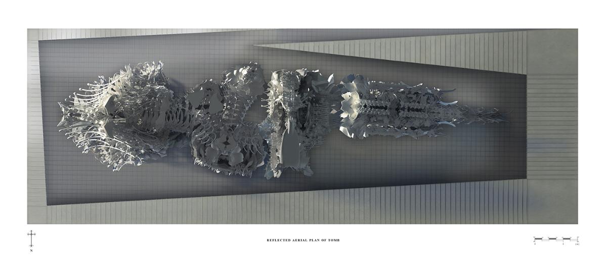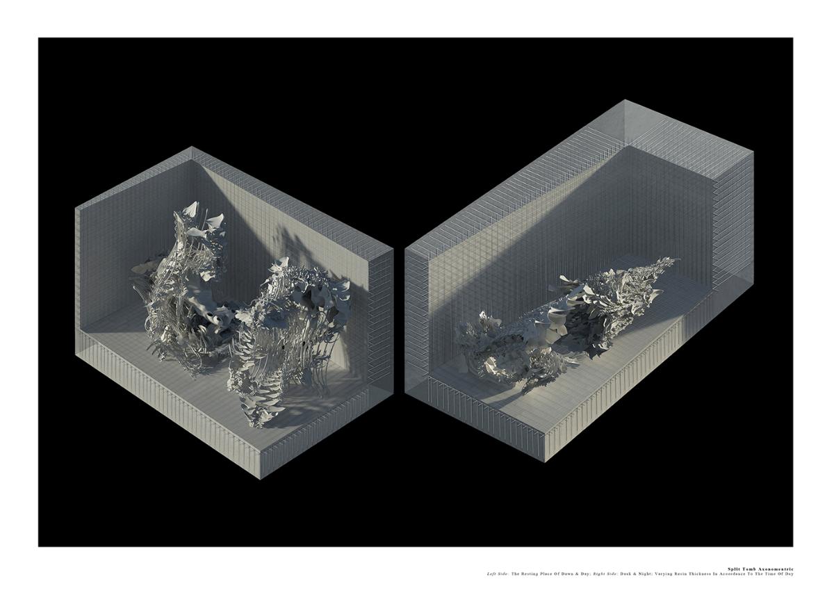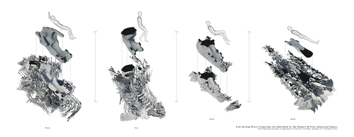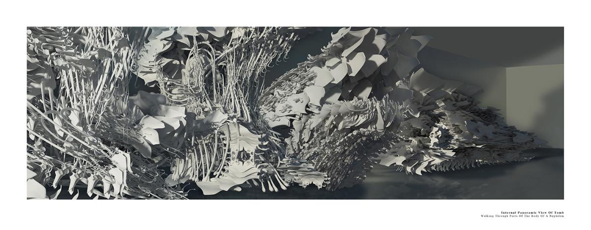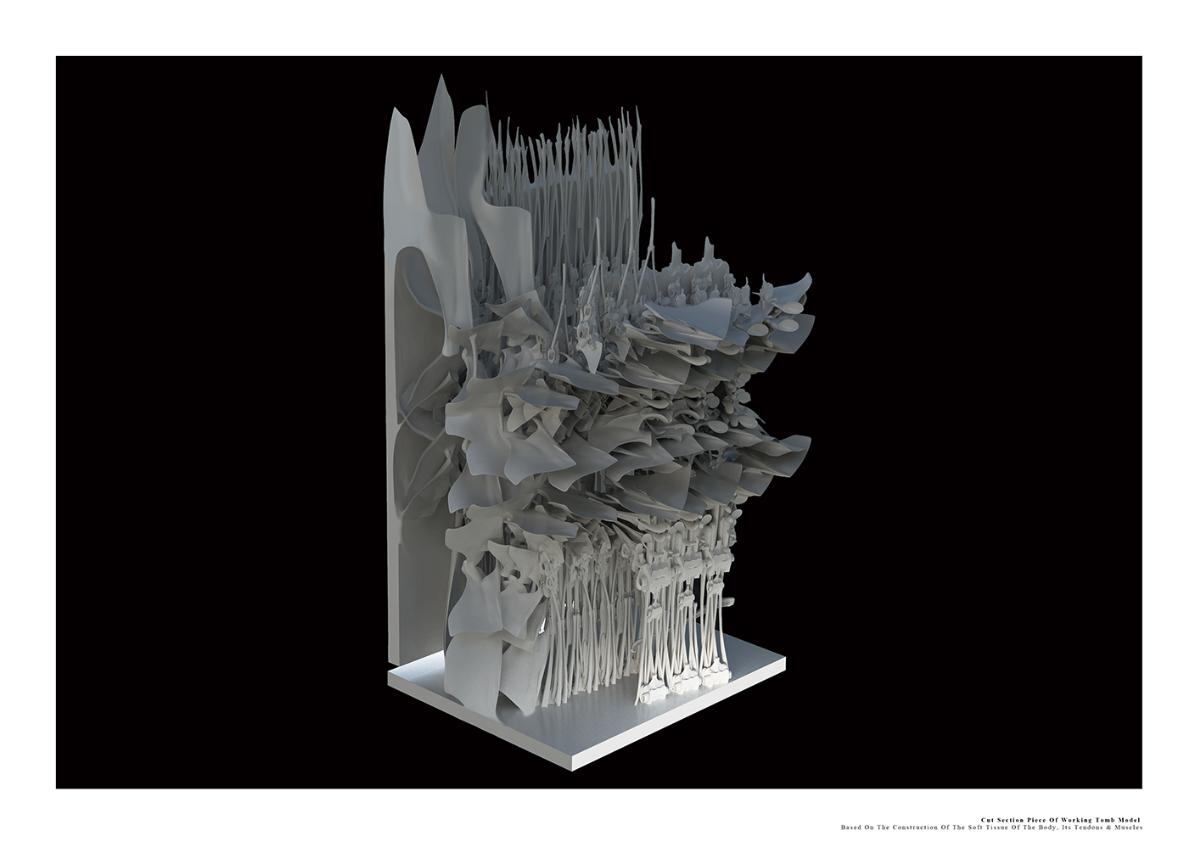 The Fields of Nephilim Part 2 Project 2012 Louise Cann Oxford Brookes University Oxford | UK The project reveals the individual’s eternal virtual identity in the face of the physical fact of death in the 21st Century, in the form of a tomb.The resting places in the tomb connect the individual with the memory of the four allegorical figures, Dawn, Day, Dusk, and Night in Michelangelo’s Medici Chapel in Florence. The form of the four resting places is derived from the poses adopted by the four classical figures. They are placed within a space formed by translucent resin walls of varying thickness, which transmit light in accord with the time of day. The quality of the light matches that existing at the latitude and longitude of Whitby, Yorkshire where Bram Stoker’s Dracula came ashore.The view from the resting places is derived from views within the human skull. The structure that supports the four resting places is based on the construction of the soft tissue of the body, its tendons and muscles. The genesis of the project lies within the contemporary Goth scene, with its elaborate codes of dress, with its emphasis on materials and detail, its theatrical air of gloom, and its poses to portray an identity that is classical in form. In parallel with this was a concern with the contemporary attempts of a family to access the personal digital social network records of a deceased relative.The Nephilim is a Biblical reference to a race of giant angel human hybrids. The spatial experience is that of walking through parts of the body of a Nephilim. The project was thus developed both physically through resin casts and modelling of the human skull, and digitally mapping the soft tissue of the body. The construction of the resting places is of simple variable, detailed, grey ceramic components that slot one into another. The surface material of the resting places are tactile to the fingertips, covered in components that are shaped like computer keys. Tutor(s)Prof Andrew Holmes Declan Molloy