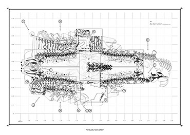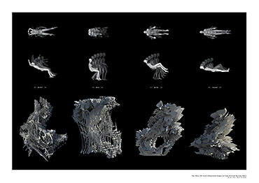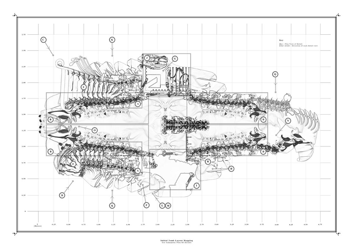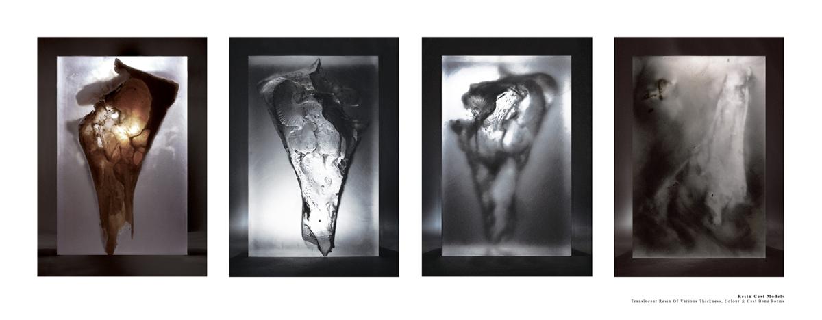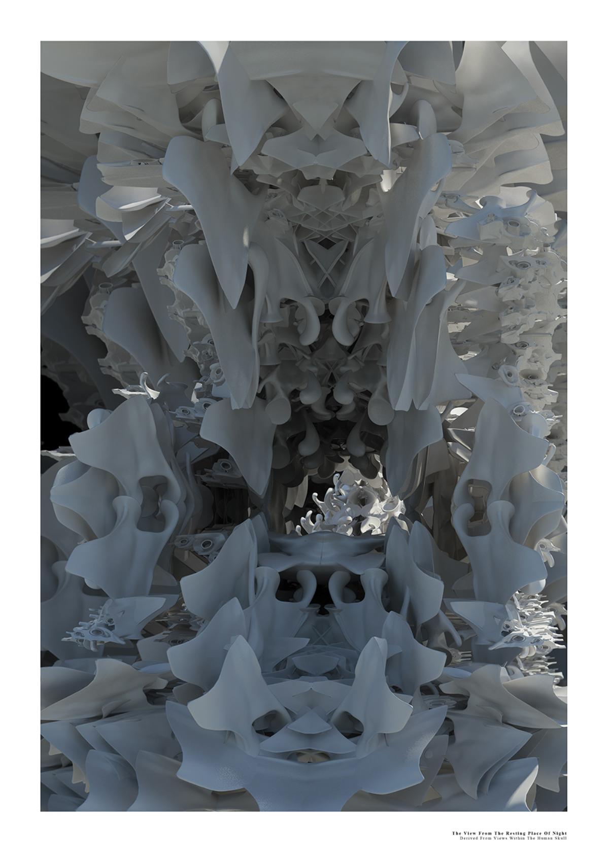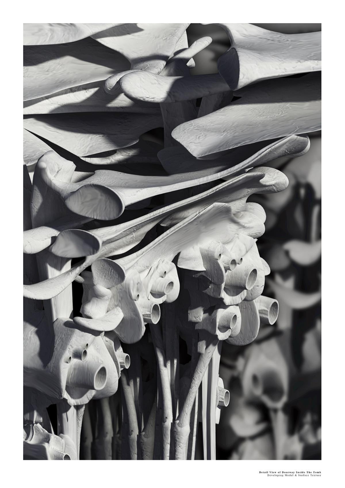 The Fields of Nephilim Part 2 Project 2012 Louise Cann Oxford Brookes University Oxford | UK The project reveals the individual’s eternal virtual identity in the face of the physical fact of death in the 21st Century, in the form of a tomb.The resting places in the tomb connect the individual with the memory of the four allegorical figures, Dawn, Day, Dusk, and Night in Michelangelo’s Medici Chapel in Florence. The form of the four resting places is derived from the poses adopted by the four classical figures. They are placed within a space formed by translucent resin walls of varying thickness, which transmit light in accord with the time of day. The quality of the light matches that existing at the latitude and longitude of Whitby, Yorkshire where Bram Stoker’s Dracula came ashore.The view from the resting places is derived from views within the human skull. The structure that supports the four resting places is based on the construction of the soft tissue of the body, its tendons and muscles. The genesis of the project lies within the contemporary Goth scene, with its elaborate codes of dress, with its emphasis on materials and detail, its theatrical air of gloom, and its poses to portray an identity that is classical in form. In parallel with this was a concern with the contemporary attempts of a family to access the personal digital social network records of a deceased relative.The Nephilim is a Biblical reference to a race of giant angel human hybrids. The spatial experience is that of walking through parts of the body of a Nephilim. The project was thus developed both physically through resin casts and modelling of the human skull, and digitally mapping the soft tissue of the body. The construction of the resting places is of simple variable, detailed, grey ceramic components that slot one into another. The surface material of the resting places are tactile to the fingertips, covered in components that are shaped like computer keys. Tutor(s)Prof Andrew Holmes Declan Molloy