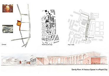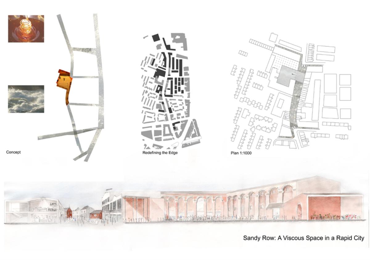 The initial origins of the design come from an urban street strategy devised for Sandy Row. This aimed to create a public space, a node of interaction and exchange. Therefore the conceptual idea of forming a “viscous space” in a rapid city was devised; creating a space where people feel free to spend time and engage with the local community.