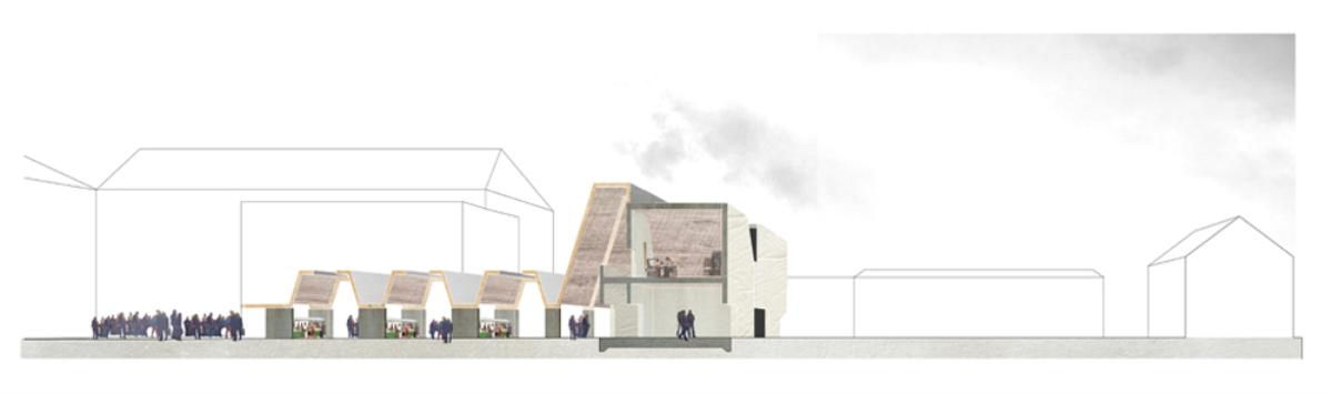 An array of public spaces exist within the scheme : an open air market, exhibition spaces, a sheltered market space and the workshop, all of which aim to make the experience of the workshops less institutional and more a part of the community and spirit of Sandy Row, engrained into the urban fabric of the street.