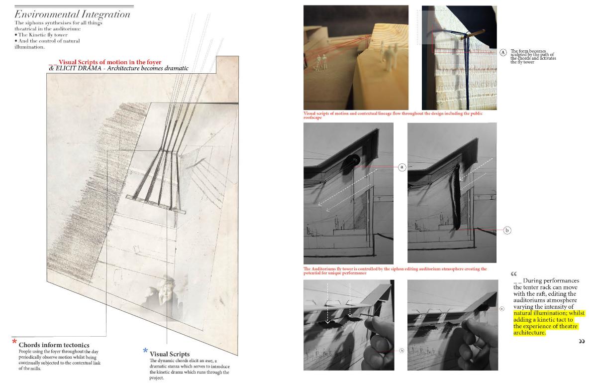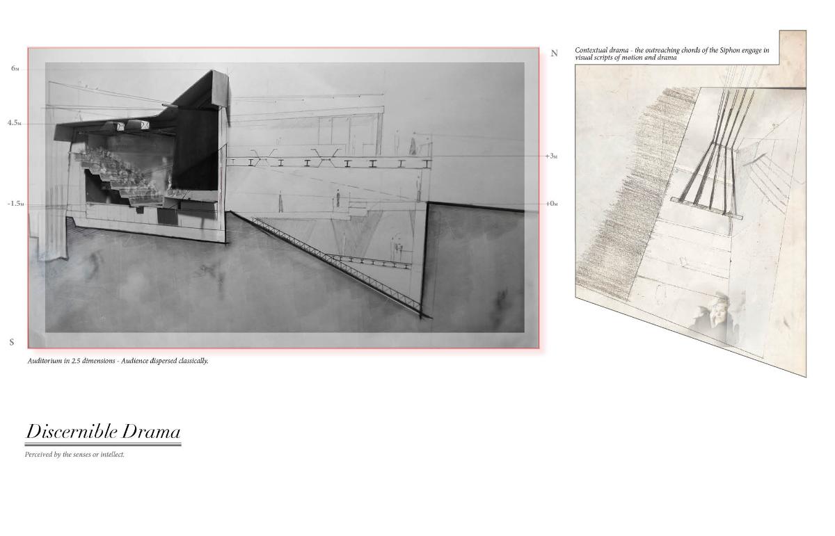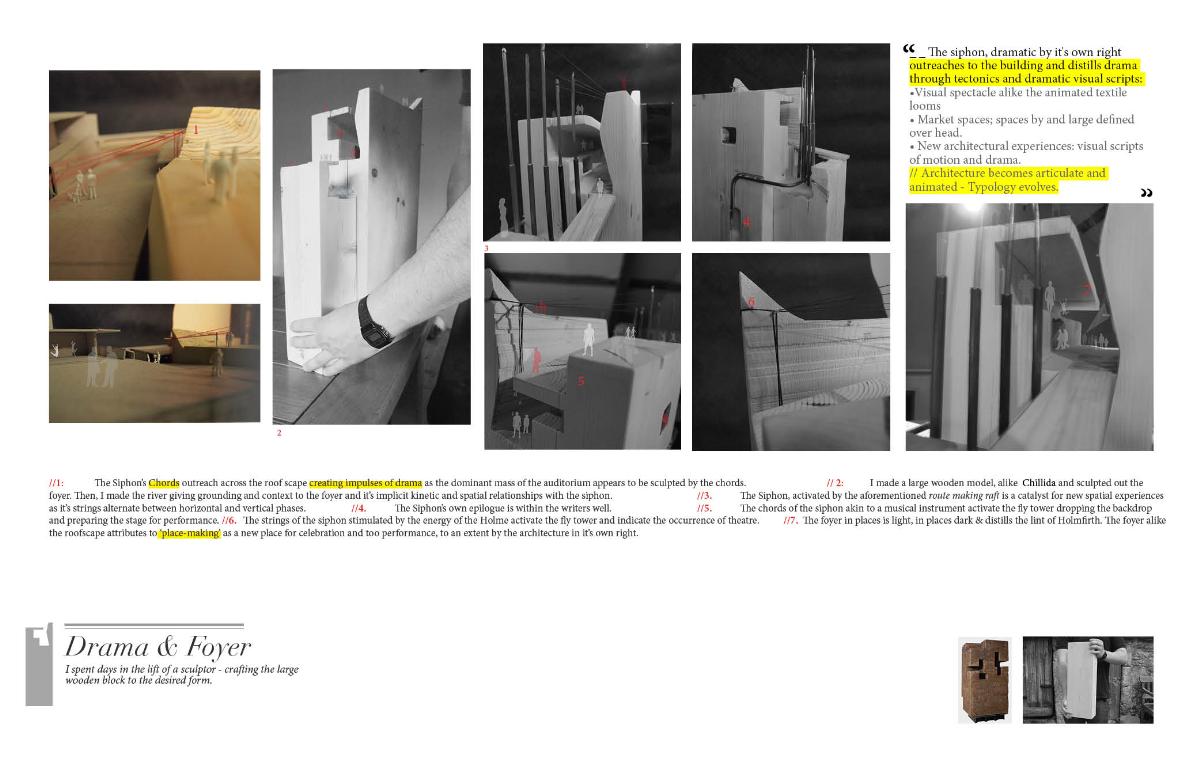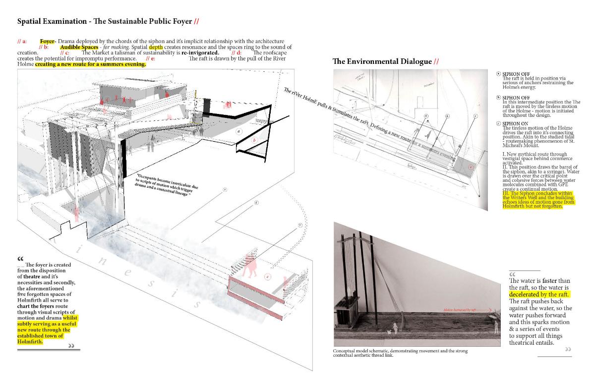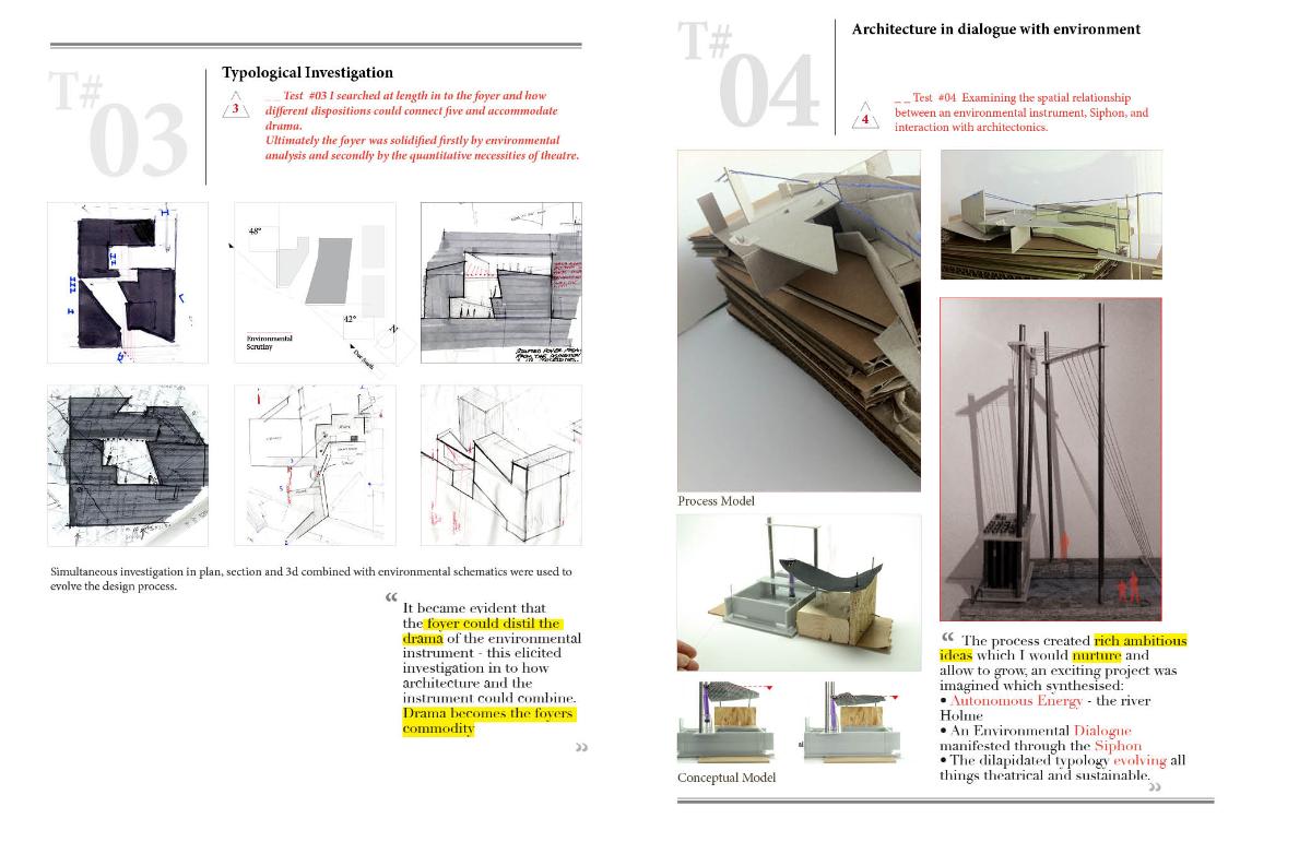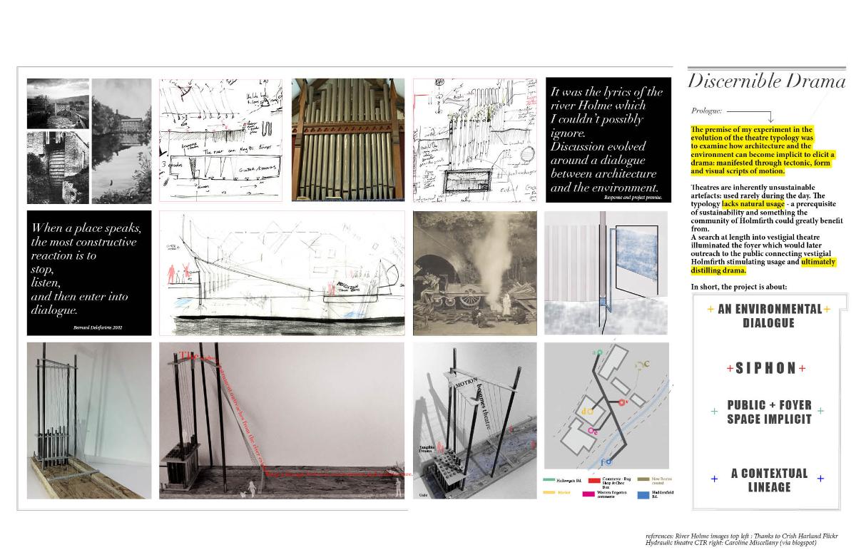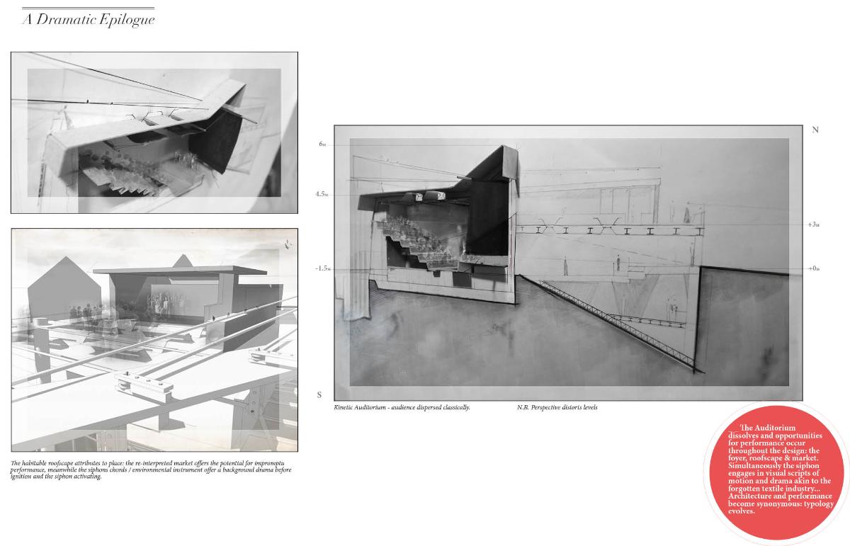 Discernible Drama Part 1 Project 2012 Joe Trevail Sheffield Hallam University | UK The premise of my experiment in the evolution of the theatre typology was to examine how architecture and the environment can become implicit to elicit a drama through: tectonic, form and visual scripts of motion. A dialogue was struck with the environment which I then tested and examined ideas against - the notion of how the building dialogues environmentally became a fascinating entity in the project which I couldn’t possibly ignore.A search at length, inspired by the River Holme and it’s heritage, illuminated the Siphon, it’s motion gave fruit to experiments in how drama can become architectures commodity, ultimately the instrument outreaches and solidifies tectonics as architecture, drama and the environment become synonymous. Theatres are inherently unsustainable artefacts: used rarely during the day. The typology lacks a natural usage - the prerequisite of sustainability and something the community of Holmfirth could greatly benefit from. Simultaneously a typological examination illuminated the foyer which could be utilised for sustainability stimulating natural usage and ultimately, distilling drama!Finally, a Kinetic Auditorium dissolves and impulses of performance occur throughout the design, discernible in the: habitable roofscape, foyer and market as the environmental instrument supports all things theatrical; typology evolves. Tutor(s) Gabriel Tang