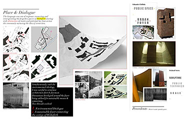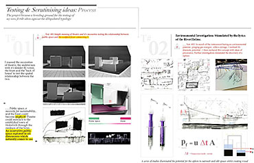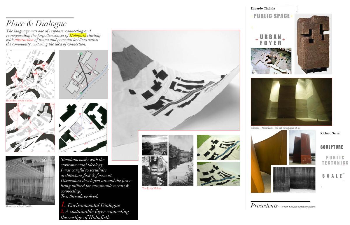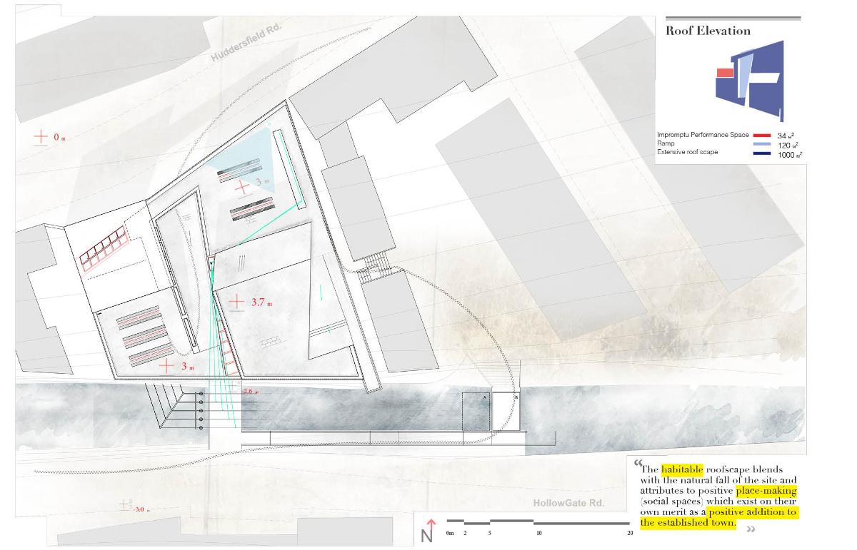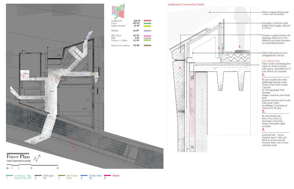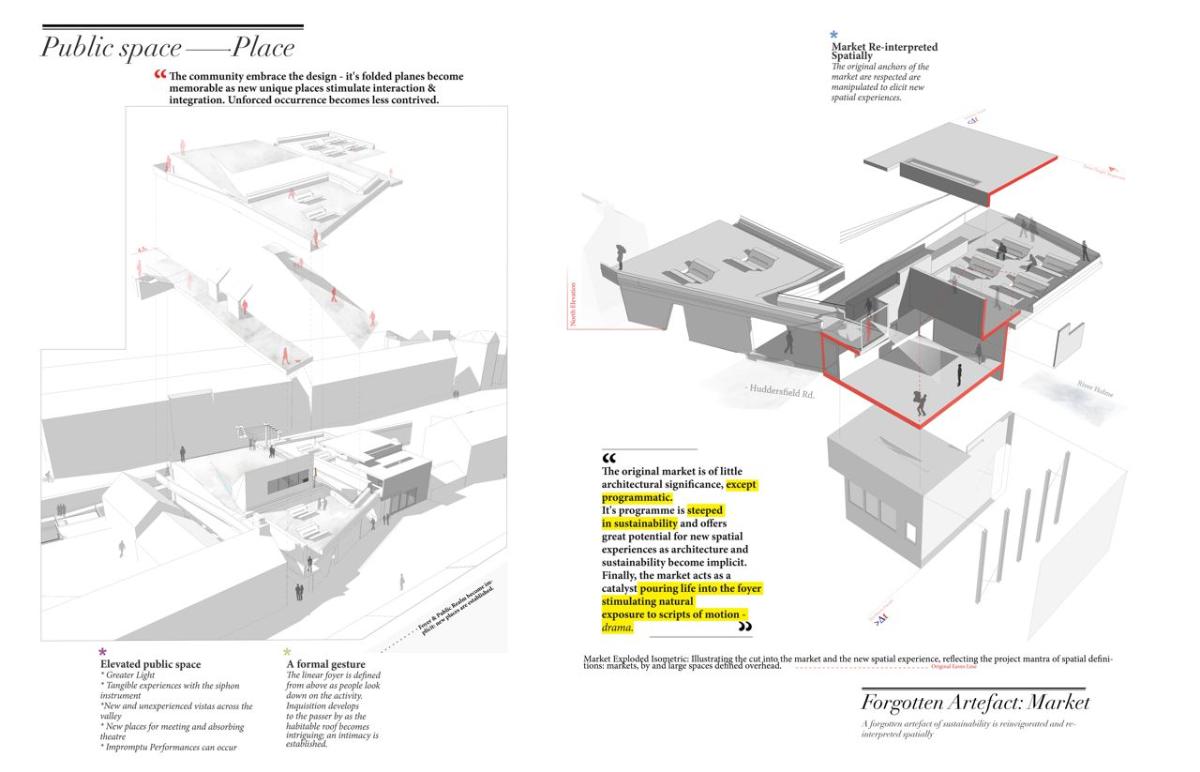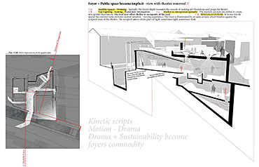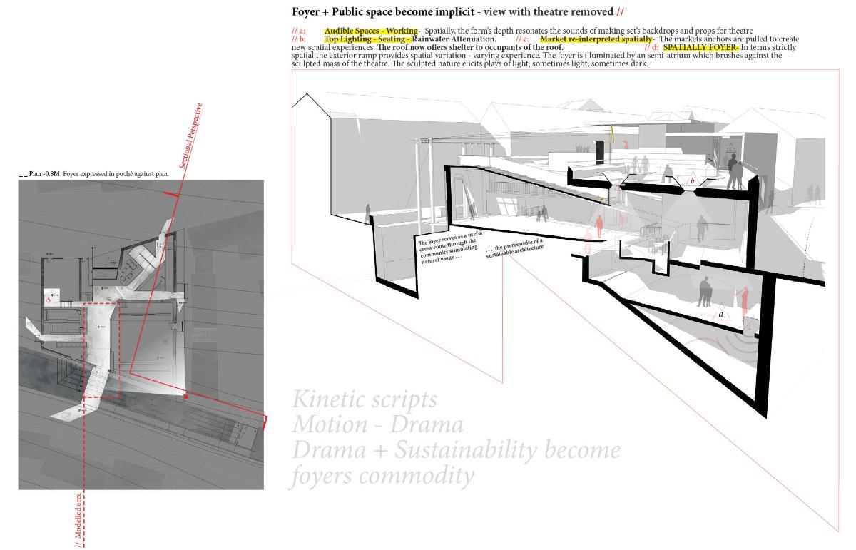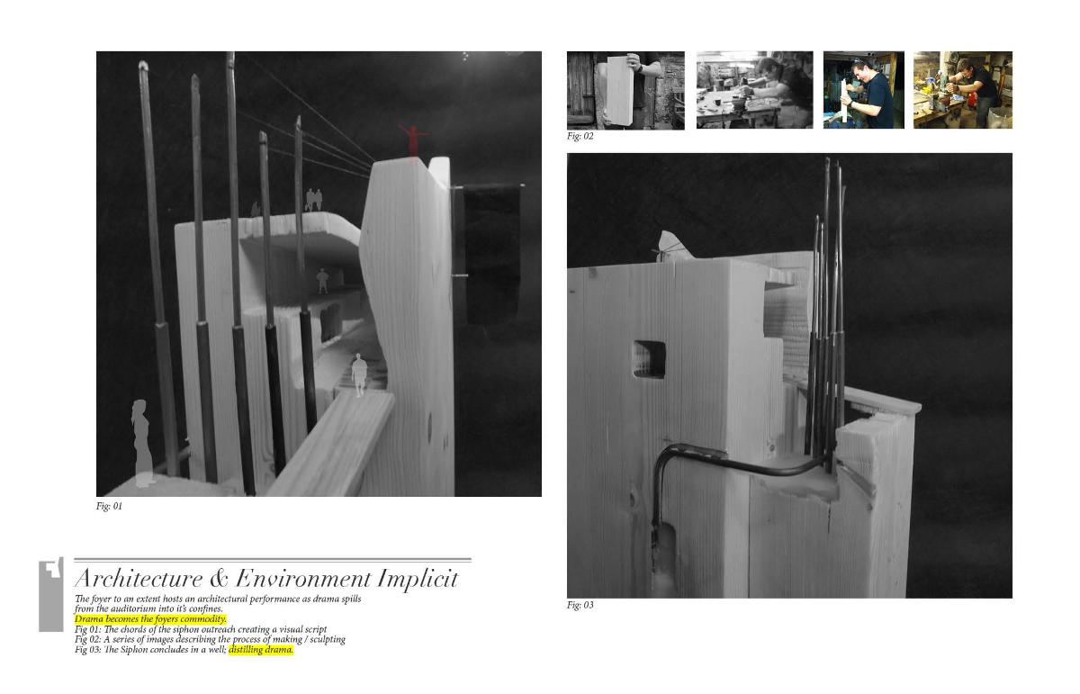 Discernible Drama Part 1 Project 2012 Joe Trevail Sheffield Hallam University | UK The premise of my experiment in the evolution of the theatre typology was to examine how architecture and the environment can become implicit to elicit a drama through: tectonic, form and visual scripts of motion. A dialogue was struck with the environment which I then tested and examined ideas against - the notion of how the building dialogues environmentally became a fascinating entity in the project which I couldn’t possibly ignore.A search at length, inspired by the River Holme and it’s heritage, illuminated the Siphon, it’s motion gave fruit to experiments in how drama can become architectures commodity, ultimately the instrument outreaches and solidifies tectonics as architecture, drama and the environment become synonymous. Theatres are inherently unsustainable artefacts: used rarely during the day. The typology lacks a natural usage - the prerequisite of sustainability and something the community of Holmfirth could greatly benefit from. Simultaneously a typological examination illuminated the foyer which could be utilised for sustainability stimulating natural usage and ultimately, distilling drama!Finally, a Kinetic Auditorium dissolves and impulses of performance occur throughout the design, discernible in the: habitable roofscape, foyer and market as the environmental instrument supports all things theatrical; typology evolves. Tutor(s) Gabriel Tang