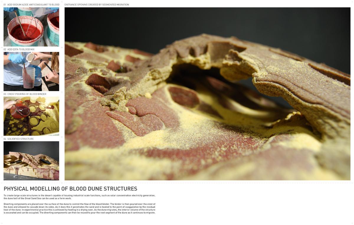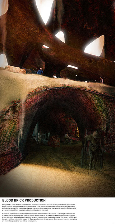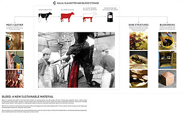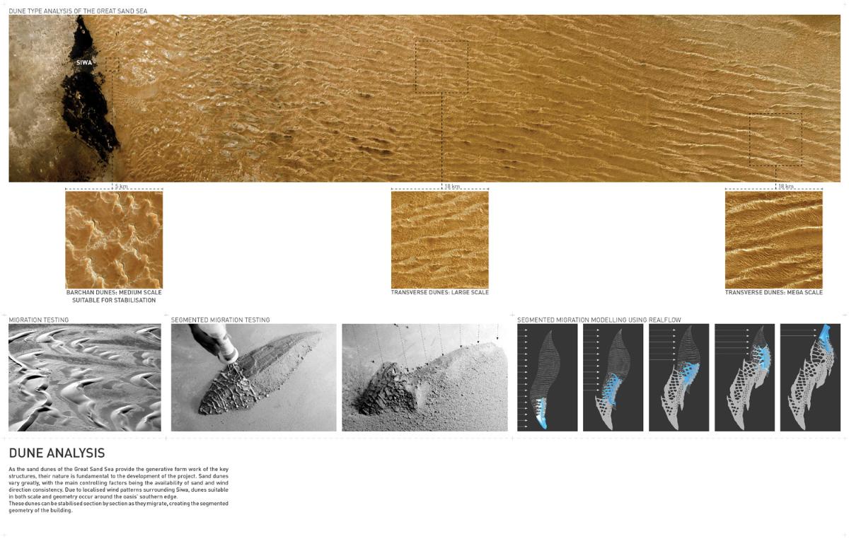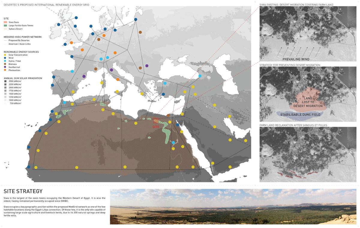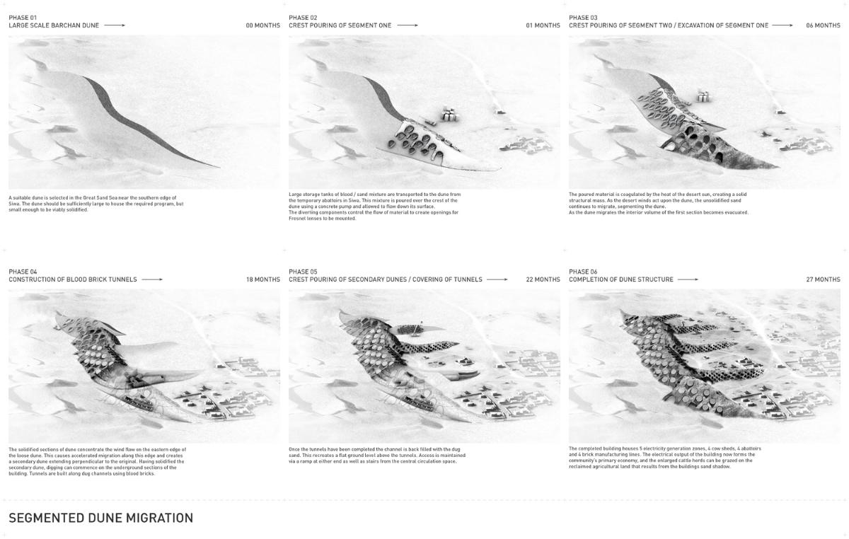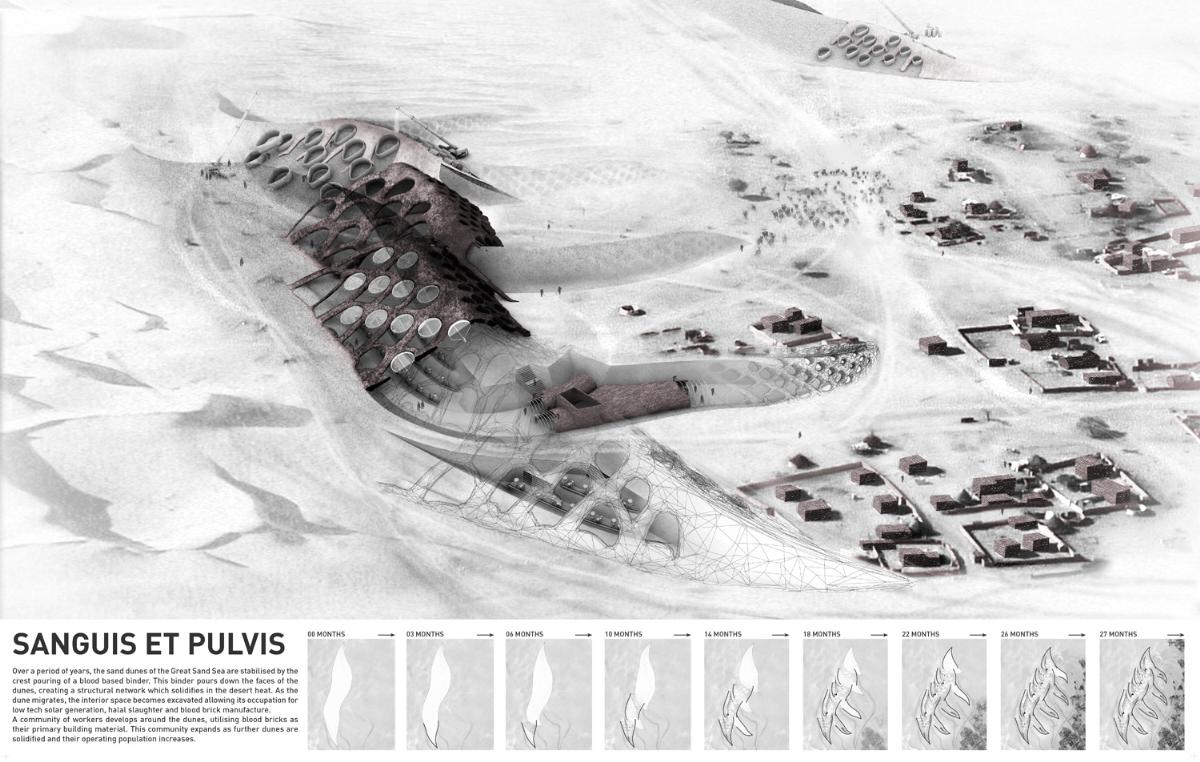 Sanguis Et Pulvis Part 2 Project 2012 Jack Munro University of Westminster London | UK Sanguis et Pulvis seeks to re-establish the dissipating autonomy of the Siwa Oasis in Egypt’s Western Desert. Throughout its history, this Berber settlement has remained isolated and self-sufficient; its traditional economy based on agriculture, its vernacular based on mud brick construction. However, two environmental phenomena have jeopardised this ancient way of life.Firstly, the encroaching sands of the Sahara have significantly reduced the farmable land surrounding Siwa, forcing its economy to focus increasingly on the unreliable and highly seasonal tourism industry. This has greatly eroded the town’s economic and agricultural self-sufficiency.Secondly, a series of rare rainstorms in the 1920s caused catastrophic damage to the town’s historic centre, dissolving the salt rich mud bricks. This destroyed faith in the material on which the town’s vernacular was based despite thousands of years of reliance upon it, leading to a universal adoption of generic concrete structures.Sanguis et Pulvis addresses these issues in three ways:Creating a new local construction material based on slaughtered animal blood.Animal blood is an abundant waste product in North African countries, with each halal slaughtered cow producing around 40 litres of blood. Often incinerated as waste, this material can act as a powerful binding agent for use in construction. This project develops the material as both a method of solidifying sand dunes, and as bricks to re-establish a sustainable local vernacular.Creating a new economic base through the low-tech generation of solar electricity.Desertec is a multi-billion dollar project which aims to create a vast international network of high voltage power lines across Europe and North Africa (MedGrid), linking renewable energy sources capable of supplying 40% of the region’s electricity. This project uses locally constructed Fresnel lens solar concentrators and Stirling engines to generate electricity for sale on international markets, creating a new and stable economic foundation.Enabling large scale agricultural land reclamation.The project slowly creates a barrier protecting Siwa from the Sahara, allowing agricultural land reclamation of up to 14000 acres. This will strengthen the historic agricultural economy of the town, as well as provide the necessary grazing land for increasingly large cattle herds. Tutor(s) Toby Burgess Arthur Mamou-Mani