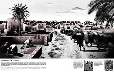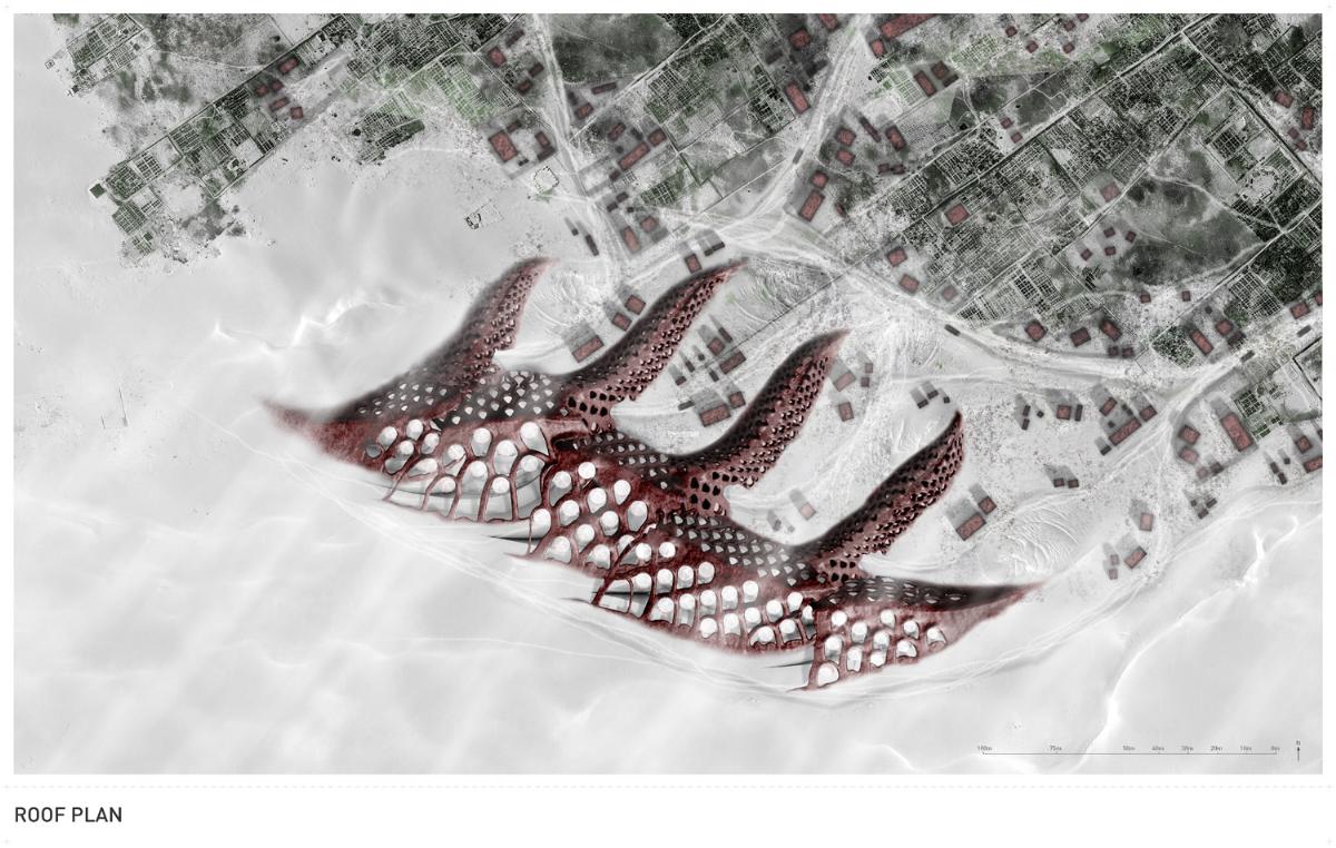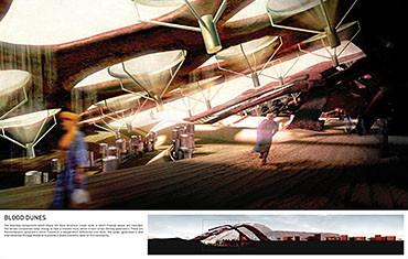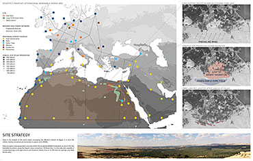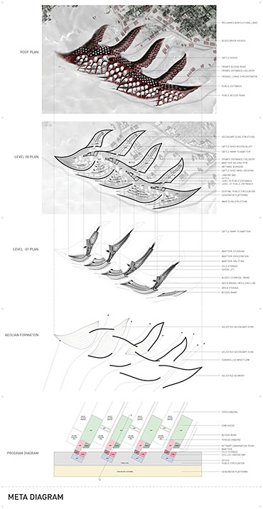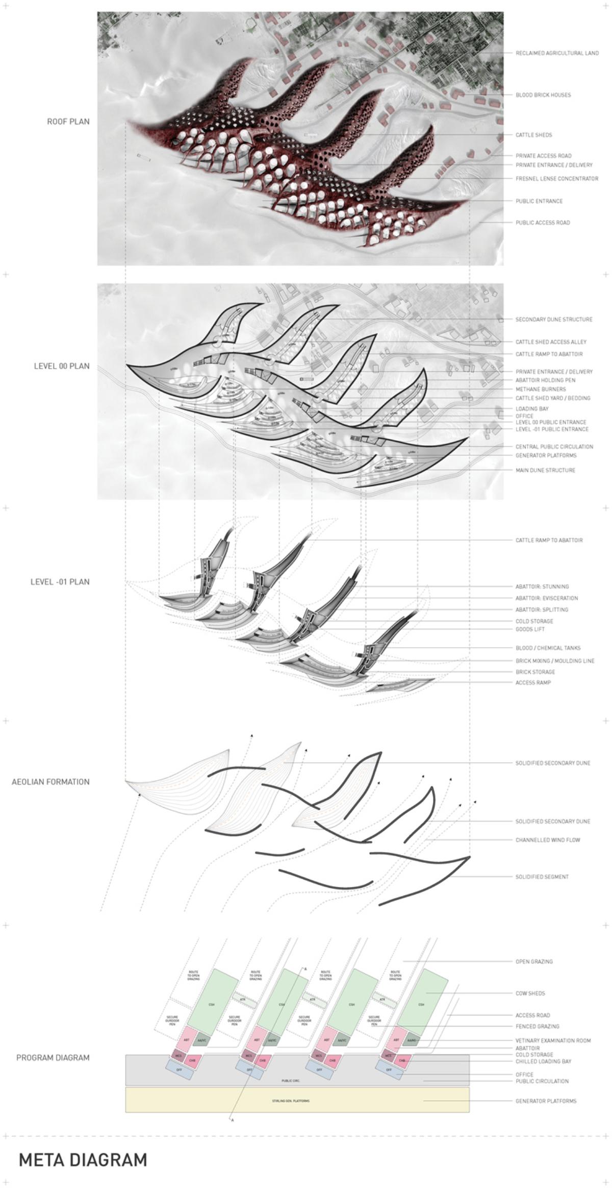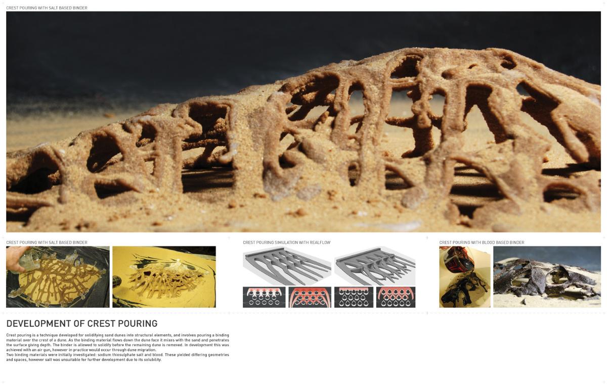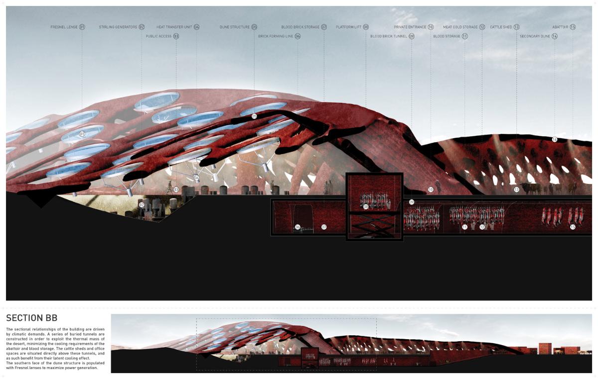 Sanguis Et Pulvis Part 2 Project 2012 Jack Munro University of Westminster London | UK Sanguis et Pulvis seeks to re-establish the dissipating autonomy of the Siwa Oasis in Egypt’s Western Desert. Throughout its history, this Berber settlement has remained isolated and self-sufficient; its traditional economy based on agriculture, its vernacular based on mud brick construction. However, two environmental phenomena have jeopardised this ancient way of life.Firstly, the encroaching sands of the Sahara have significantly reduced the farmable land surrounding Siwa, forcing its economy to focus increasingly on the unreliable and highly seasonal tourism industry. This has greatly eroded the town’s economic and agricultural self-sufficiency.Secondly, a series of rare rainstorms in the 1920s caused catastrophic damage to the town’s historic centre, dissolving the salt rich mud bricks. This destroyed faith in the material on which the town’s vernacular was based despite thousands of years of reliance upon it, leading to a universal adoption of generic concrete structures.Sanguis et Pulvis addresses these issues in three ways:Creating a new local construction material based on slaughtered animal blood.Animal blood is an abundant waste product in North African countries, with each halal slaughtered cow producing around 40 litres of blood. Often incinerated as waste, this material can act as a powerful binding agent for use in construction. This project develops the material as both a method of solidifying sand dunes, and as bricks to re-establish a sustainable local vernacular.Creating a new economic base through the low-tech generation of solar electricity.Desertec is a multi-billion dollar project which aims to create a vast international network of high voltage power lines across Europe and North Africa (MedGrid), linking renewable energy sources capable of supplying 40% of the region’s electricity. This project uses locally constructed Fresnel lens solar concentrators and Stirling engines to generate electricity for sale on international markets, creating a new and stable economic foundation.Enabling large scale agricultural land reclamation.The project slowly creates a barrier protecting Siwa from the Sahara, allowing agricultural land reclamation of up to 14000 acres. This will strengthen the historic agricultural economy of the town, as well as provide the necessary grazing land for increasingly large cattle herds. Tutor(s) Toby Burgess Arthur Mamou-Mani