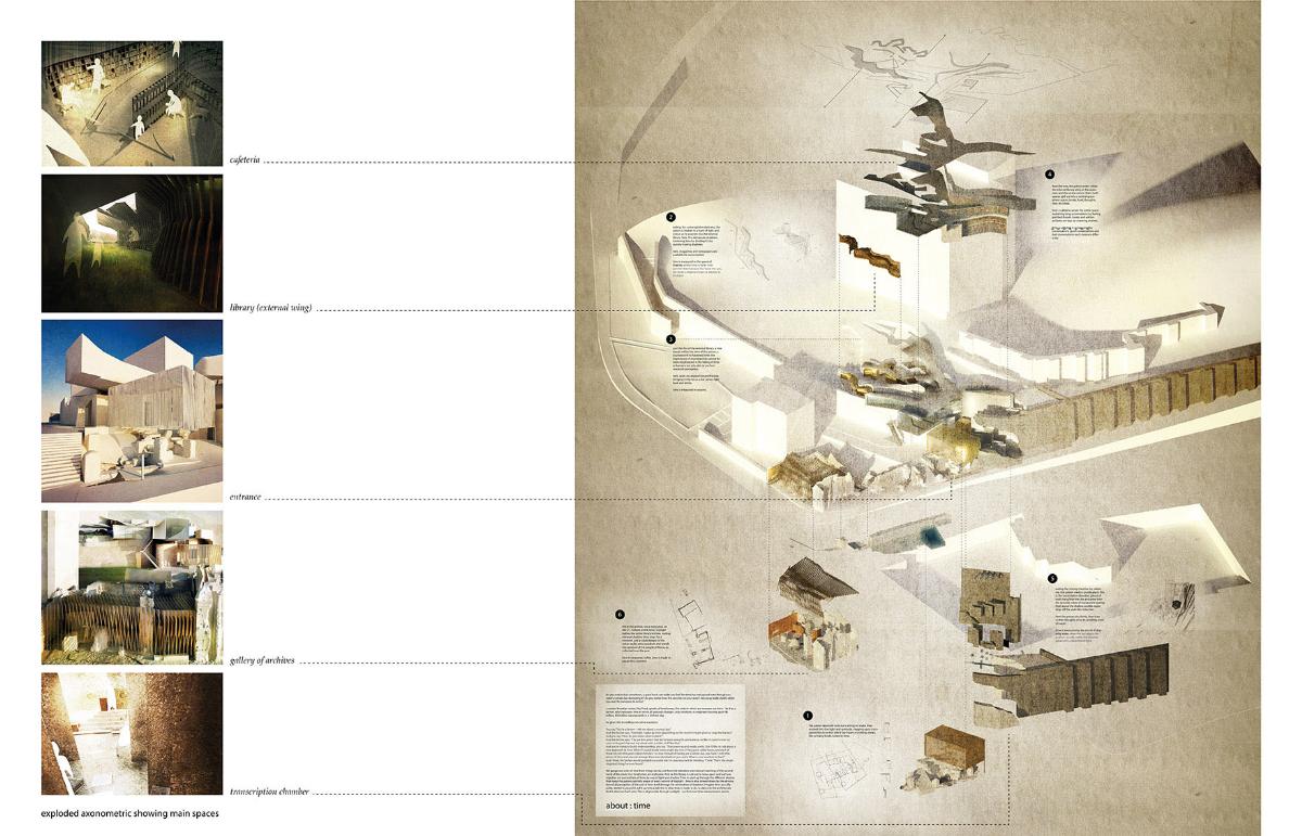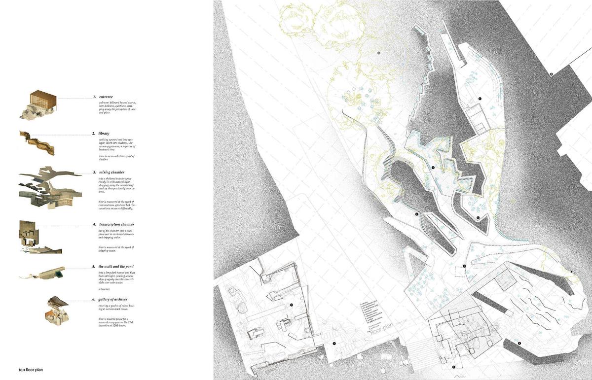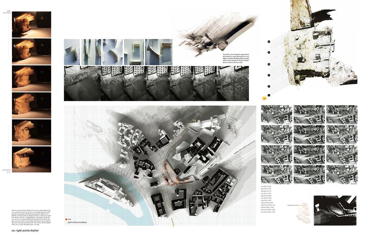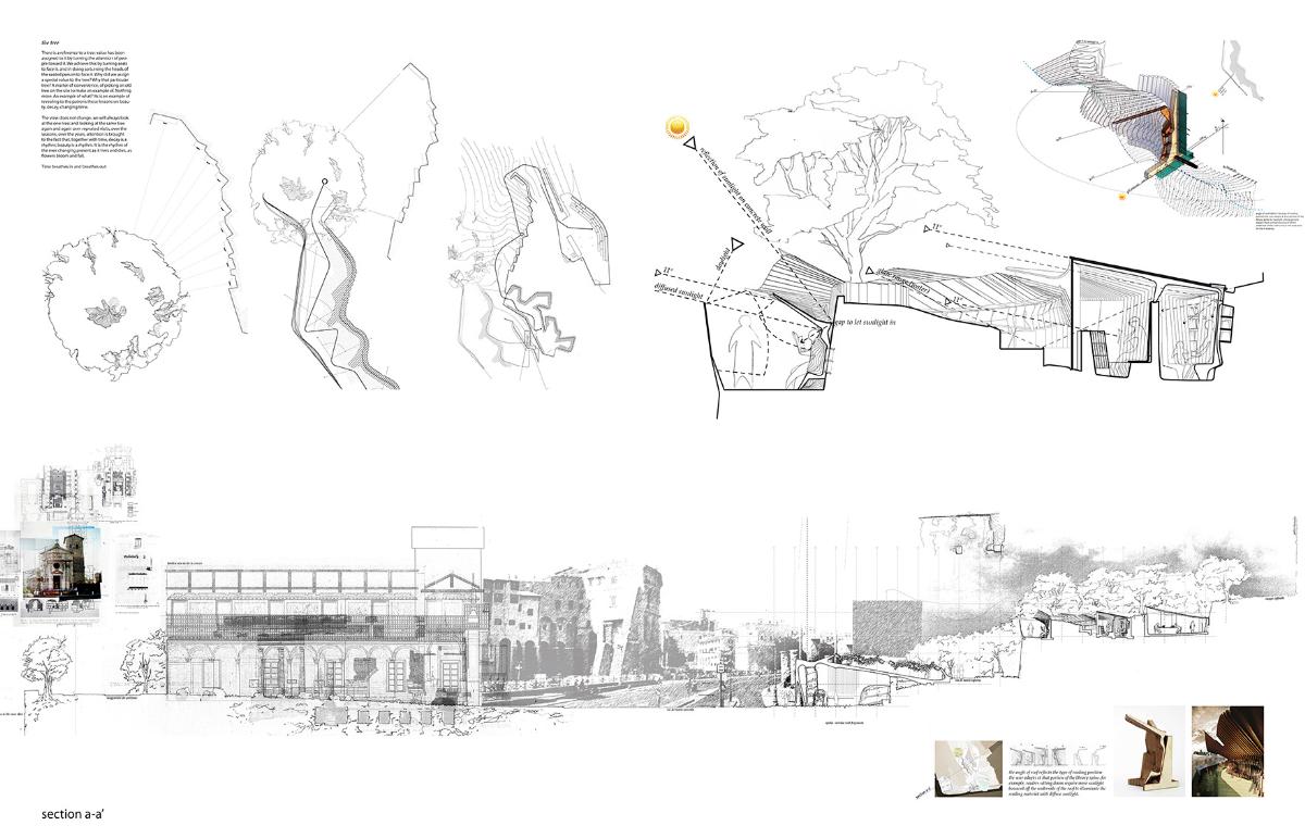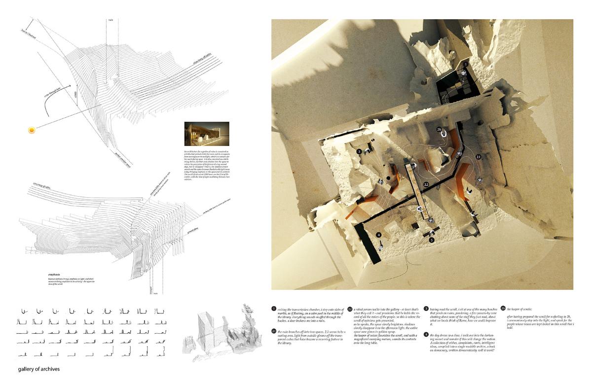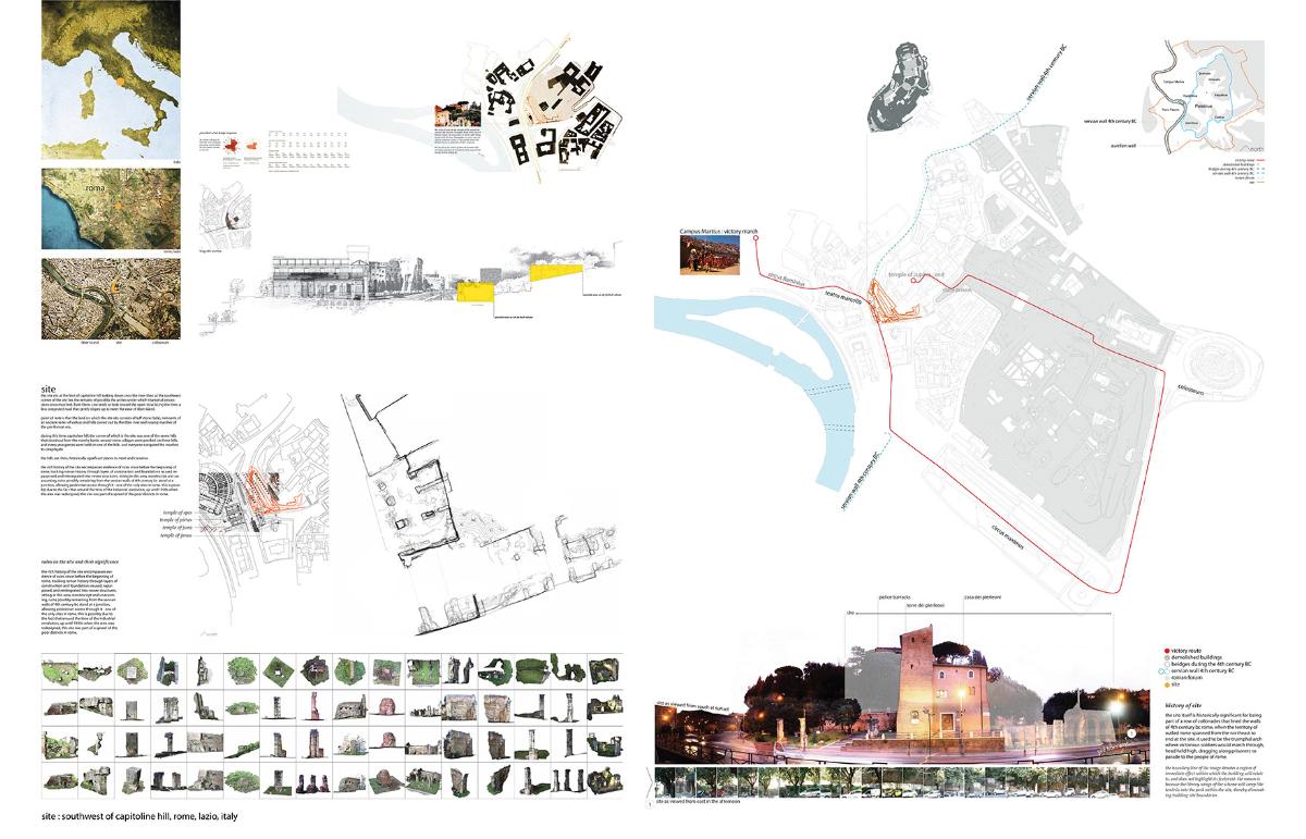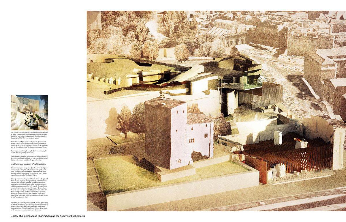 Library of Alignment & Illumination and the Archive of Public Voices Part 1 Project 2012 Li Qun Tang Oxford Brookes University Oxford | UK The scheme is a reaction to the public demonstrations of Rome, caused by the communication disconnect between the Italian government and its people. Nestled at the foot of Capitoline Hill, Rome, next to a police barracks and close to several government buildings, the project is envisioned as a headquarters for the democratic voices of the people of Rome: augmenting the patrons’ opinions with discussion, facts and sense of gravity; so that their opinions carry weight and enable coherent discussions and debates. Architecture as condenser of public opinion. Using elements of sunlight and shadow to manipulate the patron’s perception of time, the scheme actively engages in augmenting the rituals of reading, debating, and writing, that the local Roman populace perform on their journey toward the formation of refined opinions. The scheme is a library and an archive sitting within an existing public park and ruins. Spatial sequences weave in and out of the park, creating transitional spaces that form symbiotic relationships with it. Where the journey encounters a ruin, it converses with them, speaking of ideas of time. Sunlight and shadow reinforce different sensations of time along the patron’s journey: teasing out time through the elimination of time’s visual cues, or compressing the sensation of time by introducing quick-moving shadows. Guided through a library, the patron assimilates/reinforces opinions through reading, then moves toward a public speaking podium, then a cafeteria – both serving to pit ideas against others through discussion and argument – a throwback to the ancient Roman typology of the Forum. The patron, having tested and refined his/her opinion, enters the transcription chamber, where they are penned into physical reality. Once a year, the alignment of the sun coincides with the precise alignment of the architectural elements and contoured geometry of the scheme. At this point, time is made to ‘pause’ while the Keeper of the Voices performs the ritual of reading aloud and displaying these accumulated voices of democracy. Architecture serves in guiding, condensing these experiences through the element of time through sunlight and shadow, almost acting as a machine for generating a constantly reiterated and updated manual for democracy. Tutor(s) Ben Cowd Sara Shafiei