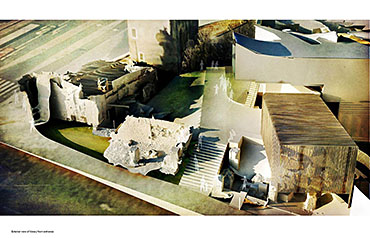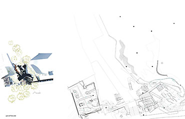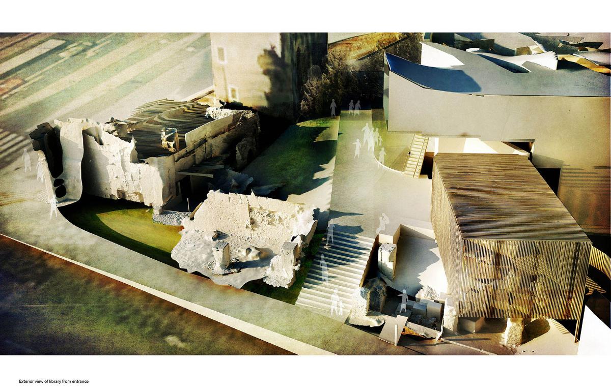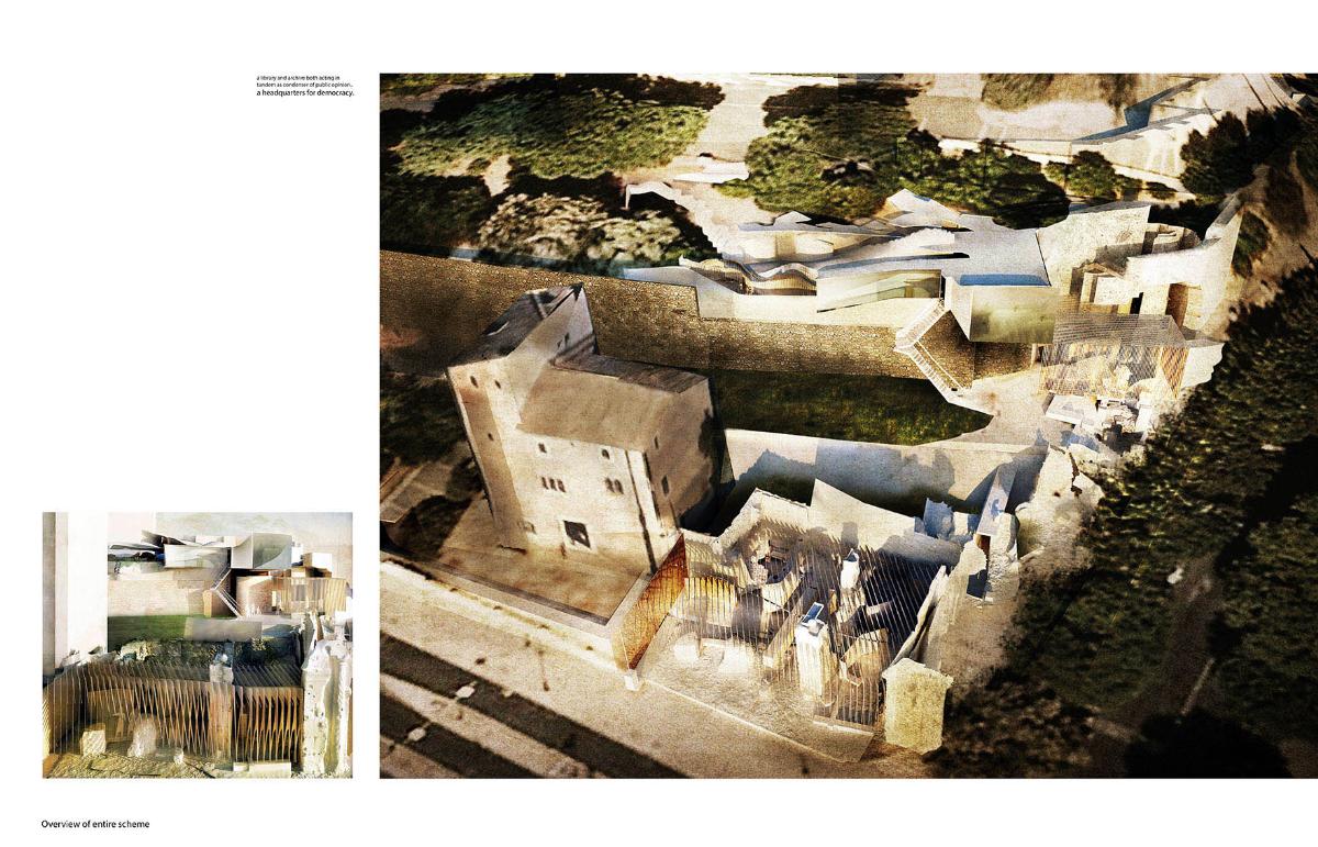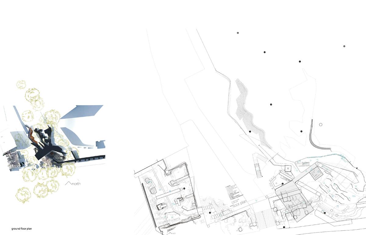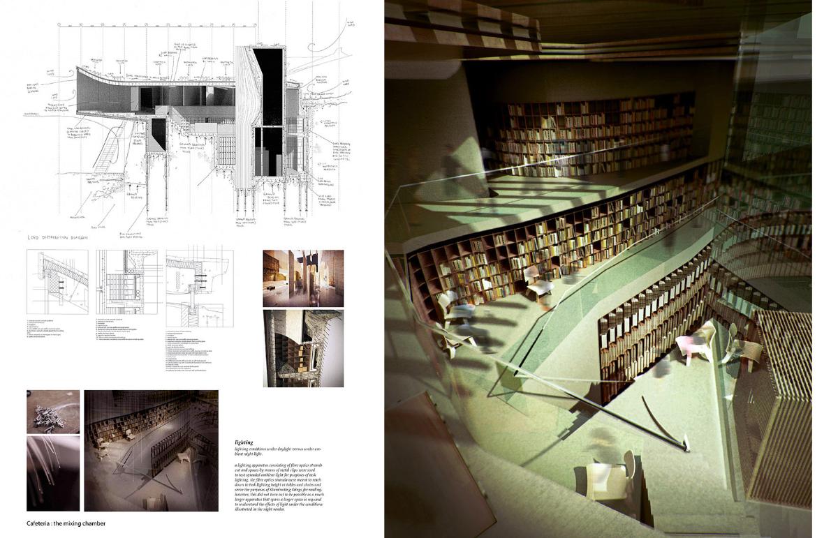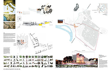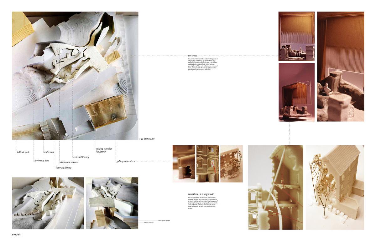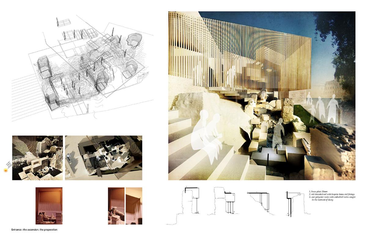 Library of Alignment & Illumination and the Archive of Public Voices Part 1 Project 2012 Li Qun Tang Oxford Brookes University Oxford | UK The scheme is a reaction to the public demonstrations of Rome, caused by the communication disconnect between the Italian government and its people. Nestled at the foot of Capitoline Hill, Rome, next to a police barracks and close to several government buildings, the project is envisioned as a headquarters for the democratic voices of the people of Rome: augmenting the patrons’ opinions with discussion, facts and sense of gravity; so that their opinions carry weight and enable coherent discussions and debates. Architecture as condenser of public opinion. Using elements of sunlight and shadow to manipulate the patron’s perception of time, the scheme actively engages in augmenting the rituals of reading, debating, and writing, that the local Roman populace perform on their journey toward the formation of refined opinions. The scheme is a library and an archive sitting within an existing public park and ruins. Spatial sequences weave in and out of the park, creating transitional spaces that form symbiotic relationships with it. Where the journey encounters a ruin, it converses with them, speaking of ideas of time. Sunlight and shadow reinforce different sensations of time along the patron’s journey: teasing out time through the elimination of time’s visual cues, or compressing the sensation of time by introducing quick-moving shadows. Guided through a library, the patron assimilates/reinforces opinions through reading, then moves toward a public speaking podium, then a cafeteria – both serving to pit ideas against others through discussion and argument – a throwback to the ancient Roman typology of the Forum. The patron, having tested and refined his/her opinion, enters the transcription chamber, where they are penned into physical reality. Once a year, the alignment of the sun coincides with the precise alignment of the architectural elements and contoured geometry of the scheme. At this point, time is made to ‘pause’ while the Keeper of the Voices performs the ritual of reading aloud and displaying these accumulated voices of democracy. Architecture serves in guiding, condensing these experiences through the element of time through sunlight and shadow, almost acting as a machine for generating a constantly reiterated and updated manual for democracy. Tutor(s) Ben Cowd Sara Shafiei