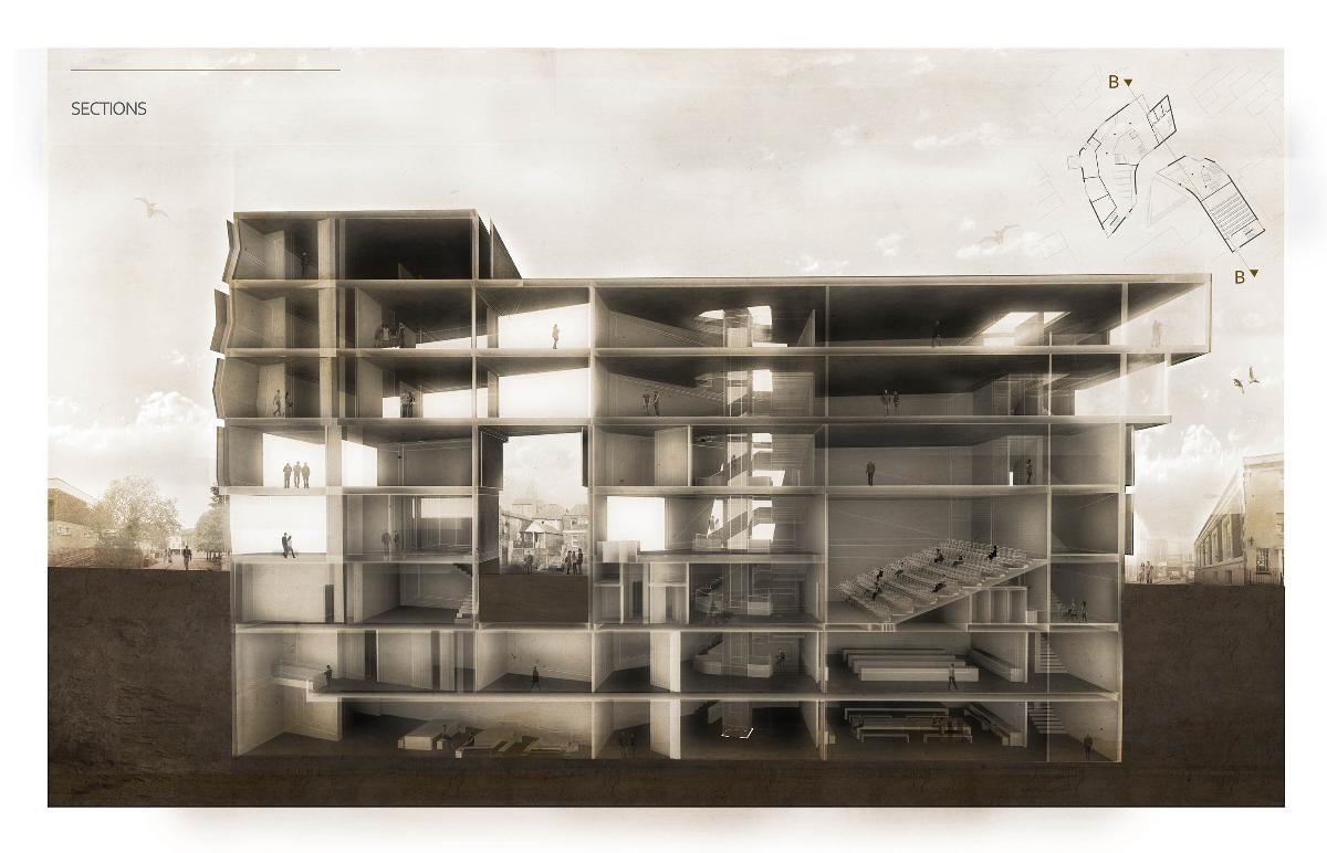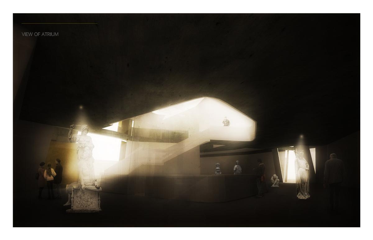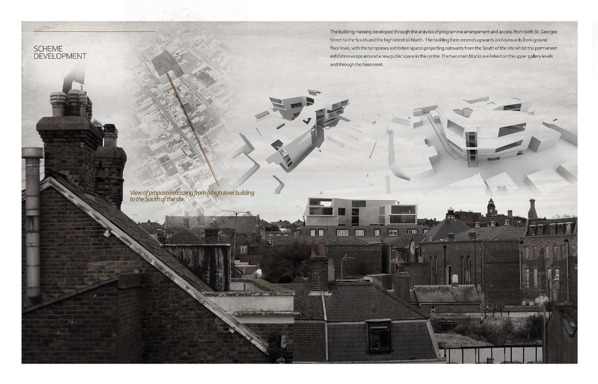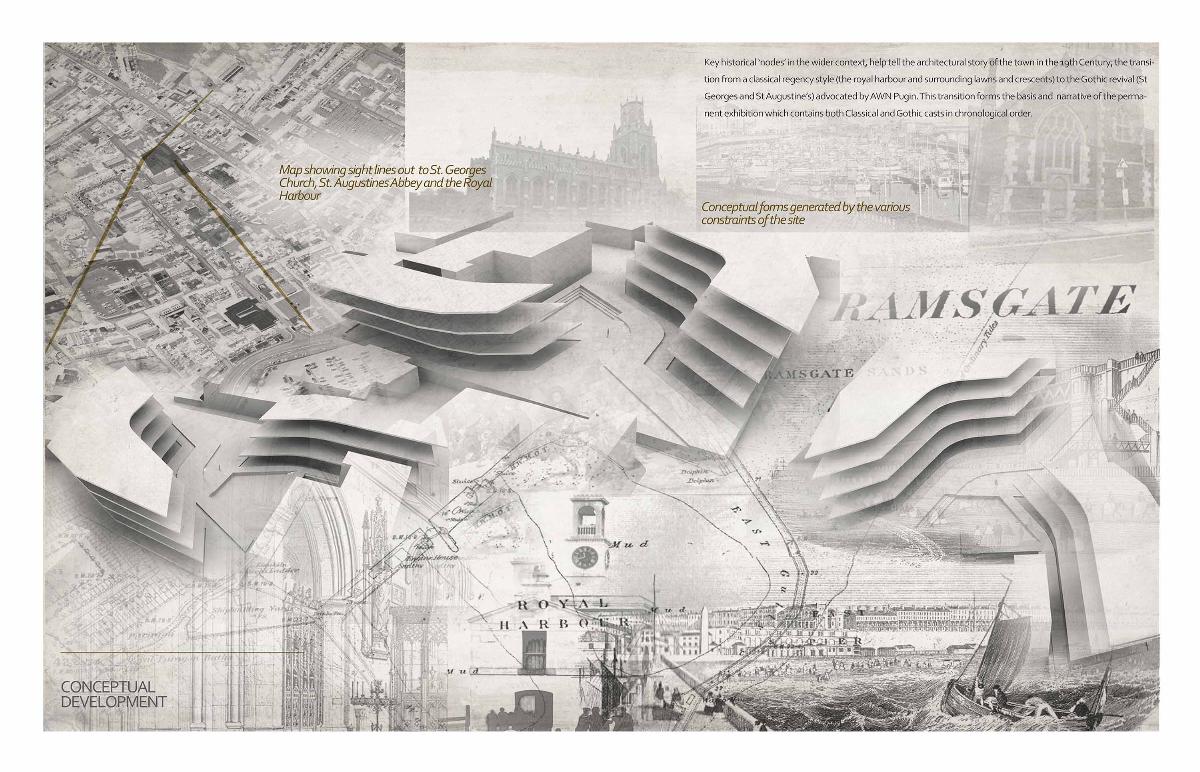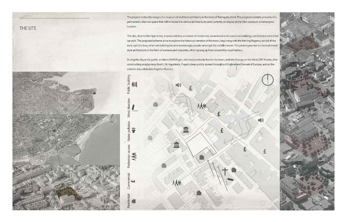 Museum of Architectural History, Ramsgate Part 1 Project 2012 Oliver Treves University of Kent | UK The project invites the design of a museum of architectural history, to house the architectural casts currently on display in the Victoria and Albert Museum. The site is located in the town of Ramsgate, on the North Kent coast, occupying a rectilinear area of approximately 1,800m², which sits adjacent to the town high street, surrounded by a mixture of residential, commercial and public buildings.Ramsgate was one of the great sea bathing towns of the 19th Century, and adopted classical revival Regency architecture in the form of terraces and crescents, like many of the other prosperous costal towns of the period. During the 1840’s, the gothic revival architect AWN Pugin who had previously lived in the town, built a house, ‘The Grange’, on the West Cliff. Shortly after constructing an adjoining church, St. Agustine’s, Pugin’s new ideas about domestic and ecclesiastical architecture spread throughout Britain and beyond. The new museum is intended to be a regenerative cultural centre in the heart of the town, where the narrative of the main exhibition charts the architectural history of Ramsgate, from the classical revival to the gothic revival. The casts from the Victoria and Albert Museum provide a reference to original classical and gothic architecture, which in turn provided the inspiration for the developing architectural language in 19th Century Ramsgate. The transformative narrative of the museum is further explored in the buildings’ response to context. Prescribed views out of the high-level gallery spaces to key historical ‘nodes’ in the wider landscape, such as The Royal Harbour and St. Augustine’s church, offer visual references to the buildings which are significant in the architectural story of Ramsgate. As well as the main gallery space, appealing to tourists and visitors, the building programme is primarily community focused. A library, auditorium, seminar rooms, workshops and a temporary exhibition space are all intended to be engaging for the wider public, in an educational environment. Tutor(s) Dr. Timothy Brittain-Catlin