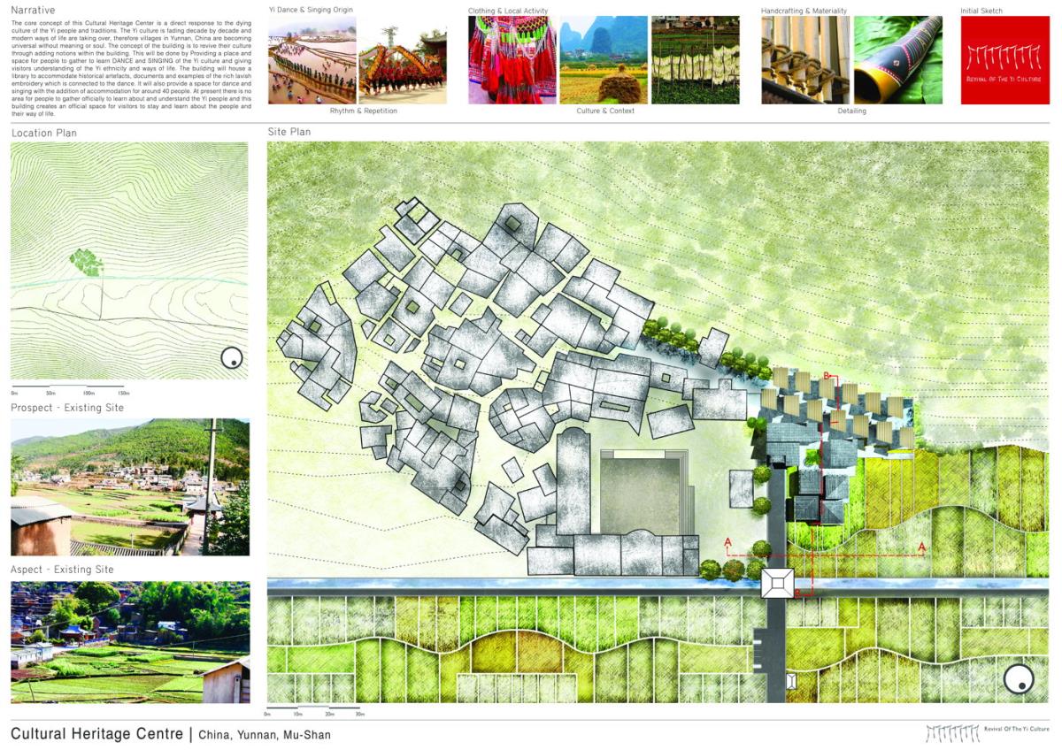 Cultural Heritage Centre, Mu Shan, China Part 1 Project 2013 Waqar Hussain University of Huddersfield | UK The core concept behind the design of the proposed Cultural Heritage Centre in Mou-Shan Village is to encapsulate and preserve elements of the dying culture and traditions of the Yi people. One of the famous characteristics of the Yi tribe is dancing and singing in unison, with the same clothing creating a strong harmony. Regrettably, Yi culture is fading decade by decade and modern ways of life are taking over, therefore villages in Yunnan China are becoming universal without meaning or soul. The ideas behind the buildings are to revive and preserve the Yi culture through adding narratives within the building design. The proposed building will be providing a place for people to gather, learn the dance and singing of the Yi culture and give visitors an understanding of the Yi ethnicity, history of the tribe and ways of life. The building will integrate the local handcrafting skills and materials such as bamboo, mud brick and natural stone. The building will house a library to accommodate historical artefacts, documents and examples of the rich lavish embroidery, which is connected directly to the Yi dance traditions. It will also provide a space for dance and singing, additionally it will provide accommodation for around 40 people. The form and arrangement of the Cultural Heritage Centre building is intended to create rhythm and repetition, which correlates to the patterns used by the Yi tribe through their work, performances and dress; the Yi tribe members traditionally dress the same. The fabric of the buildings shows the importance of handcrafting within the Yi tribe and reflects the lavish clothing they wear, which is represented by the colourful bamboo rain screen. The building is made from locally sourced materials. The building will bring a positive impact on the local economy bringing much needed financial boost to the local economy along with a sense of ownership. This will make the centre more sustainable in the long term. Ultimately, this project is intended to preserve for the future generations some elements of the Yi tribe and something for them to be proud of! Tutor(s) Vijay Taheem