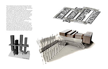 The programme is for a new Contemporary Institute of Culture (CIC) which aims to contextualise the Social History of Belfast: old and new, by questioning how such things as ‘Conflict’ can be set with other strands such as ‘Creativity’ and ‘The Contemporary’. These parallel strands of geological volumes create different encounters and dilemmas for the displays and exhibitions. These four vessels, carved conceptually from the surrounding mountains are interwoven and made sense of by a fifth gallery which like a city walk enfolds and holds the other pieces. This fifth gallery and ambulatory connects the building back to both the park and city landscape as a panoramic promenade.