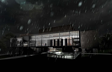 The materiality of the project is informed by the material of the city’s landscape. Carved from stone, the main volumes are held aloft by slender concrete feet which act like trees while the shimmering horizontal sea of the fifth gallery floats to demarcate a space and shadow. The illusion of the floating halo of the promenade at night, illuminates the park at the centre of this new cultural landscape.
