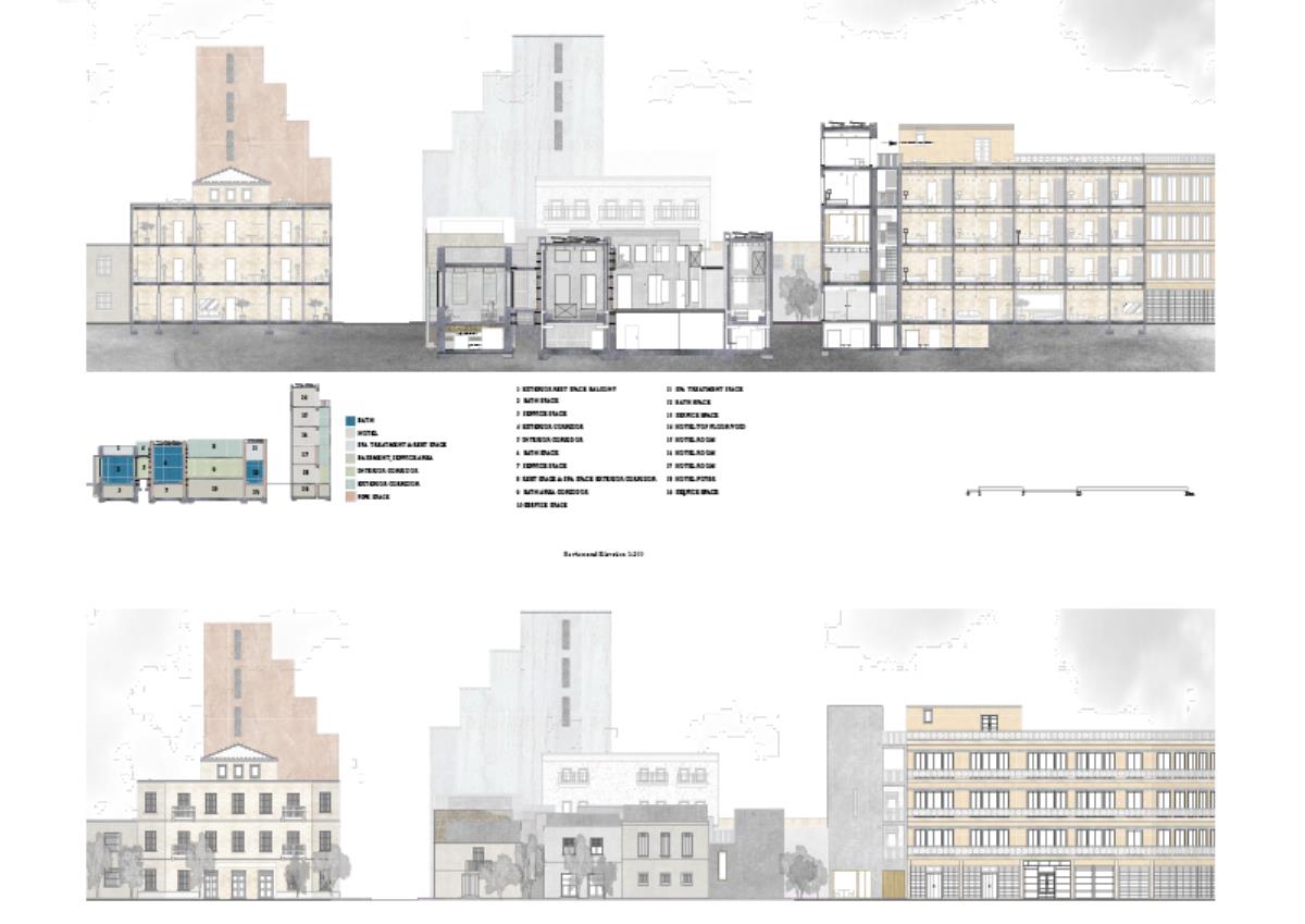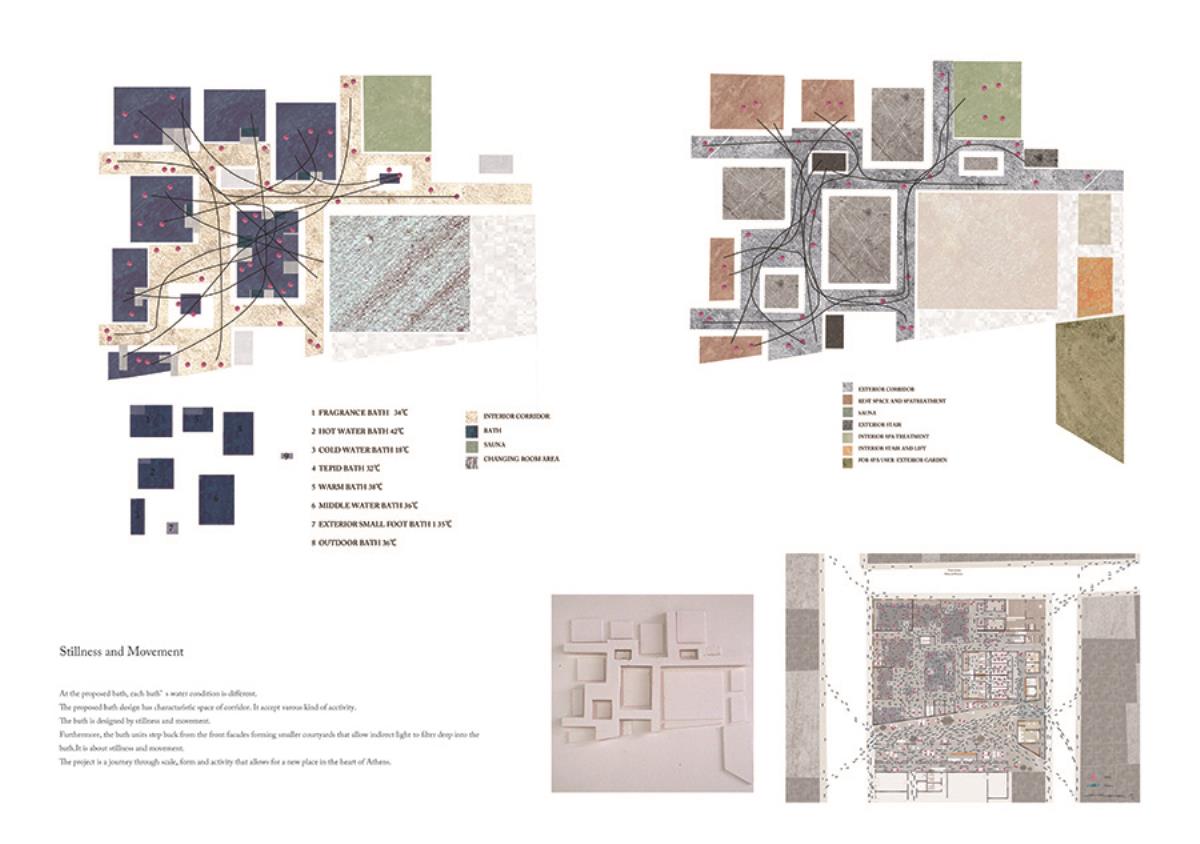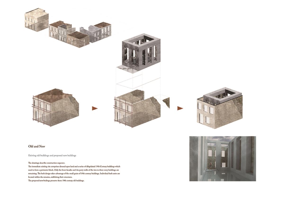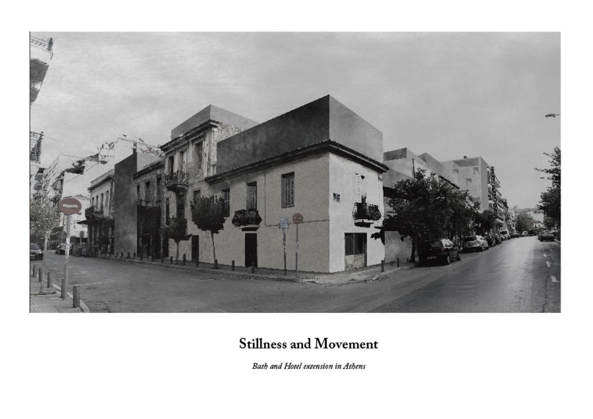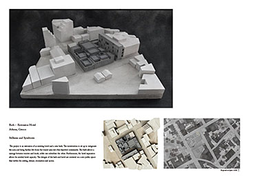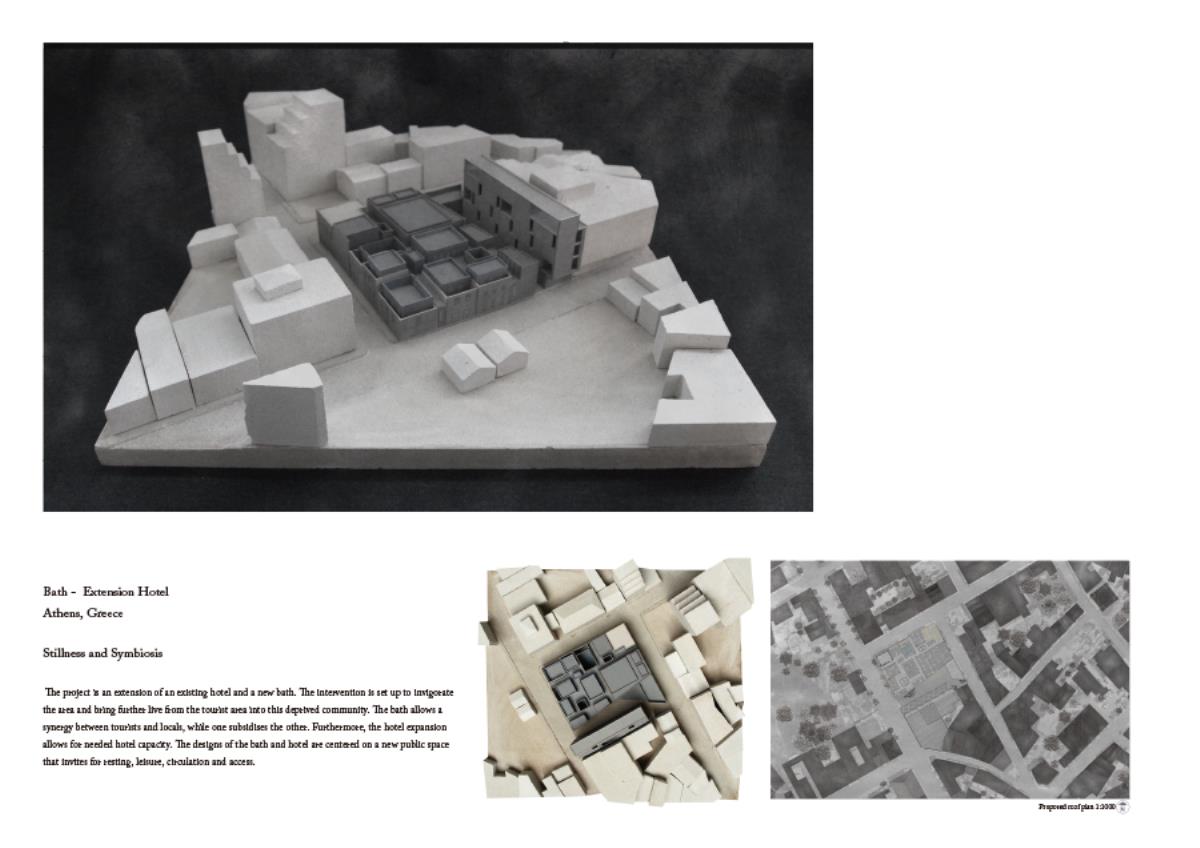 Stillness and Movement: Bath and Hotel Extension in Athens Part 2 Project 2013 Shoji Tamura University of East London London | UK The project is an extension of an existing hotel and a new bath. It is located between a deprived community and a tourist area in the North of the Acropolis. The immediate existing site comprises disused open land and a series of dilapidated 19th Century buildings that used to form a perimeter block. Only the front facades and the party walls of the two to three story buildings are remaining. The existing hotel borders onto the site with a large party wall, from the south.The intervention is set up to invigorate the area and bring further live from the tourist area into this deprived community. The bath allows a synergy between tourists and locals, while one subsidizes the other. Furthermore, the hotel expansion allows for needed hotel capacity. The designs of the bath and hotel are centered on a new public space that invites for resting, leisure, circulation and access.The bath design takes advantage of the small grain of 19th century buildings. Individual bath units are located within the remains, stabilizing their structures. Furthermore, the bath units step back from the front facades forming smaller courtyards that allow indirect light to filter deep into the bath. It is about stillness and movement. The upper floors form a new roofscape that is a play of former plot tectonics.On the ground floor, the hotel opens with a café onto the newly formed public space, further invigorating public live and blurring crucial boundaries between inside and outside. On the upper levels, the hotel is an extension of the party wall condition. Rooms gain privacy and indirect light through internal balconies.The project is a journey through scale, form and activity that allows for a new place in the heart of Athens. Tutor(s) Christopher Hadrys