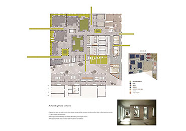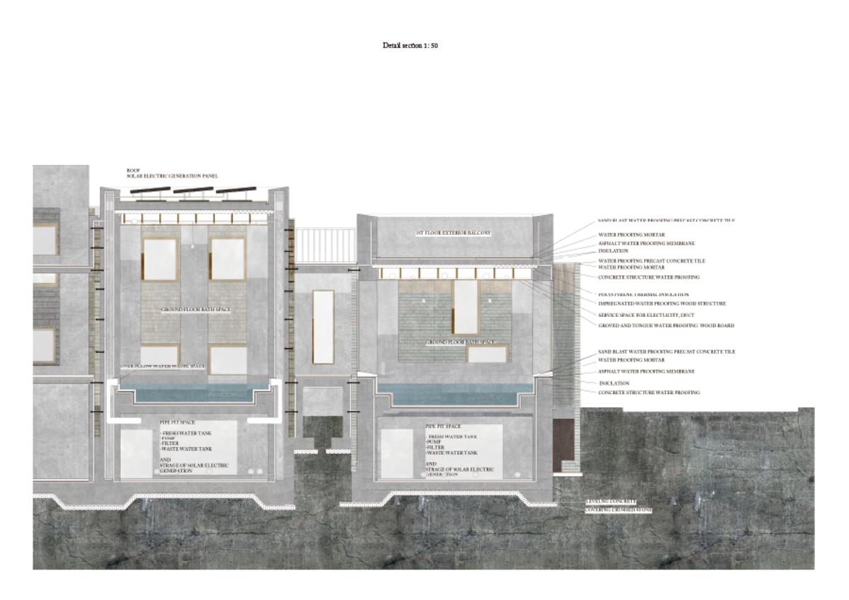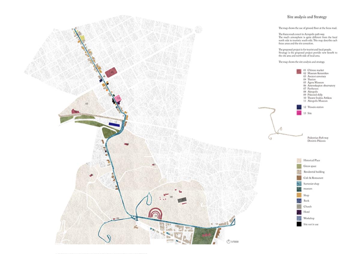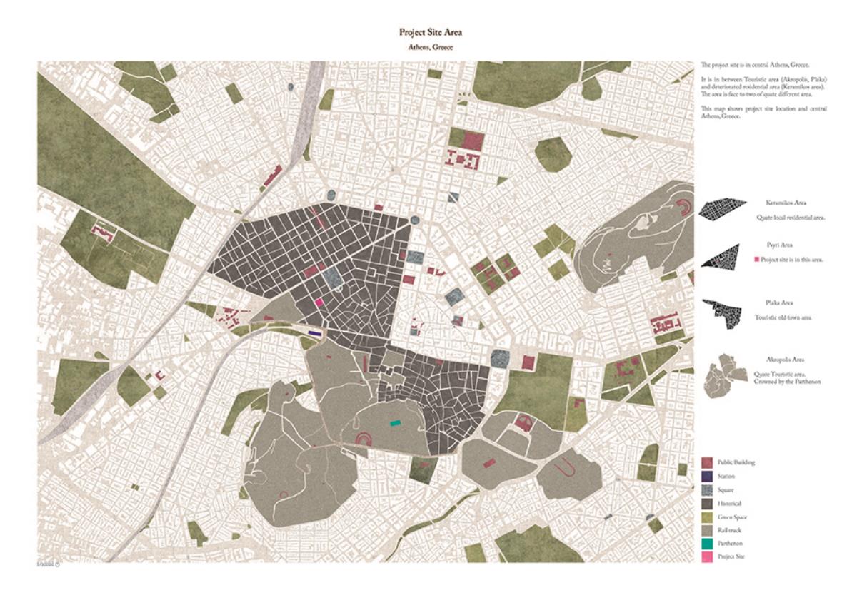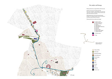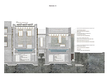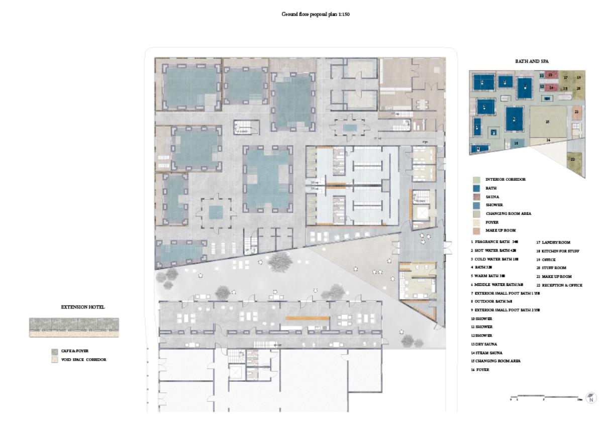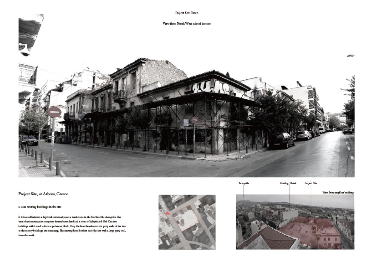 Stillness and Movement: Bath and Hotel Extension in Athens Part 2 Project 2013 Shoji Tamura University of East London London | UK The project is an extension of an existing hotel and a new bath. It is located between a deprived community and a tourist area in the North of the Acropolis. The immediate existing site comprises disused open land and a series of dilapidated 19th Century buildings that used to form a perimeter block. Only the front facades and the party walls of the two to three story buildings are remaining. The existing hotel borders onto the site with a large party wall, from the south.The intervention is set up to invigorate the area and bring further live from the tourist area into this deprived community. The bath allows a synergy between tourists and locals, while one subsidizes the other. Furthermore, the hotel expansion allows for needed hotel capacity. The designs of the bath and hotel are centered on a new public space that invites for resting, leisure, circulation and access.The bath design takes advantage of the small grain of 19th century buildings. Individual bath units are located within the remains, stabilizing their structures. Furthermore, the bath units step back from the front facades forming smaller courtyards that allow indirect light to filter deep into the bath. It is about stillness and movement. The upper floors form a new roofscape that is a play of former plot tectonics.On the ground floor, the hotel opens with a café onto the newly formed public space, further invigorating public live and blurring crucial boundaries between inside and outside. On the upper levels, the hotel is an extension of the party wall condition. Rooms gain privacy and indirect light through internal balconies.The project is a journey through scale, form and activity that allows for a new place in the heart of Athens. Tutor(s) Christopher Hadrys
