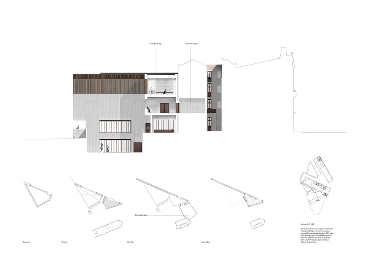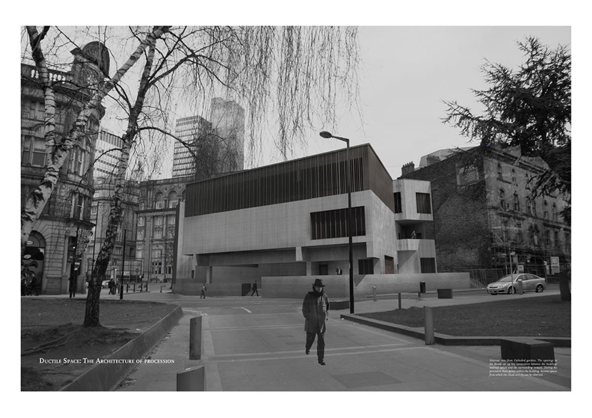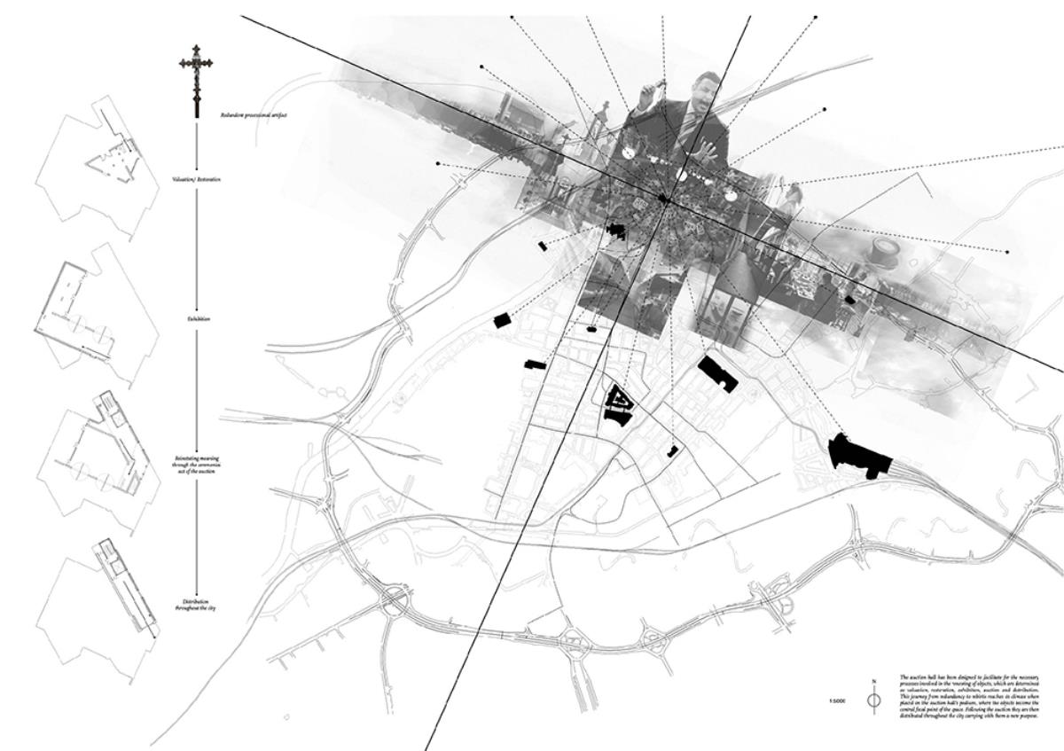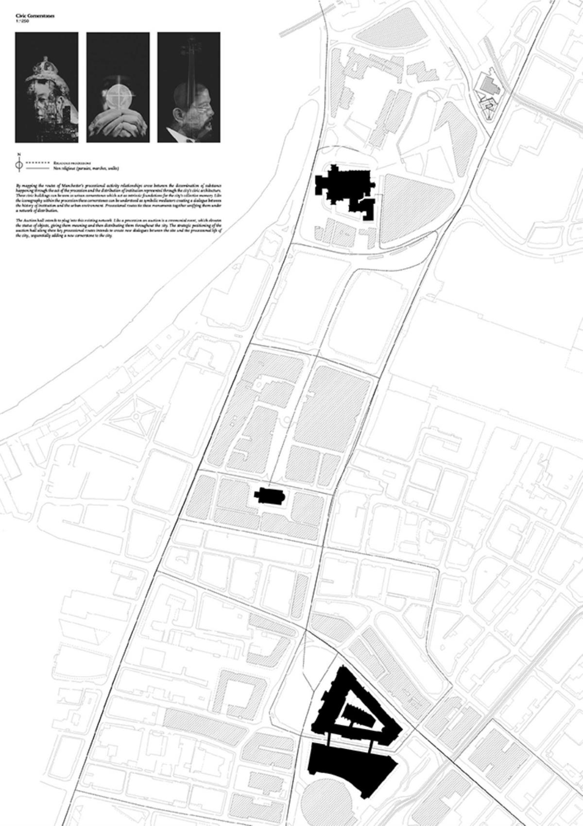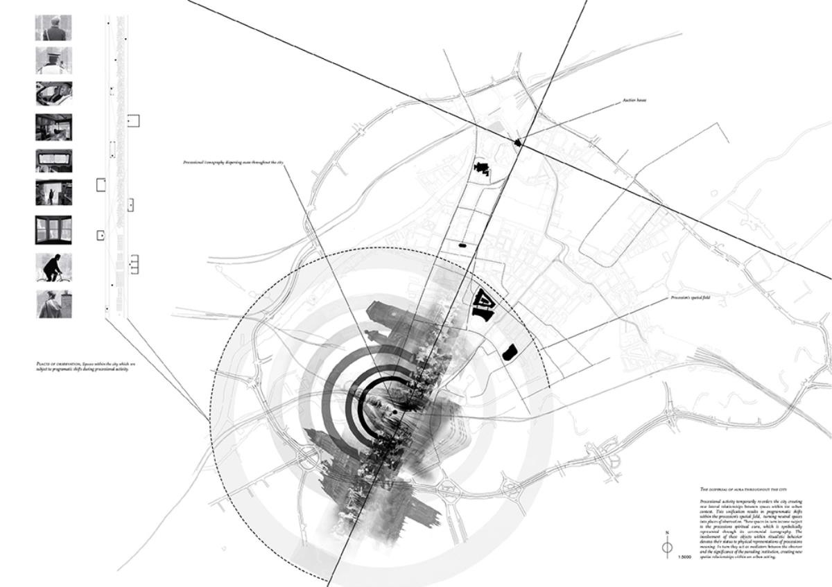 Ductile Space: The Architecture of Procession Part 1 Project 2013 Brett Dobson Manchester School of Architecture | UK Processional activity temporarily re-orders the city, creating ductile relationships between spaces within the urban context. This unification results in lateral programmatic shifts within a procession’s spatial field, turning once neutral spaces into places of observation. These spaces in turn become subject to the procession’s aura, which is symbolically represented through its ceremonial iconography and action. The involvement of these objects within ritualistic behaviour elevates their status to physical representations of the procession’s meaning. In turn, they act as mediators between the observer, and the parading institution, creating new spatial relationships within an urban setting.By mapping the routes of Manchester’s processional activity, relationships arise through the dissemination of substance through the processional act. The programme and its setting is an analogue of this process – re-distributing traces and artifacts through the civic architecture of Manchester. These civic buildings are understood as ‘urban cornerstones’ (foundations for urban collective memory). Like the iconography within the procession these cornerstones are also symbolic mediators creating a dialogue between the history of institutions and the urban environment. Processional routes tie these monuments together, unifying them into an alternative network of distribution.The Auction Hall plugs into and reorders this existing network. Like a procession an auction is the theatrical event which elevates the status of relics, giving them meaning and displacing them throughout the city. The strategic positioning of the Auction Hall along these key processional routes renews dialogues between the site and the processional activity happening within its spatial field. Sequentially, it creates a new cornerstone for the processional life of the city. Tutor(s) Darren Deane