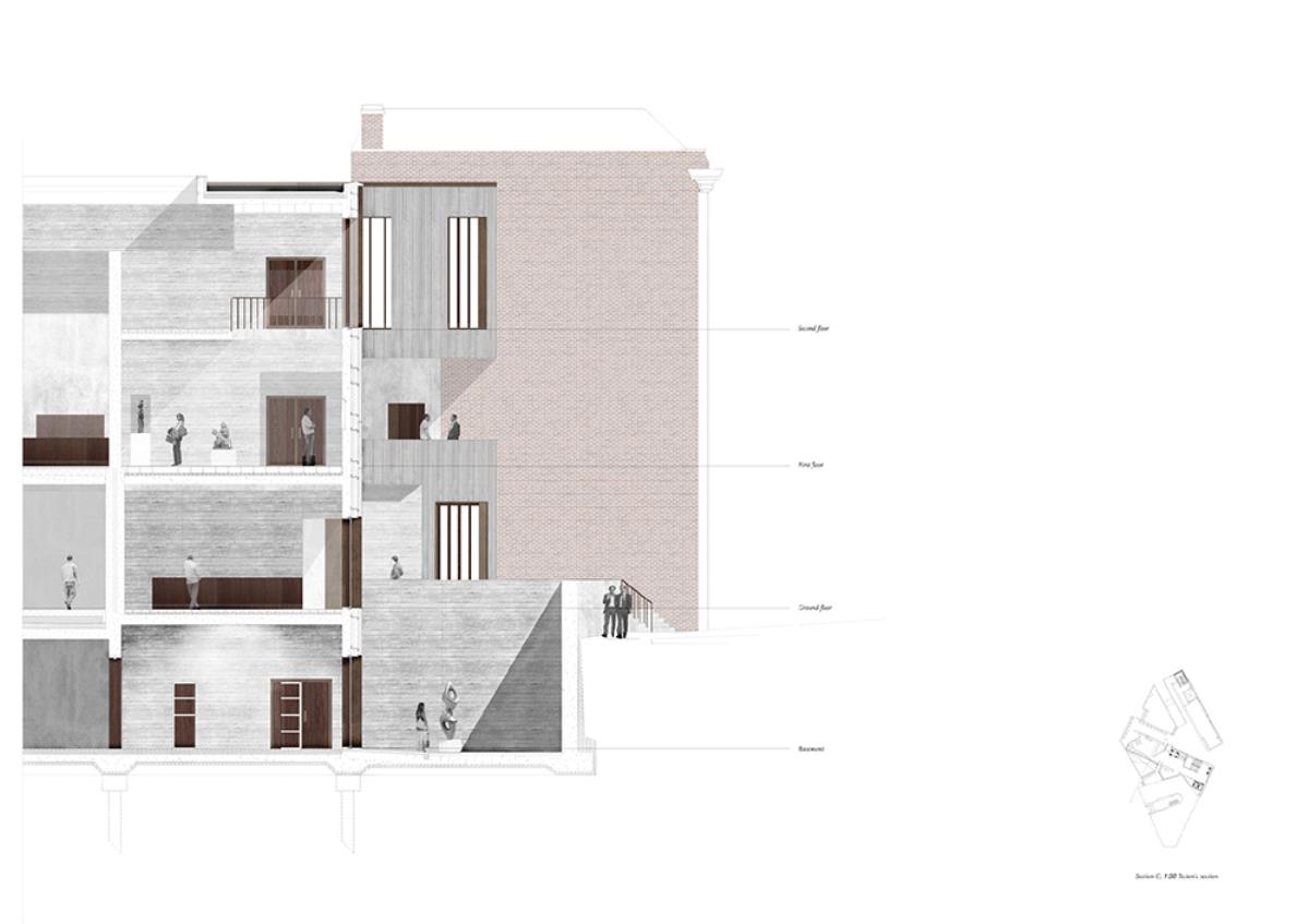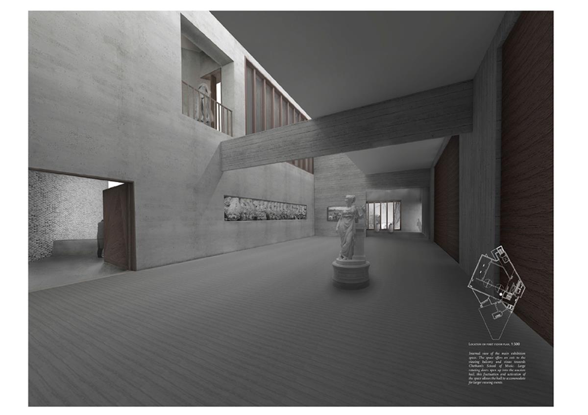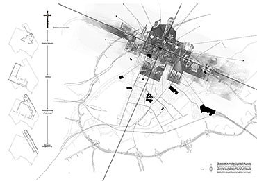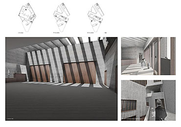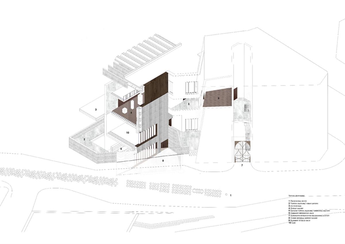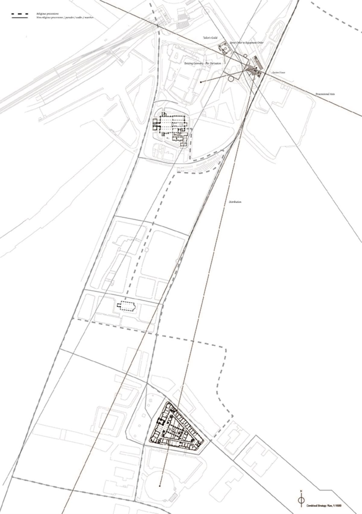 Ductile Space: The Architecture of Procession Part 1 Project 2013 Brett Dobson Manchester School of Architecture | UK Processional activity temporarily re-orders the city, creating ductile relationships between spaces within the urban context. This unification results in lateral programmatic shifts within a procession’s spatial field, turning once neutral spaces into places of observation. These spaces in turn become subject to the procession’s aura, which is symbolically represented through its ceremonial iconography and action. The involvement of these objects within ritualistic behaviour elevates their status to physical representations of the procession’s meaning. In turn, they act as mediators between the observer, and the parading institution, creating new spatial relationships within an urban setting.By mapping the routes of Manchester’s processional activity, relationships arise through the dissemination of substance through the processional act. The programme and its setting is an analogue of this process – re-distributing traces and artifacts through the civic architecture of Manchester. These civic buildings are understood as ‘urban cornerstones’ (foundations for urban collective memory). Like the iconography within the procession these cornerstones are also symbolic mediators creating a dialogue between the history of institutions and the urban environment. Processional routes tie these monuments together, unifying them into an alternative network of distribution.The Auction Hall plugs into and reorders this existing network. Like a procession an auction is the theatrical event which elevates the status of relics, giving them meaning and displacing them throughout the city. The strategic positioning of the Auction Hall along these key processional routes renews dialogues between the site and the processional activity happening within its spatial field. Sequentially, it creates a new cornerstone for the processional life of the city. Tutor(s) Darren Deane