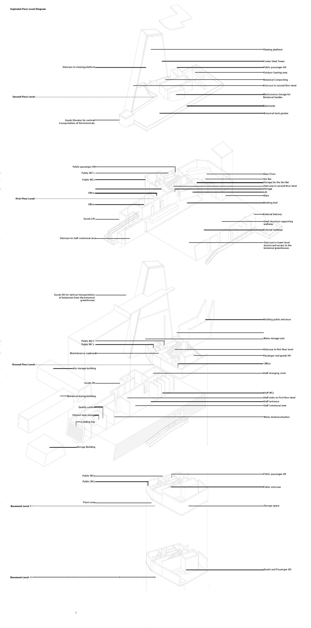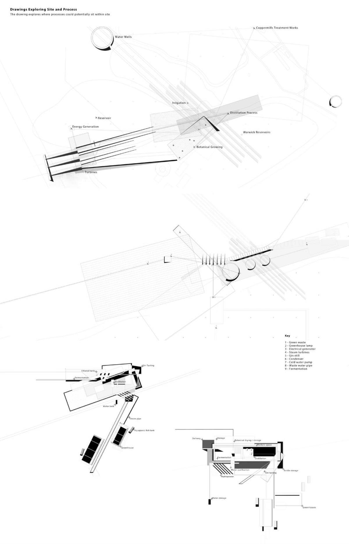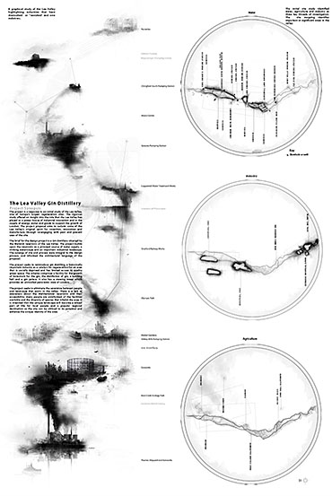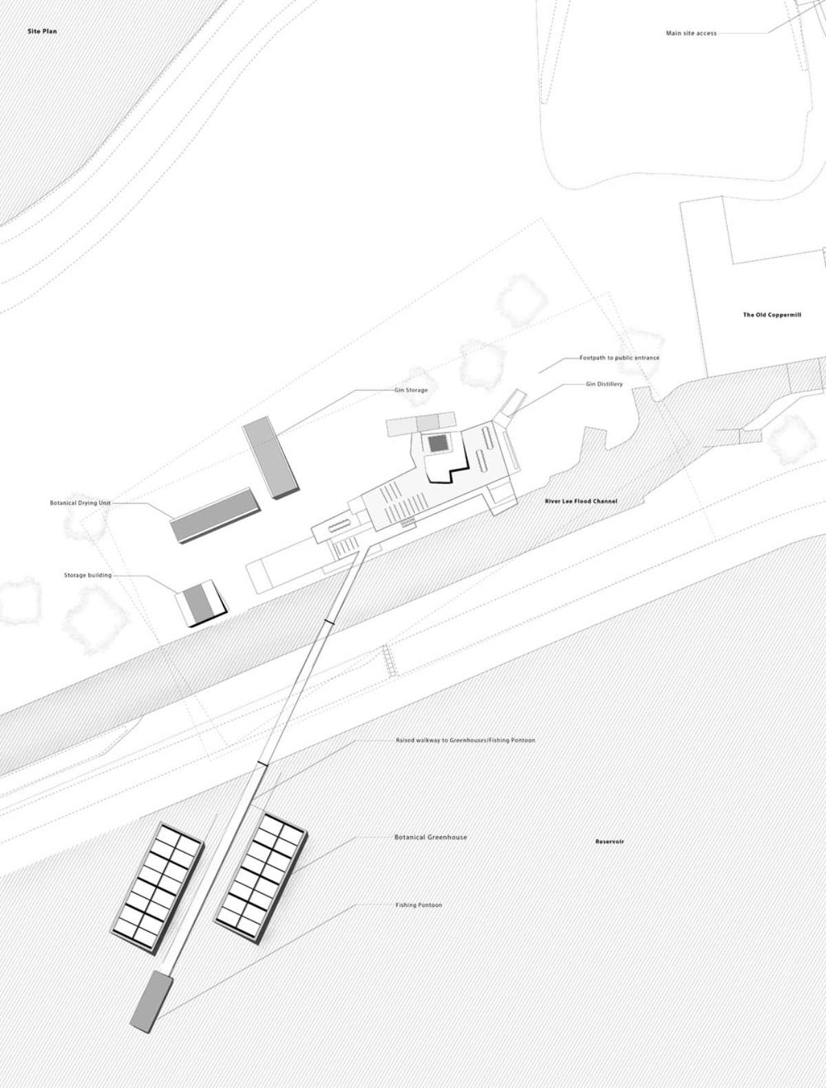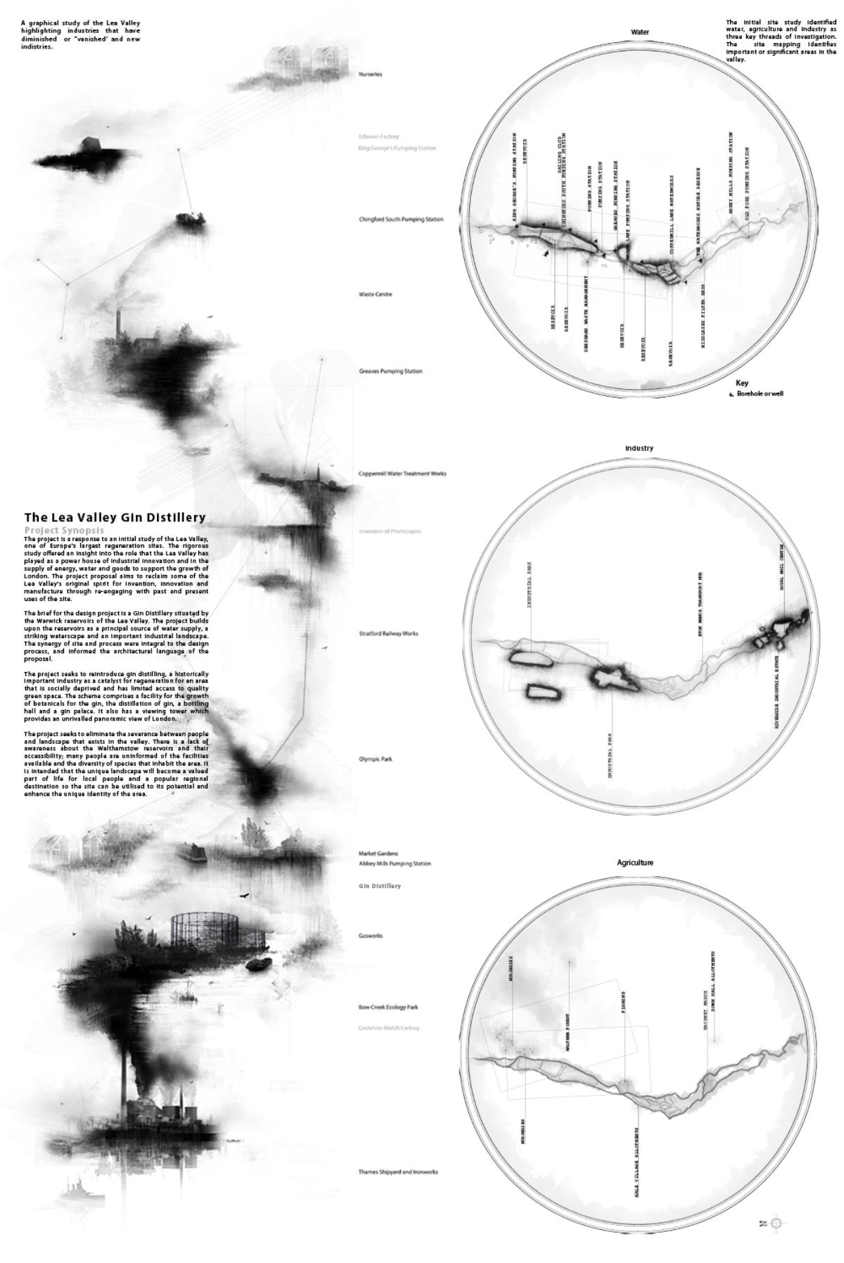 The Lea Valley Gin Distillery Part 1 Project 2013 Clare Hawes University of Lincoln Lincoln | UK The project is a response to an initial study of the Lea Valley, one of Europe’s largest regeneration sites. The rigorous study offered an insight into the role that the Lea Valley has played as a powerhouse of industrial innovation and in the supply of energy, water and goods to support the growth of London. The project proposal aims to reclaim some of the Lea Valley’s original spirit for invention, innovation and manufacture through re-engaging with past and present uses of the site.The brief for the design project is a Gin Distillery situated by the Warwick reservoirs of the Lea Valley. The project builds upon the reservoirs as a principal source of water supply, a striking waterscape and an important industrial landscape. The synergy of site and process were integral to the design process, and informed the architectural language of the proposal.The project seeks to reintroduce gin distilling, a historically important industry as a catalyst for regeneration for an area that is socially deprived and has limited access to quality green space. The scheme comprises a facility for the growth of botanicals for the gin, the distillation of gin, a bottling hall and a gin palace. It also has a viewing tower, which provides an unrivalled panoramic view of London. The project seeks to eliminate the severance between people and landscape that exists in the valley. There is a lack of awareness about the Walthamstow reservoirs and their accessibility; many people are uninformed of the facilities available and the diversity of species that inhabit the area. It is intended that the unique landscape will become a valued part of life for local people and a popular regional destination so the site can be utilised to its potential and enhance the unique identity of the area. Tutor(s) James Dale John Napier