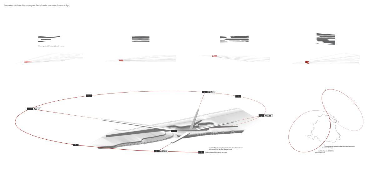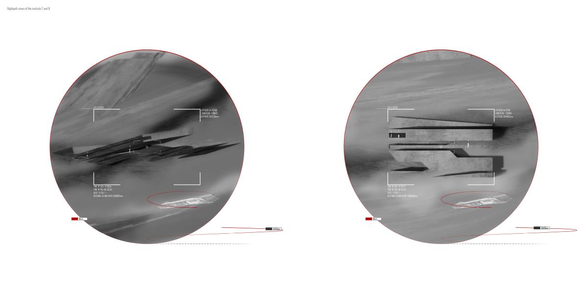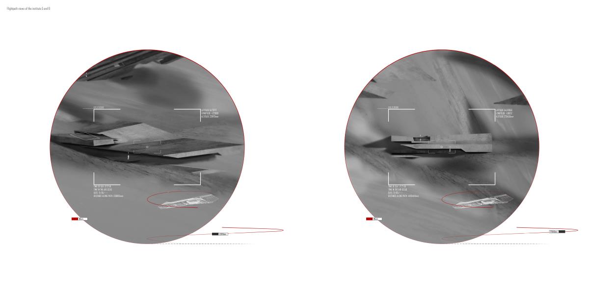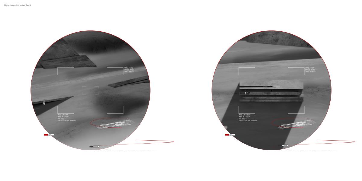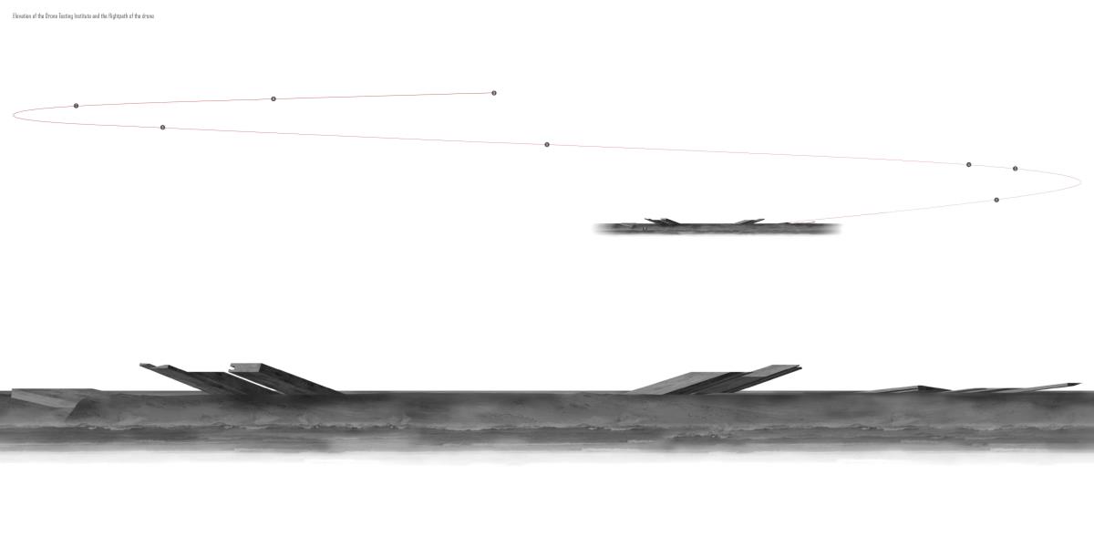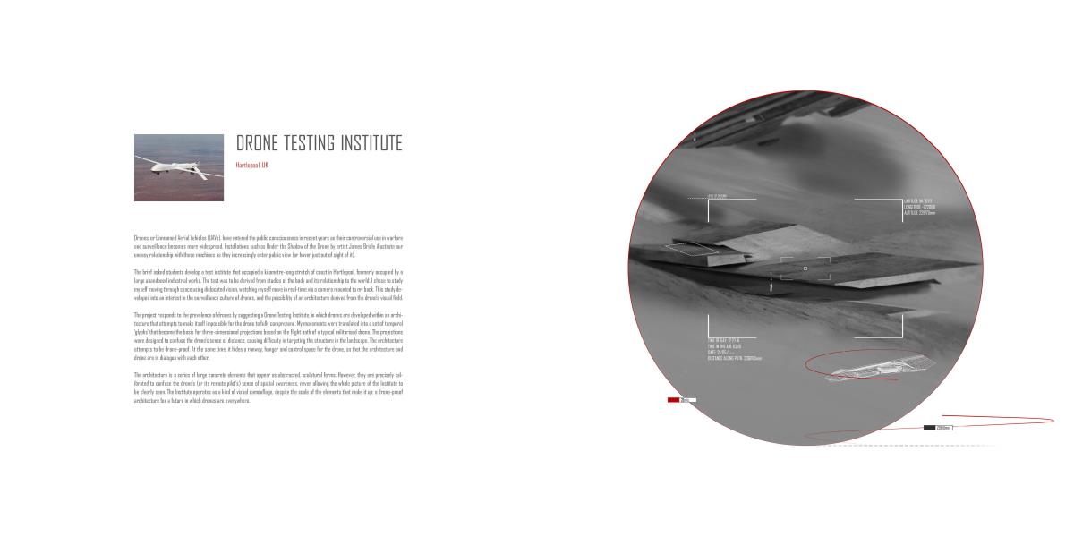 Drone Testing Institute Part 1 Project 2013 Michael Pybus Newcastle University | UK Drones, or Unmanned Aerial Vehicles (UAVs), have entered the public consciousness in recent years as their controversial use in warfare and surveillance becomes more widespread. Installations such as Under the Shadow of the Drone by artist James Bridle illustrate our uneasy relationship with these machines as they increasingly enter public view (or hover just out of sight of it).The brief asked students develop a test institute that occupied a kilometre-long stretch of coast in Hartlepool, formerly occupied by a large abandoned industrial works. The test was to be derived from studies of the body and its relationship to the world. I chose to study myself moving through space using dislocated vision, watching myself move in real-time via a camera mounted to my back. This study developed into an interest in the surveillance culture of drones, and the possibility of an architecture derived from the drone’s visual field.The project responds to the prevalence of drones by suggesting a Drone Testing Institute, in which drones are developed within an architecture that attempts to make itself impossible for the drone to fully comprehend. My movements were translated into a set of temporal ‘glyphs’ that become the basis for three-dimensional projections based on the flight path of a typical militarised drone. The projections were designed to confuse the drone’s sense of distance, causing difficulty in targeting the structure in the landscape. The architecture attempts to be drone-proof. At the same time, it hides a runway, hangar and control space for the drone, so that the architecture and drone are in dialogue with each other.The architecture is a series of large concrete elements that appear as abstracted, sculptural forms. However, they are precisely calibrated to confuse the drone’s (or its remote pilot’s) sense of spatial awareness, never allowing the whole picture of the Institute to be clearly seen. The Institute operates as a kind of visual camouflage, despite the scale of the elements that make it up: a drone-proof architecture for a future in which drones are everywhere. Tutor(s) James Craig Matt Ozga-Lawn