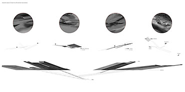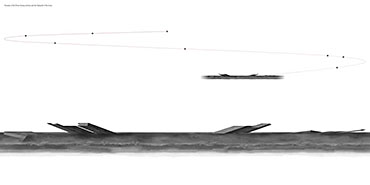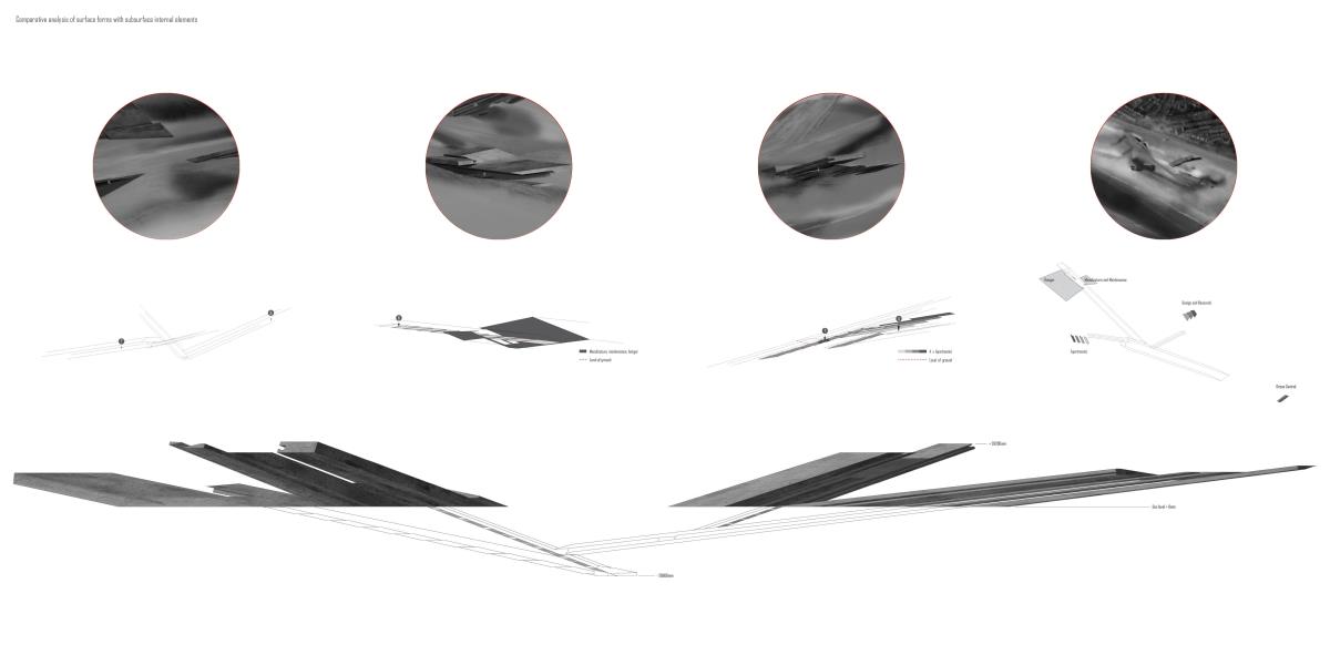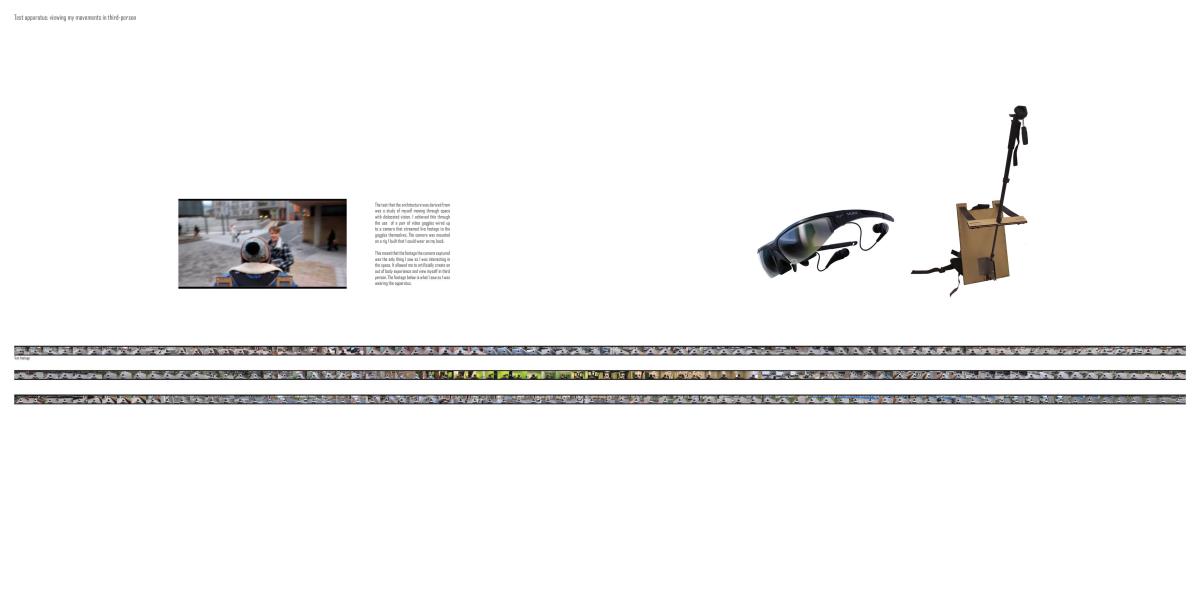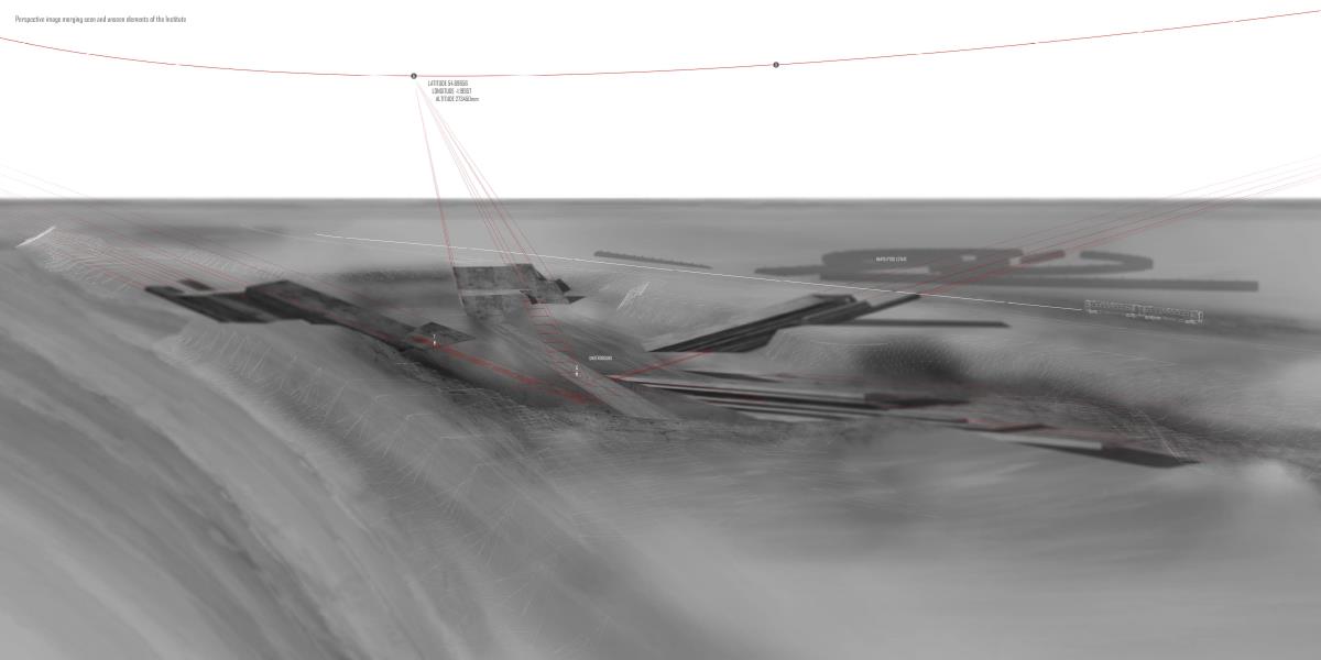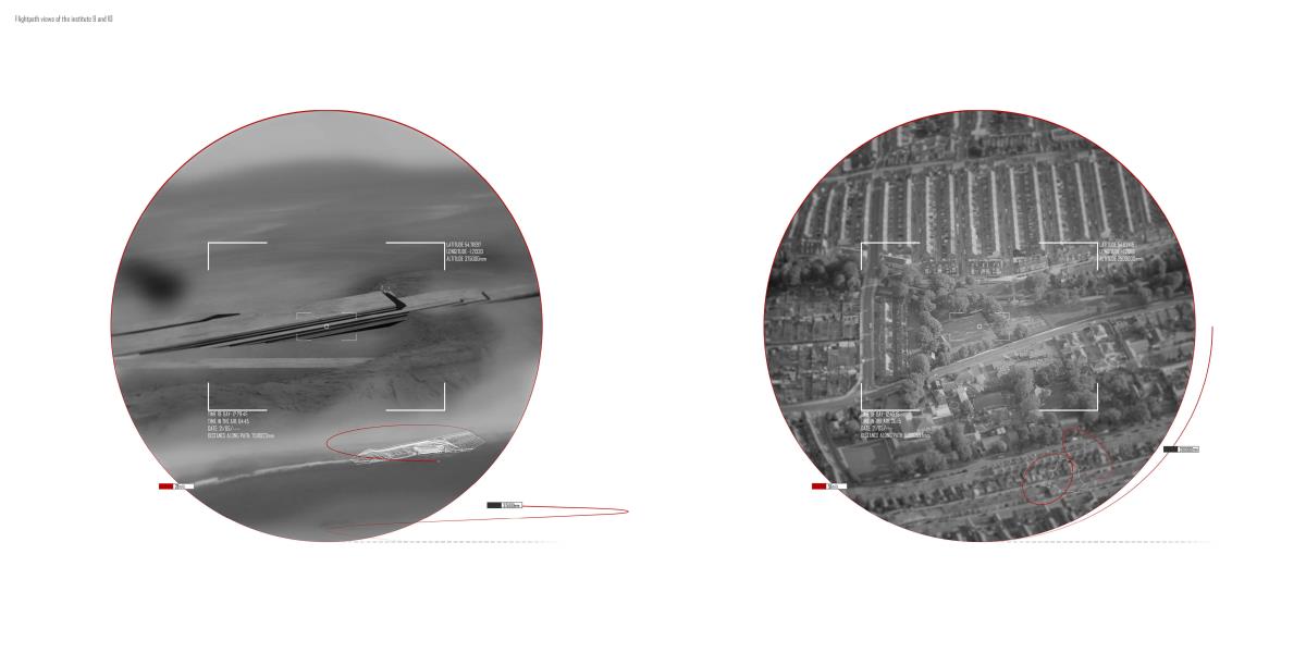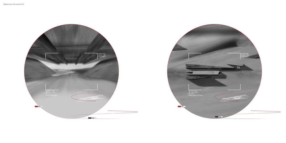 Drone Testing Institute Part 1 Project 2013 Michael Pybus Newcastle University | UK Drones, or Unmanned Aerial Vehicles (UAVs), have entered the public consciousness in recent years as their controversial use in warfare and surveillance becomes more widespread. Installations such as Under the Shadow of the Drone by artist James Bridle illustrate our uneasy relationship with these machines as they increasingly enter public view (or hover just out of sight of it).The brief asked students develop a test institute that occupied a kilometre-long stretch of coast in Hartlepool, formerly occupied by a large abandoned industrial works. The test was to be derived from studies of the body and its relationship to the world. I chose to study myself moving through space using dislocated vision, watching myself move in real-time via a camera mounted to my back. This study developed into an interest in the surveillance culture of drones, and the possibility of an architecture derived from the drone’s visual field.The project responds to the prevalence of drones by suggesting a Drone Testing Institute, in which drones are developed within an architecture that attempts to make itself impossible for the drone to fully comprehend. My movements were translated into a set of temporal ‘glyphs’ that become the basis for three-dimensional projections based on the flight path of a typical militarised drone. The projections were designed to confuse the drone’s sense of distance, causing difficulty in targeting the structure in the landscape. The architecture attempts to be drone-proof. At the same time, it hides a runway, hangar and control space for the drone, so that the architecture and drone are in dialogue with each other.The architecture is a series of large concrete elements that appear as abstracted, sculptural forms. However, they are precisely calibrated to confuse the drone’s (or its remote pilot’s) sense of spatial awareness, never allowing the whole picture of the Institute to be clearly seen. The Institute operates as a kind of visual camouflage, despite the scale of the elements that make it up: a drone-proof architecture for a future in which drones are everywhere. Tutor(s) James Craig Matt Ozga-Lawn