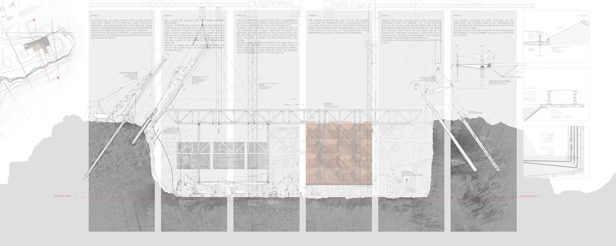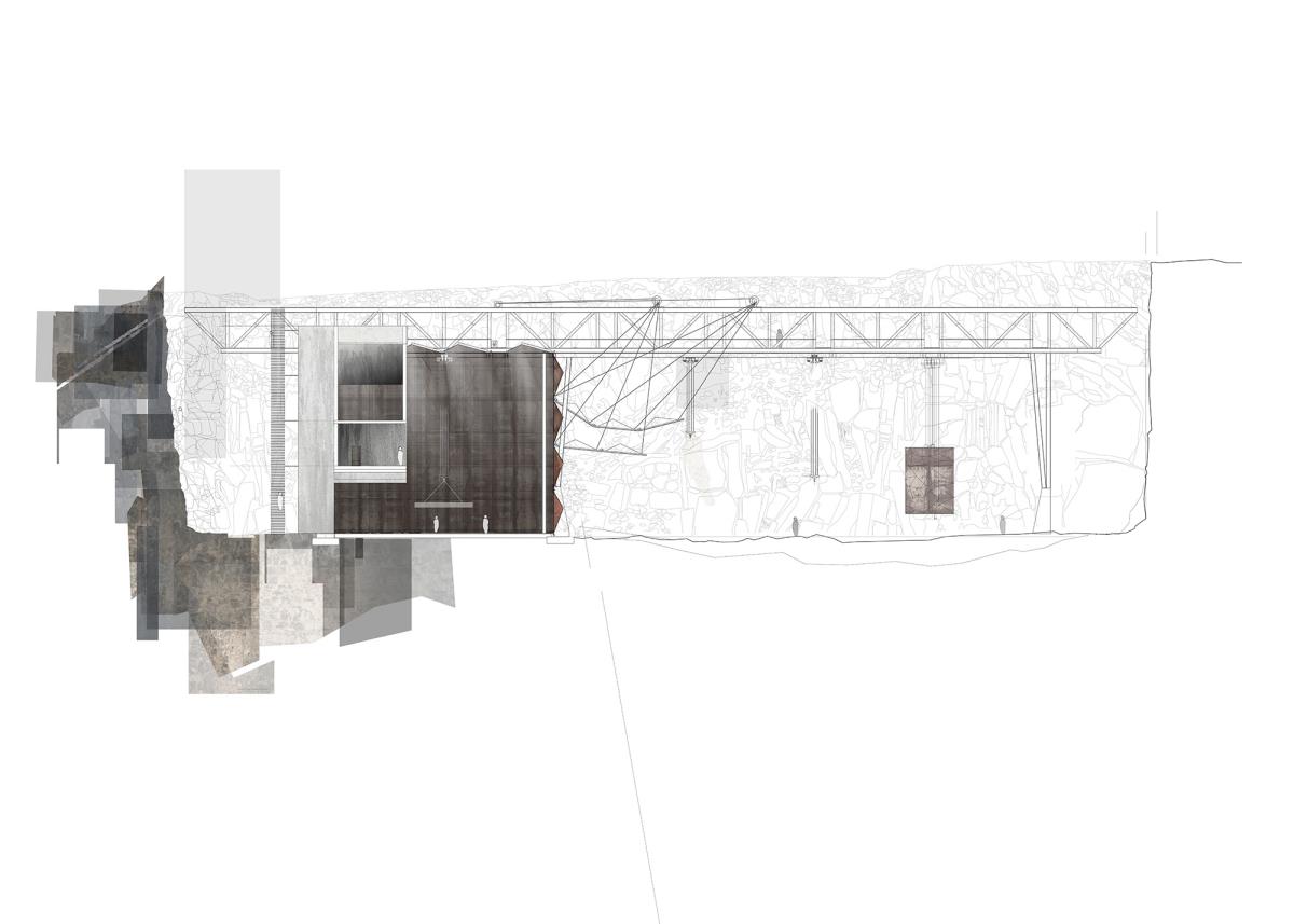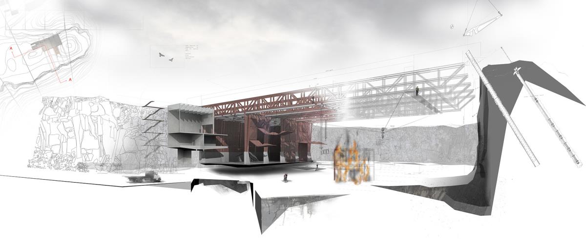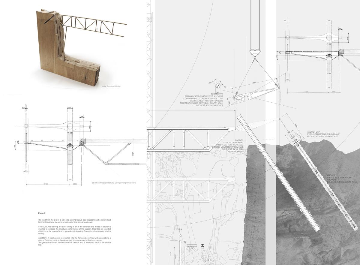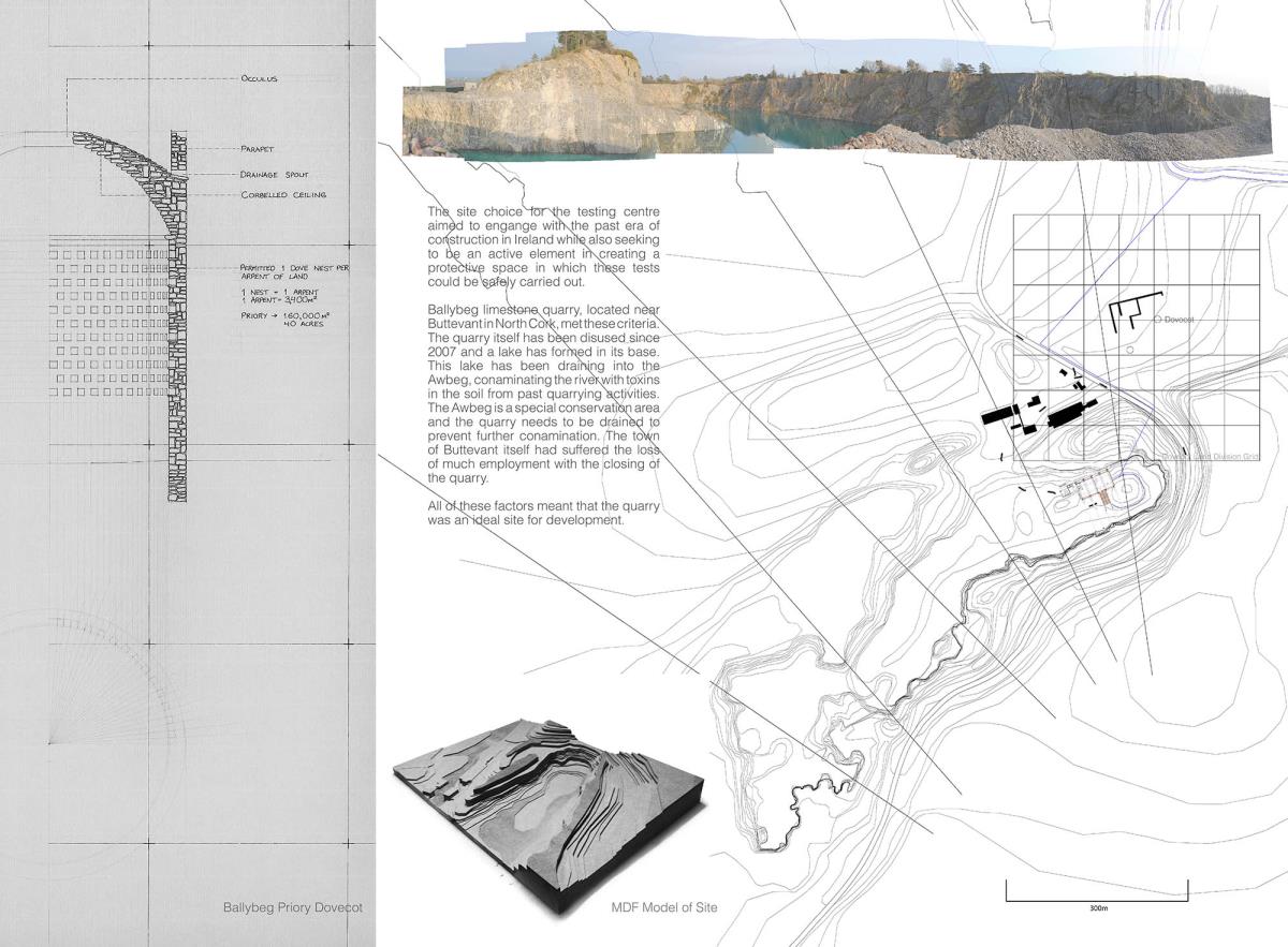 Crucible: Ballybeg Testing Centre Part 1 Project 2013 Kieran Cremin University College Cork | Ireland This project stems from the shift in the Irish economy from one of manufacturing to one of research and development. Surfacing from an exploration into the industrial process of grain handling in the South Docks of Cork City, an attitude of experimentation and testing was cultivated through a series of investigations into the technology associated with the Building Research Establishment.Through its articulation of the testing of building components, Ballybeg Testing Centre aspires to be a beacon in the re-identification of Irish industrial development. The centre sanctifies the act of testing and technological precision in its expression; in the hope of refocusing the construction industry on the need for craftsmanship and care in the wake of a boom of shoddy building fabrication.Setting itself in a disused quarry near Buttevant, County Cork, the project pays homage to a tradition of construction while aiming to reinvigorate a landscape of limestone cliffs and excess water contaminated from past activity. The initial response creates a ceiling over the three existing limestone elevations and forms a protective enclosure around the testing being performed within. The built form floats above this manmade hollow in the landscape touching only the top of the quarry walls with careful articulation while any interior elements are suspended from the spanning girders. This steel web serves as the primary functional element for all activities taking place within the facility.The project speculates as to the possibilities of future economic development while laying a marker on past failures. Its processes aim to celebrate the cultivation of a well built environment; exalting high building standards as something that is both aspired to and achieved within this crucible of steel and stone. Tutor(s) Dr Gary Boyd Paul Butler Lorenzo Cammoranesi