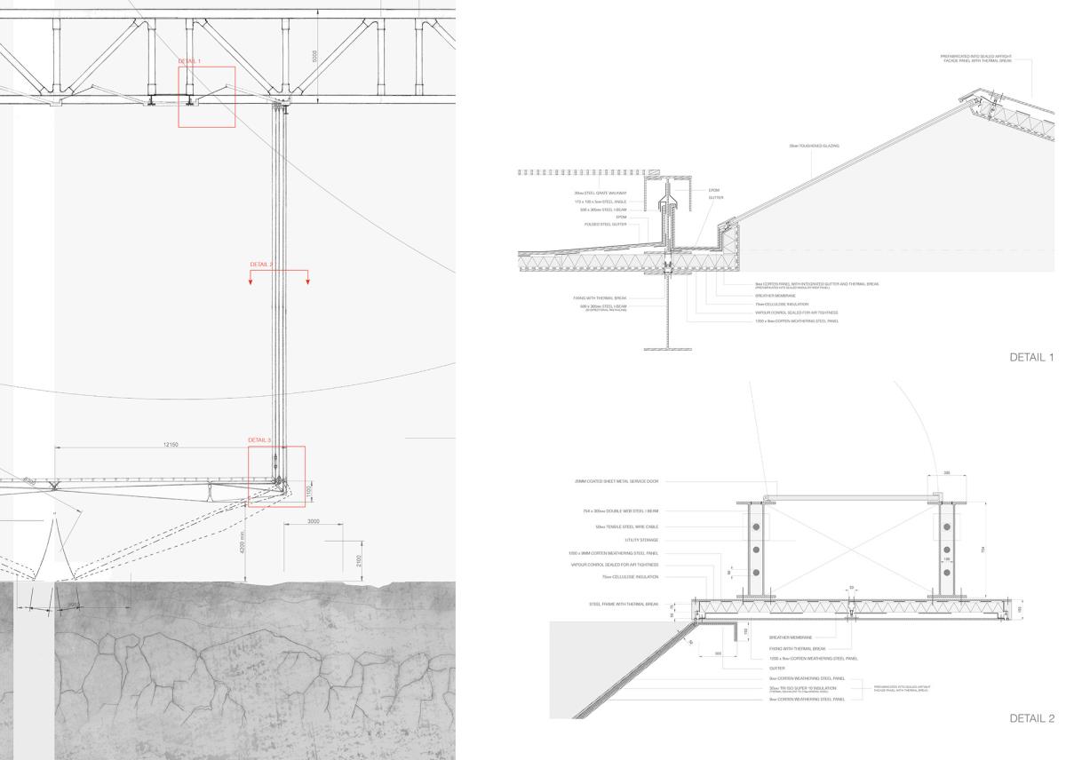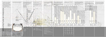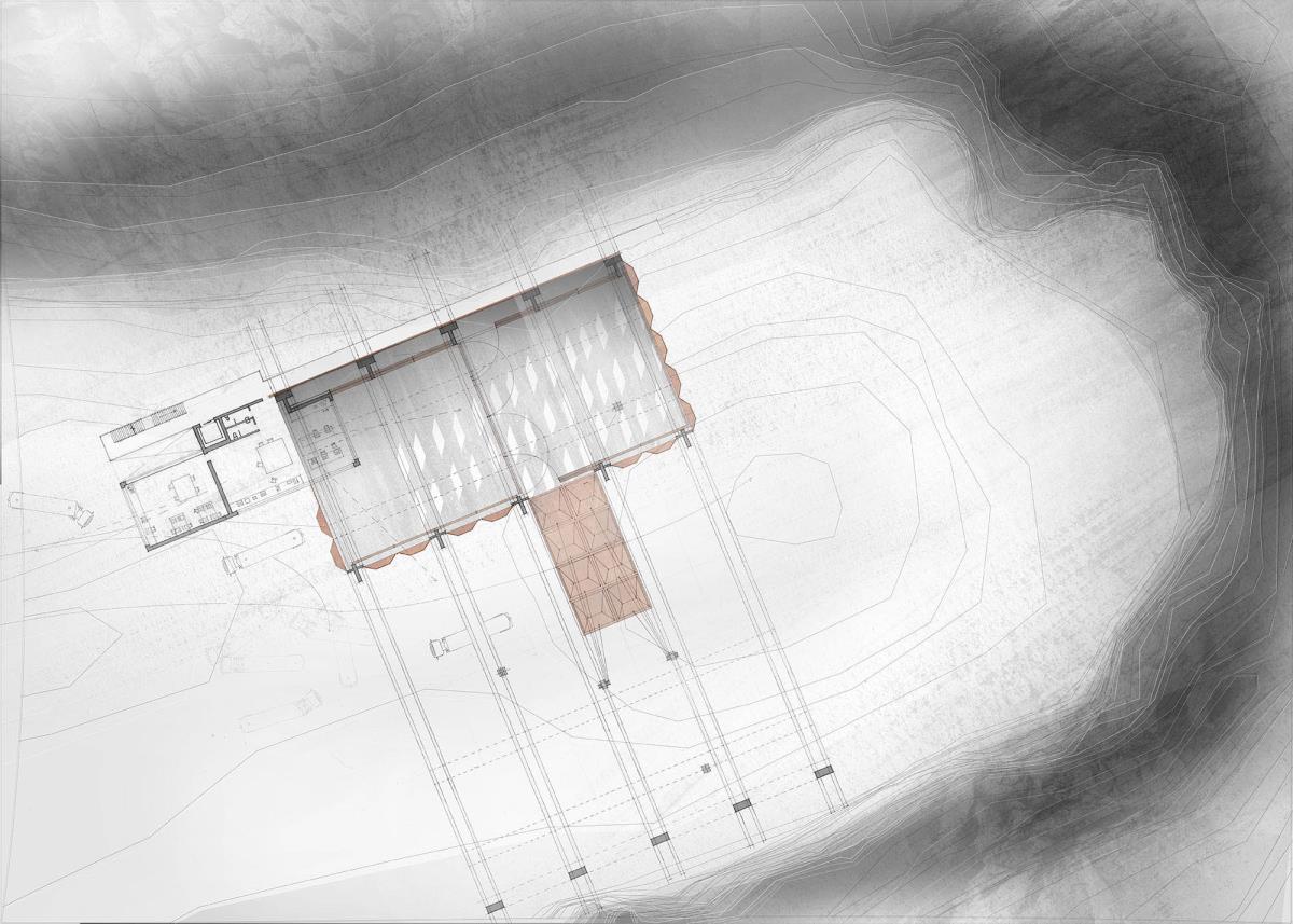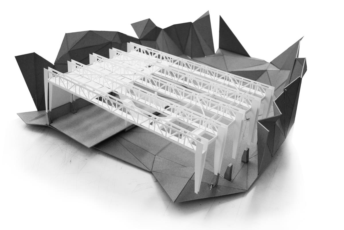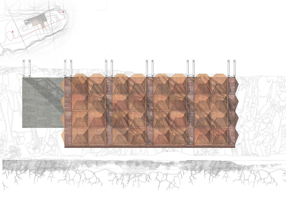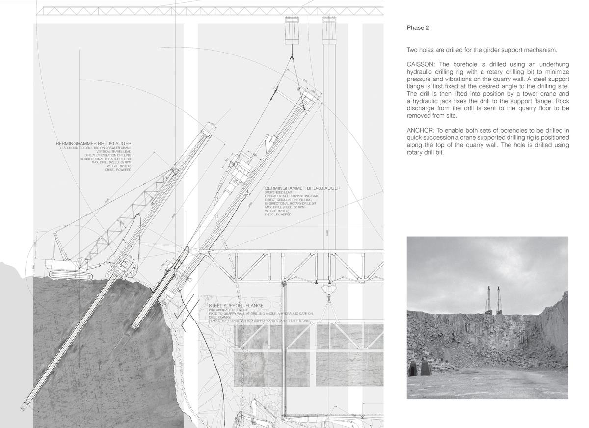 Crucible: Ballybeg Testing Centre Part 1 Project 2013 Kieran Cremin University College Cork | Ireland This project stems from the shift in the Irish economy from one of manufacturing to one of research and development. Surfacing from an exploration into the industrial process of grain handling in the South Docks of Cork City, an attitude of experimentation and testing was cultivated through a series of investigations into the technology associated with the Building Research Establishment.Through its articulation of the testing of building components, Ballybeg Testing Centre aspires to be a beacon in the re-identification of Irish industrial development. The centre sanctifies the act of testing and technological precision in its expression; in the hope of refocusing the construction industry on the need for craftsmanship and care in the wake of a boom of shoddy building fabrication.Setting itself in a disused quarry near Buttevant, County Cork, the project pays homage to a tradition of construction while aiming to reinvigorate a landscape of limestone cliffs and excess water contaminated from past activity. The initial response creates a ceiling over the three existing limestone elevations and forms a protective enclosure around the testing being performed within. The built form floats above this manmade hollow in the landscape touching only the top of the quarry walls with careful articulation while any interior elements are suspended from the spanning girders. This steel web serves as the primary functional element for all activities taking place within the facility.The project speculates as to the possibilities of future economic development while laying a marker on past failures. Its processes aim to celebrate the cultivation of a well built environment; exalting high building standards as something that is both aspired to and achieved within this crucible of steel and stone. Tutor(s) Dr Gary Boyd Paul Butler Lorenzo Cammoranesi