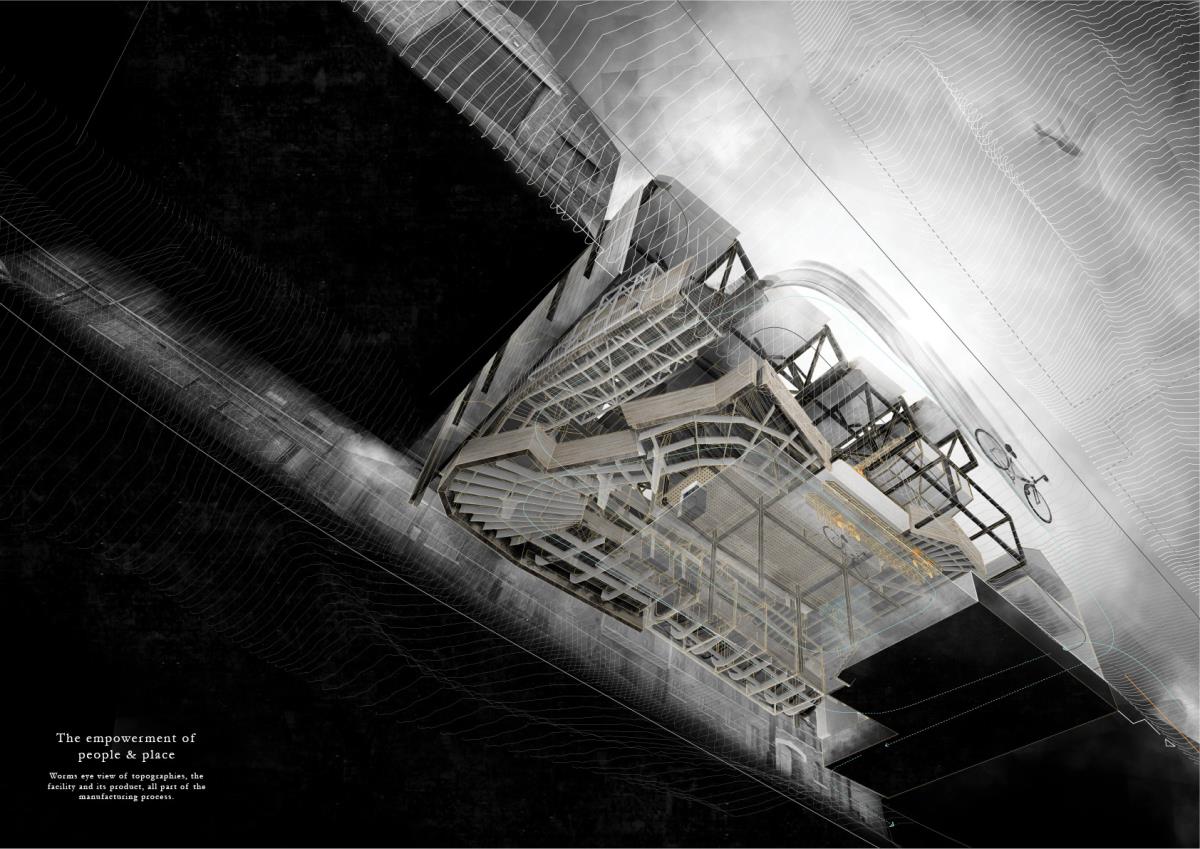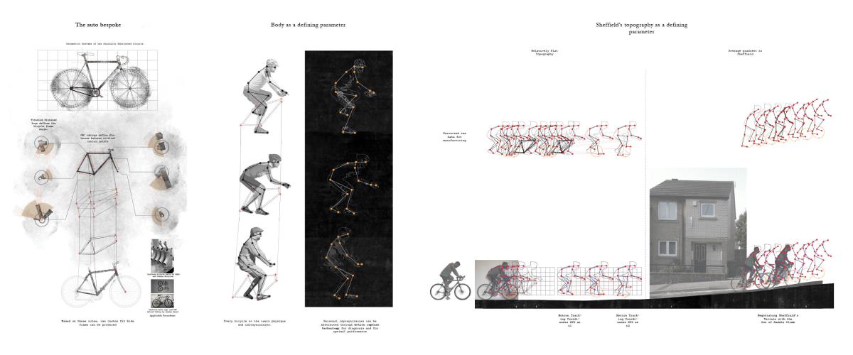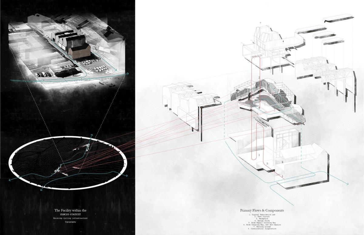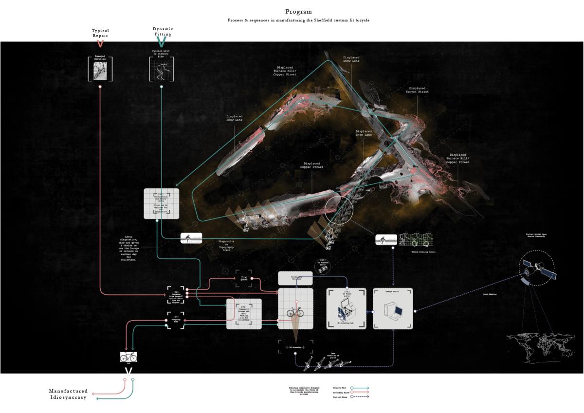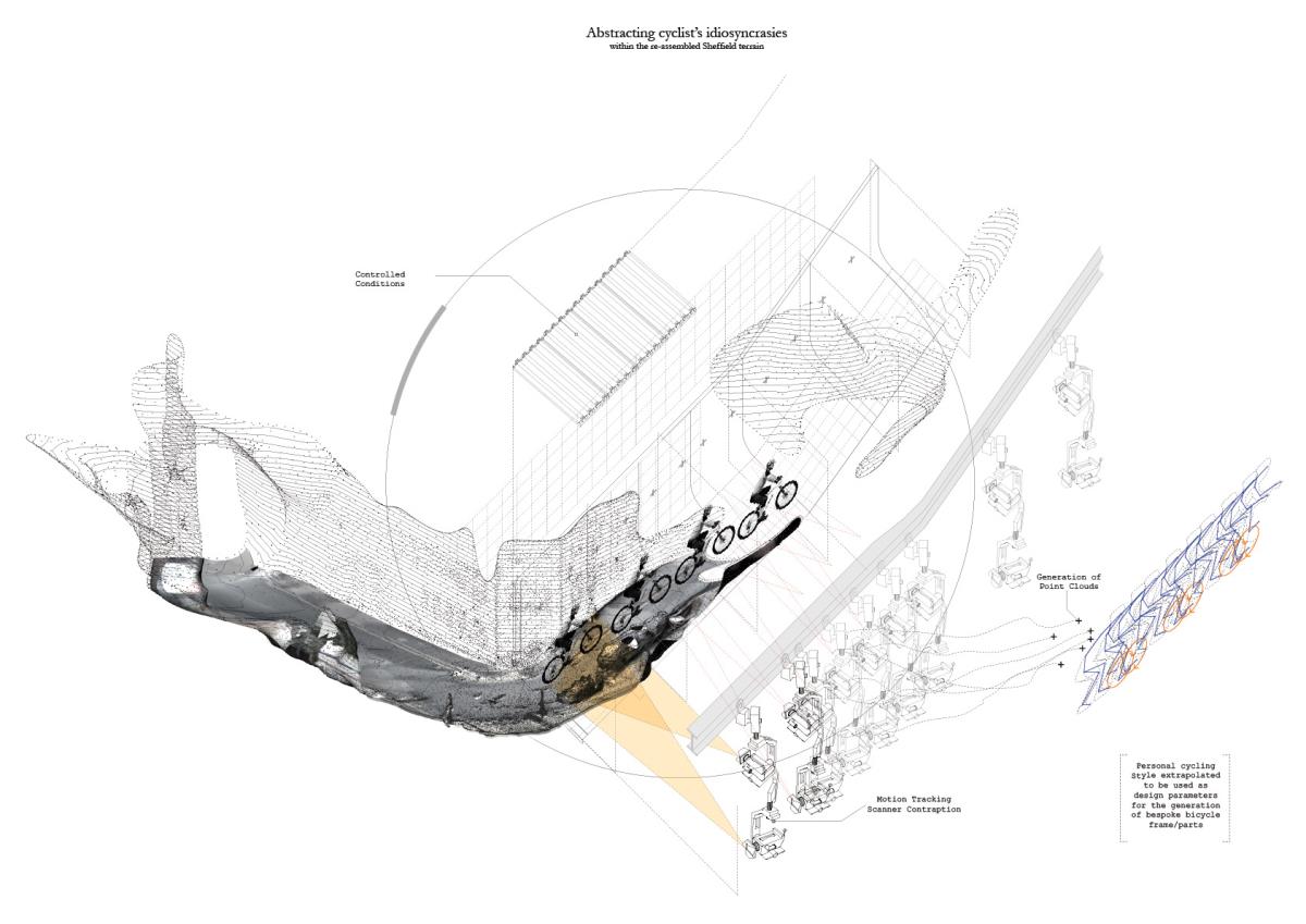 Manufacturing [of] Urban Idiosyncrasies - Facility for Sheffield’s Digitally Fabricated Bicycles Part 1 Project 2013 Mohammed Syafiq Hassan Jubri University of Sheffield | UK Based in Sheffield, the project proposes a digital manufacturing facility for bespoke bicycles, customised for the individual cyclist and responding to specifics of the city. Building upon the recent proliferation of digital technology, the program aims to augment local sustainable transportation whilst embracing new making processes within the post-industrial landscape of Sheffield’s Furnace Hill.The project investigates the notion that cities will continue to influence their inhabitants’ movements, habits and idiosyncrasies in a digital future. Through reverse engineering and digital fabrication, the process of manufacturing urban idiosyncrasies embraces a state of continuous translation, blurring boundaries between recording, designing and making, and oscillating between physical and digital states. Sheffield’s idiosyncratic topography shapes the bodily movements of its inhabitants, which in turn shape the objects they use. The resultant objects, particular to person and place, define a new synergy between inhabitants and their city.The area of Furnace Hill represents a cross section of Sheffield’s idiosyncratic topography and forms a geographical focus for the project. A series of terrain samples are abstracted from the streets around Furnace Hill through a photogrammetry process. These virtually displaced terrains are then re-assembled into a sequence of 3D printed concrete terrains, suspended within the facility to function as a fixed manufacturing parameter influencing the production of each bicycle.As the cyclist cycles onto and along these newly displaced terrains a motion capture camera tracks his/her unique movements and idiosyncrasies. The unique abstracted digital data of the cyclist’s cycling style (a second manufacturing parameter) upon the terrain directly informs the geometry of a new customized digitally fabricated bicycle. The bicycle is created from a digitally manufactured (3D printed and machine-cut) kit of parts that can be rapidly assembled. The bicycle can also be disassembled should it need to respond to new idiosyncrasies in future.The proposal recognises our behaviours and identities are inherent in the city, and that the idiosyncratic characteristics of person and place can be empowered within an increasingly global and digital world. Tutor(s) Oli Cunningham