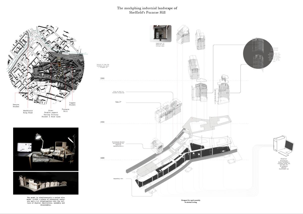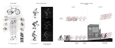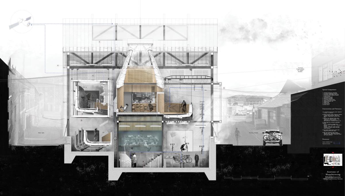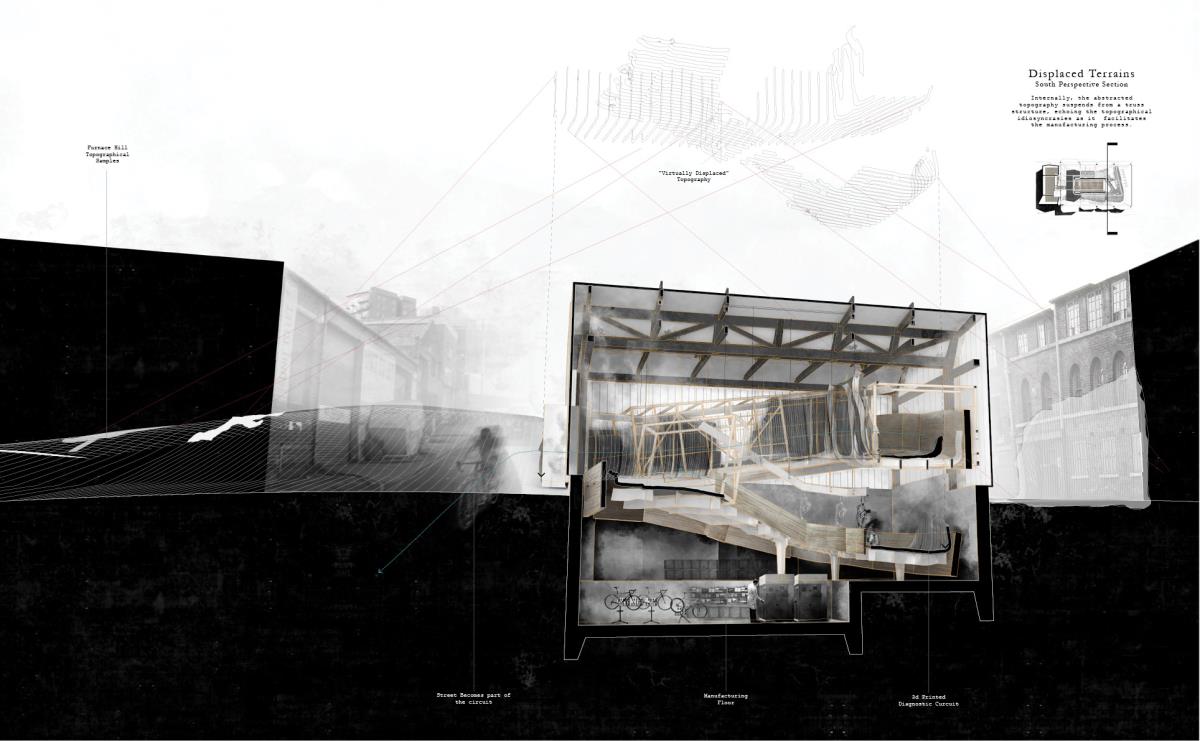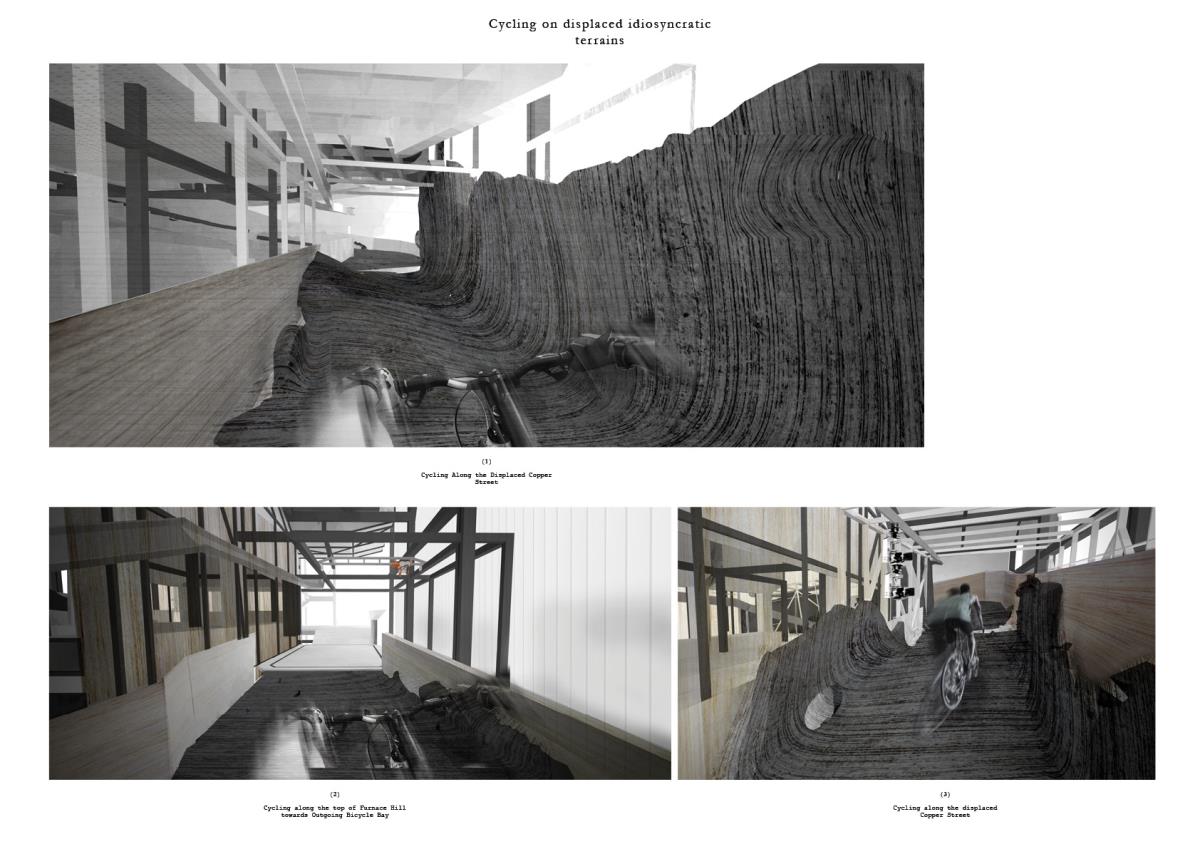 Manufacturing [of] Urban Idiosyncrasies - Facility for Sheffield’s Digitally Fabricated Bicycles Part 1 Project 2013 Mohammed Syafiq Hassan Jubri University of Sheffield | UK Based in Sheffield, the project proposes a digital manufacturing facility for bespoke bicycles, customised for the individual cyclist and responding to specifics of the city. Building upon the recent proliferation of digital technology, the program aims to augment local sustainable transportation whilst embracing new making processes within the post-industrial landscape of Sheffield’s Furnace Hill.The project investigates the notion that cities will continue to influence their inhabitants’ movements, habits and idiosyncrasies in a digital future. Through reverse engineering and digital fabrication, the process of manufacturing urban idiosyncrasies embraces a state of continuous translation, blurring boundaries between recording, designing and making, and oscillating between physical and digital states. Sheffield’s idiosyncratic topography shapes the bodily movements of its inhabitants, which in turn shape the objects they use. The resultant objects, particular to person and place, define a new synergy between inhabitants and their city.The area of Furnace Hill represents a cross section of Sheffield’s idiosyncratic topography and forms a geographical focus for the project. A series of terrain samples are abstracted from the streets around Furnace Hill through a photogrammetry process. These virtually displaced terrains are then re-assembled into a sequence of 3D printed concrete terrains, suspended within the facility to function as a fixed manufacturing parameter influencing the production of each bicycle.As the cyclist cycles onto and along these newly displaced terrains a motion capture camera tracks his/her unique movements and idiosyncrasies. The unique abstracted digital data of the cyclist’s cycling style (a second manufacturing parameter) upon the terrain directly informs the geometry of a new customized digitally fabricated bicycle. The bicycle is created from a digitally manufactured (3D printed and machine-cut) kit of parts that can be rapidly assembled. The bicycle can also be disassembled should it need to respond to new idiosyncrasies in future.The proposal recognises our behaviours and identities are inherent in the city, and that the idiosyncratic characteristics of person and place can be empowered within an increasingly global and digital world. Tutor(s) Oli Cunningham