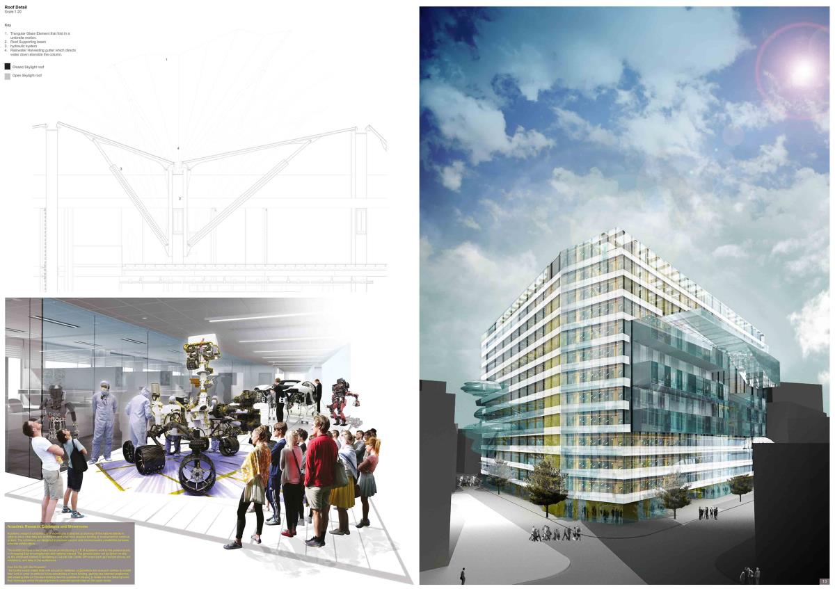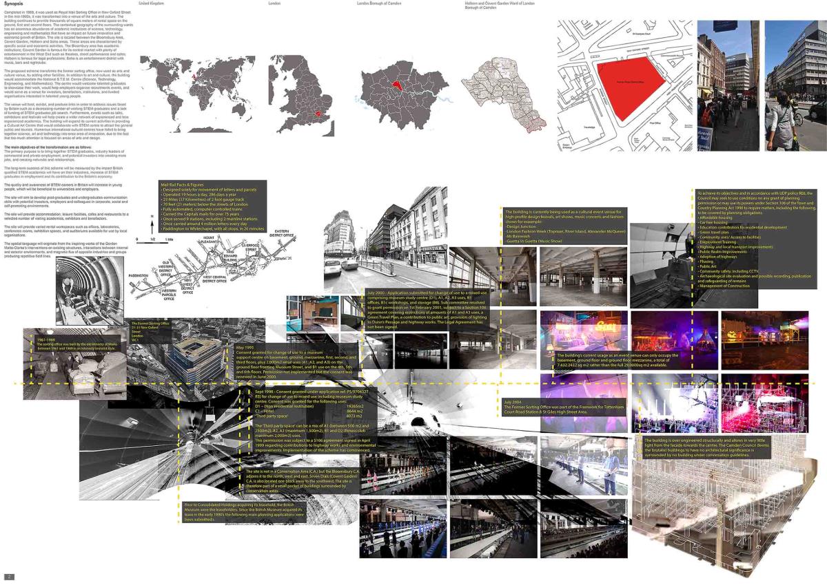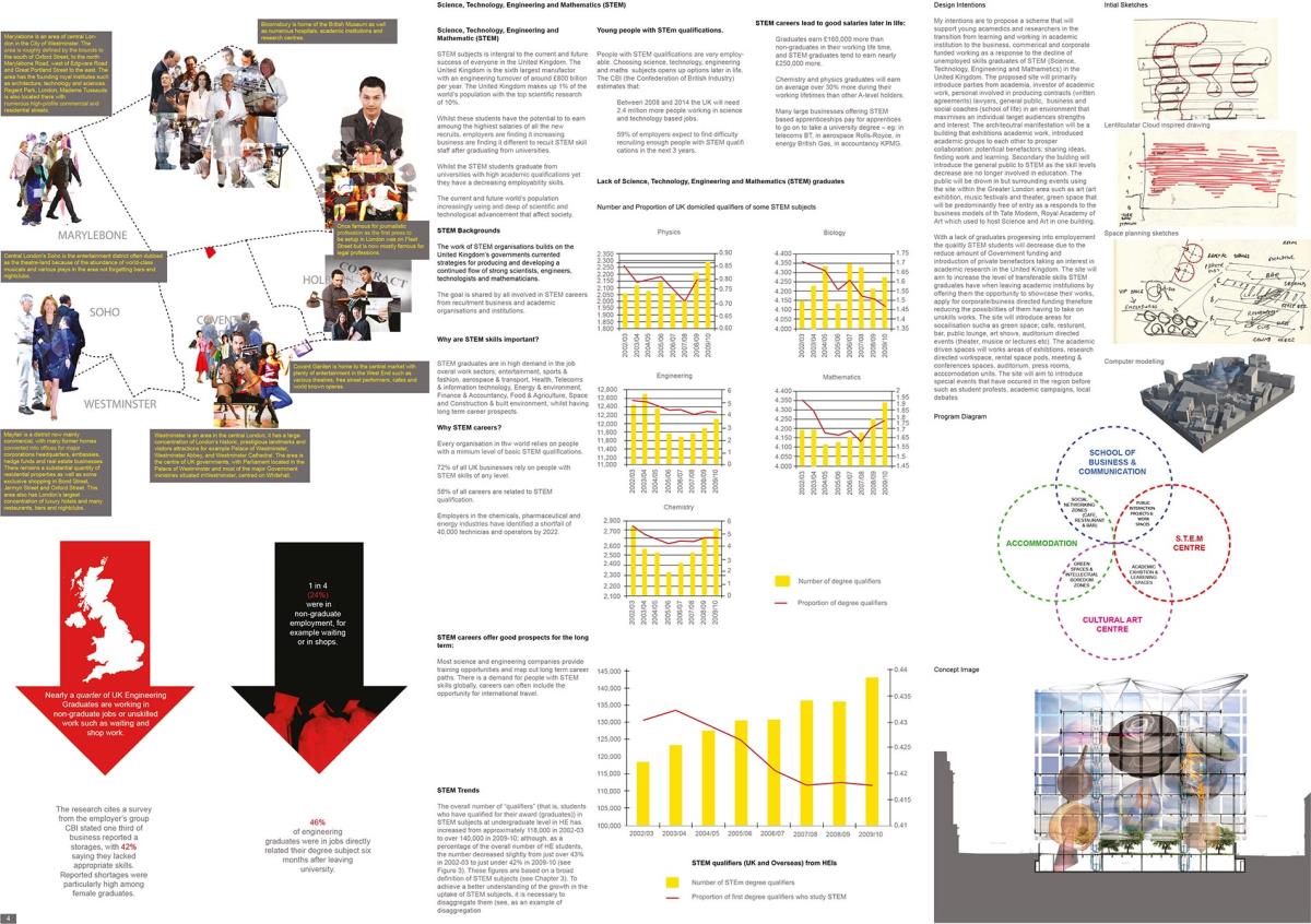 S.T.E.M-OPOLIS Part 1 Project 2013 Jean Paul Tugirimana Ravensbourne University London | UK Completed in 1969, it was used as Royal Mail Sorting Office in New Oxford Street. In the mid-1990s, it was transformed into a venue of the arts and culture. The building continues to provide thousands of square meters of rental space on the ground, first and second floors. The contextual geography of the surrounding wards has an enormous abundance of academic institutions of science, technology, engineering and mathematics that have an impact on future innovation and economic growth of Britain. The site is located be- tween the Bloomsbury Area, Covent Garden, Holborn and Soho areas. These areas are characterised by specific social and economic activities. The Bloombury area has academic institutions; Covent Garden is famous for its central market with plenty of entertainment in the West End such as theatres, street performance and cafes; Holborn is famous for legal professions; Soho is an entertainment district with music, bars and nightclubs.The proposed scheme transforms the former sorting office, now used as arts and culture venue, by adding other facilities. In addition to art and culture, the building would accommodate the National S.T.E.M. Centre (Science, Technology, Engineering, and Mathematics). The centre would welcome talented graduates to showcase their work, would help employers organise recruitments events, and would serve as a venue for investors, benefactors, institutions, and funded organisations interested in talented young people.The venue will host, exhibit, and produce links in order to address issues faced by Britain such as a decreasing number of working STEM graduates and a lack of funding of STEM graduates job search. Furthermore, events such as talks, exhibitions and festivals will help create a wider network of experienced and less experienced academics. The building will expand its current activities in providing a Cultural Art Centre that would collaborate with STEM centre to attract the general public and tourists. Numerous international cultural centres have failed to bring together science, art and technology into once area of innovation, due to the fact that too much attention is focused on areas of arts and design. Tutor(s) Layton Reid