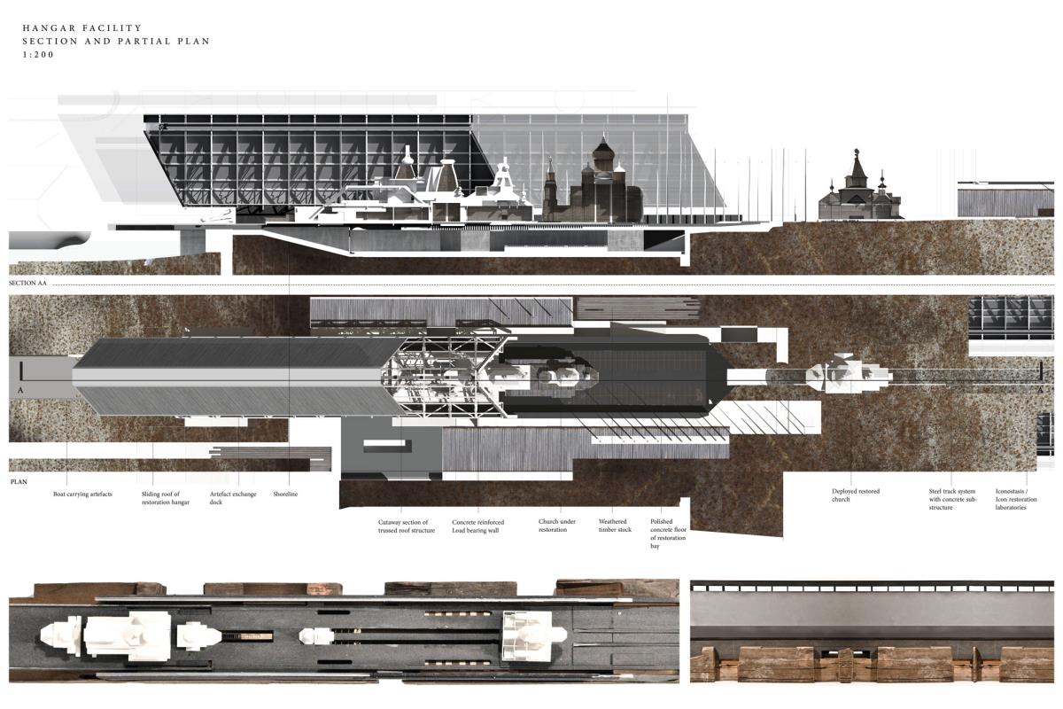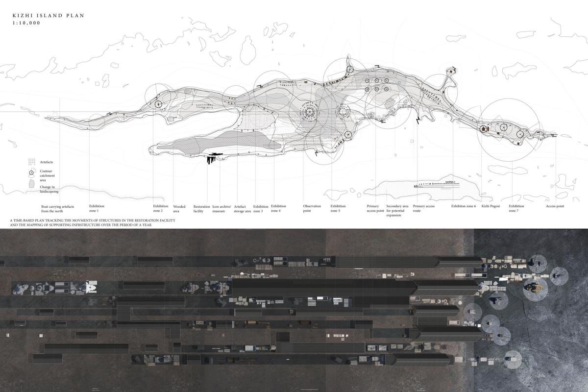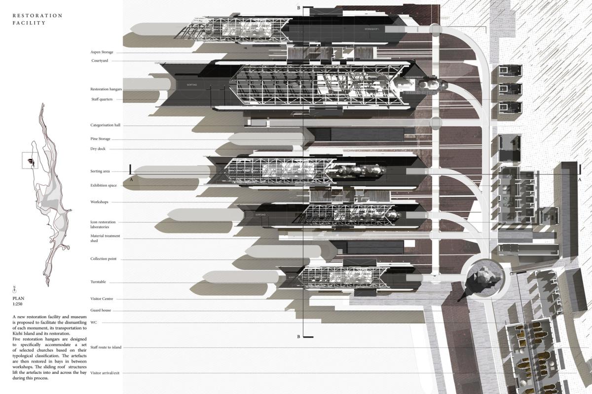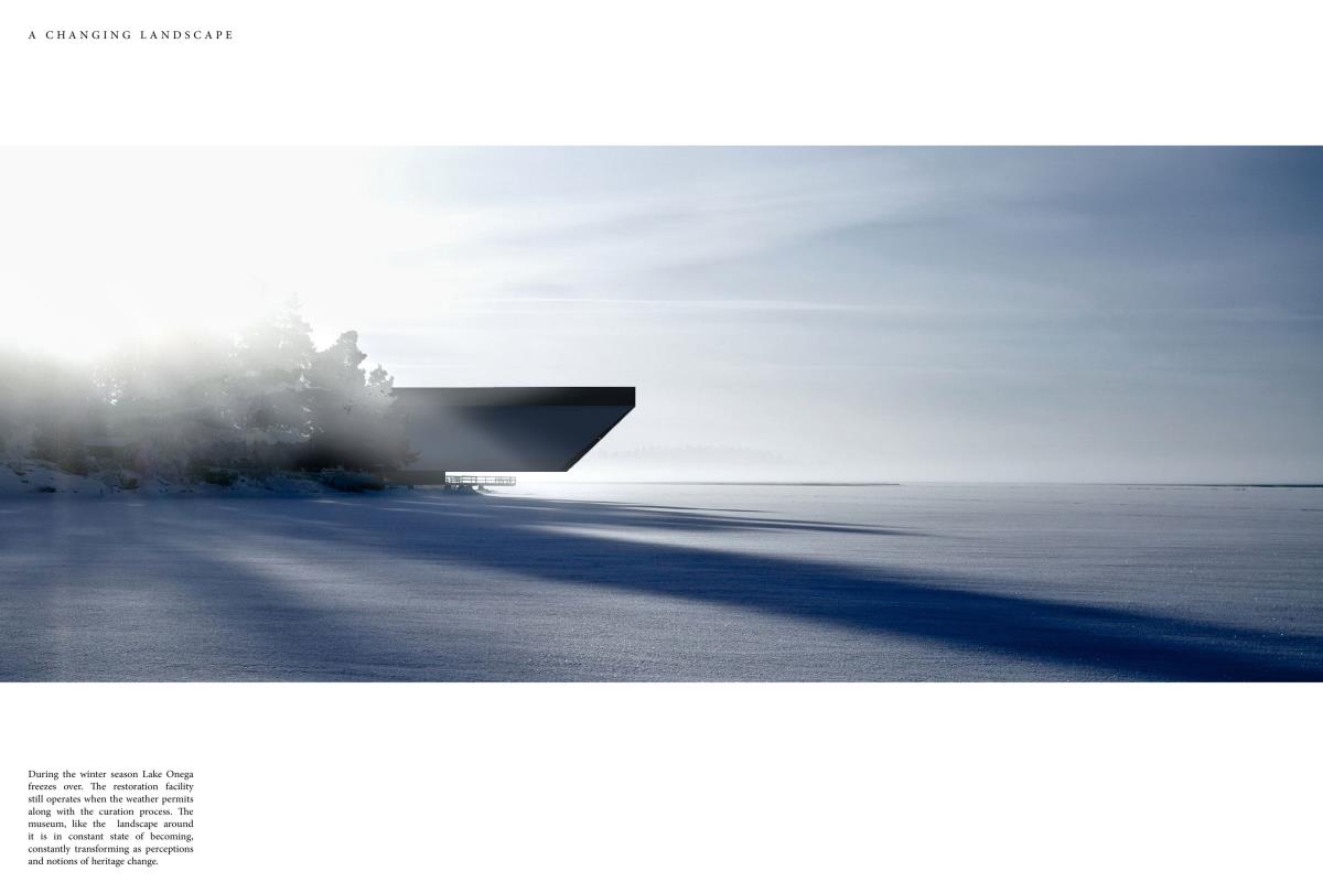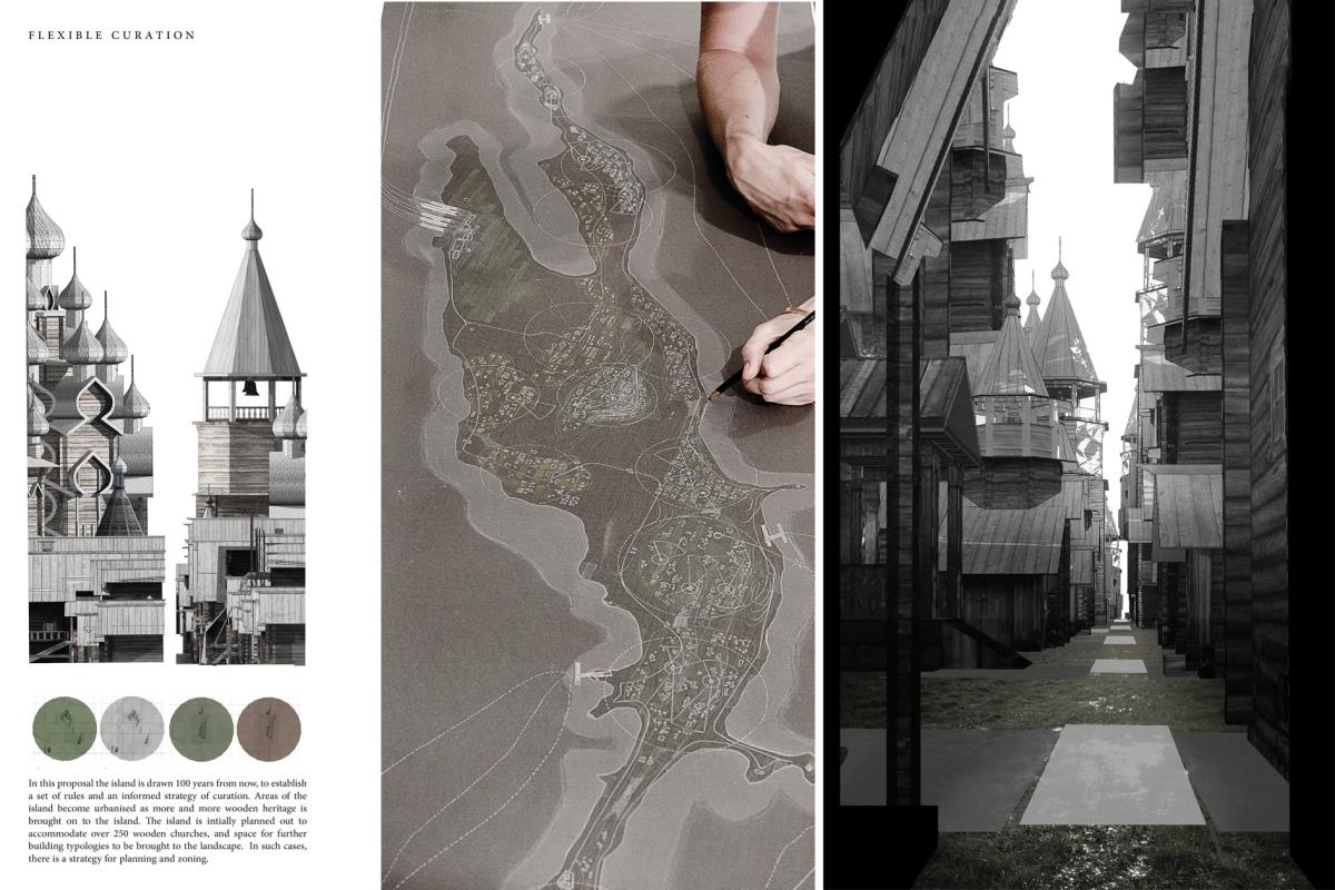 Kizhi Island Part 2 Project 2013 Ben Hayes The Bartlett School of Architecture, UCL | UK This proposal is for a museum landscape that will facilitate the restoration and reassembly of 250 wooden Orthodox churches onto Kizhi Island in Northern Russia.These fragile, desecrated structures have a spiritual presence that commands respect, however, in the next 10-15 years these wooden monuments will almost totally disappear. The churches were once central to their communities, just as the Orthodox faith was central to the people, they speak of the inner lives of the people in this place. This lyrical proposal explores in depth the changing relationship between the Russian landscape and national identity, tracing back the influence of Romanticism at the start of the nineteenth century and looking at the wide scale impact of Soviet collectivisation and de-ruralisation.This project challenges the programme of the existing museum on Kizhi Island and considers a more ambitious architectural intervention, radically expanding it to include all 250 wooden churches. I propose a new restoration facility and museum to facilitate the dismantling of the church monuments from their original location, their transportation to Kizhi via shipping, their restoration and open-air curation across the whole island. The facility will contain temporary and permanent structures for research, storage, preservation and exhibition of each church that has been relocated. The project addresses two problems: it protects and restores this fragile heritage, that today is on the verge of total extinction, and it dramatically redesigns the visitor experience on the island.The intervention adopts an approach to the island’s landscape: the whole island is treated as a repository of protected buildings that is constantly transforming, thus challenging existing notions of preservation and heritage. The new formation of this landscape will be the impetus for the comprehensive study of the buildings and amassing data connected to them. The project is an earnest call for the protection and celebration of this most fragile part of the cultural heritage of Russia. Tutor(s)Dr Yeoryia ManolopoulouMr Niall McLaughlin Michiko Sumi