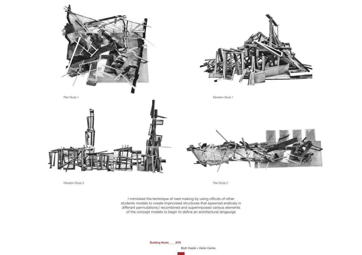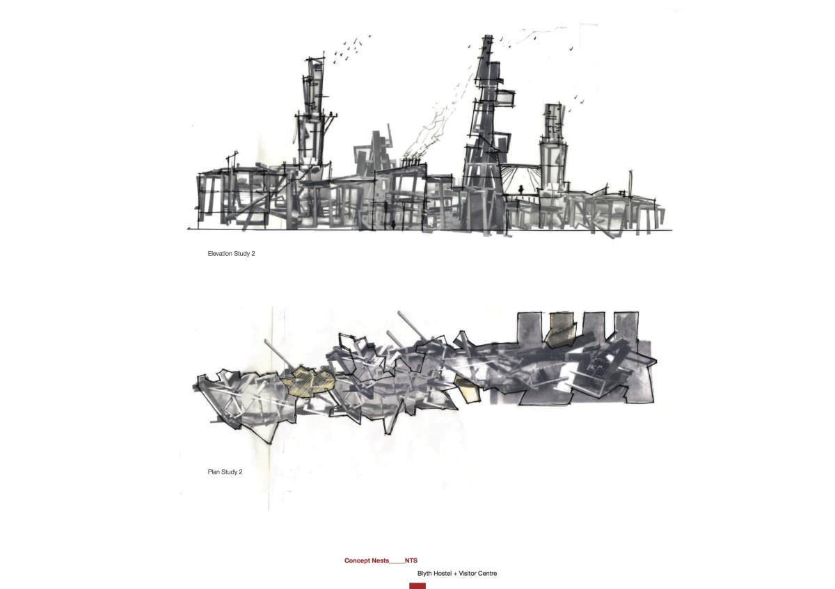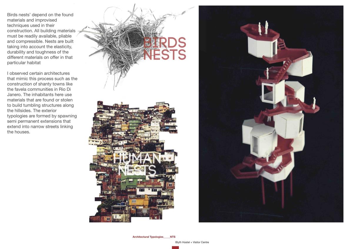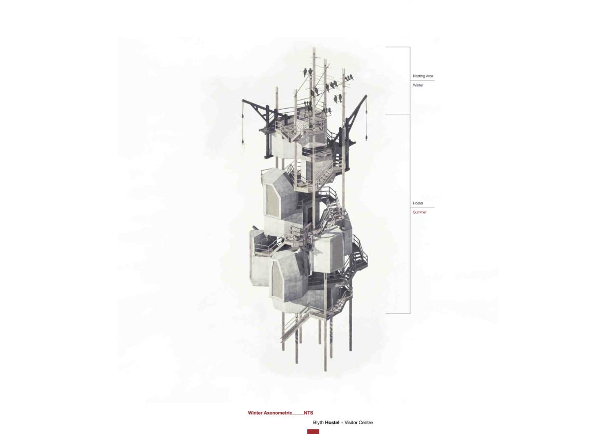 In Praise Of Nests & Other Things Part 1 Project 2013 Thomas Savage Northumbria University Newcastle | UK The project is located on the outskirts of Blyth, the most populous town in Northumberland. The port remains active, but Blyth’s legacy of heavy industry has slowly been replaced with offshore and clean energy technologies. The project seeks to capitalise on the extraordinary, sweeping beaches of the north east coast. A distinct change in visitors and uses occurs between winter and summer. This is highlighted by the project, which switches functions (for its human inhabitants) between bird-watching in winter and spring and water sports in summer and autumn. The scheme provides for both human and avian occupants to take temporary ‘roost’, each during their season.The scheme has two sites: The visitor centre on the banks above the promenade and the hostel towers on the beach and in the water. The two buildings are linked by raised reciprocal views from viewing platforms that wrap around the structures.The hostel towers, located between the high and low tide lines, are exposed steel structures, twisting around concrete pods, framing spectacular views along the Northumbrian coastline. Each level embraces a communal dwelling area where summer occupants can cook and congregate and winter occupants can nest. Large wooden cranes hoist water sports equipment out of the water for the night.The original concept designs were made from off cuts of other architectural models, mimicking the nature of birds’ nests which depend on found materials in their construction. These were photographed, superimposed and recombined to begin to define an architectural language.“so we dip ourselves into the dream world of nests, recreating a surreal atmosphere” Manuel Fonseca Gallego Tutor(s) Sebastian Messer