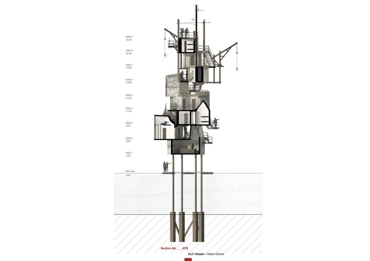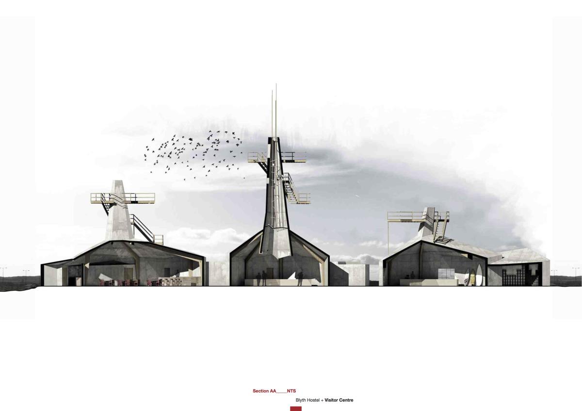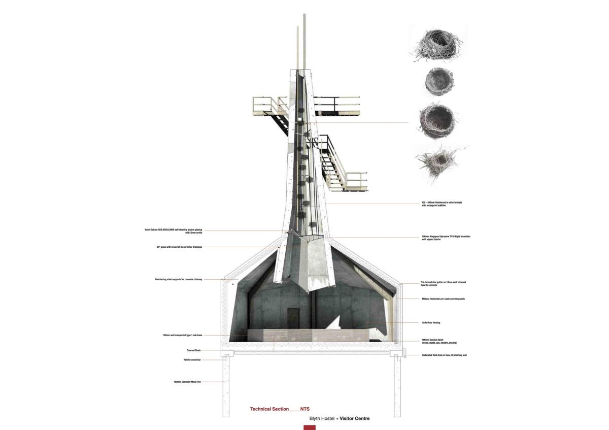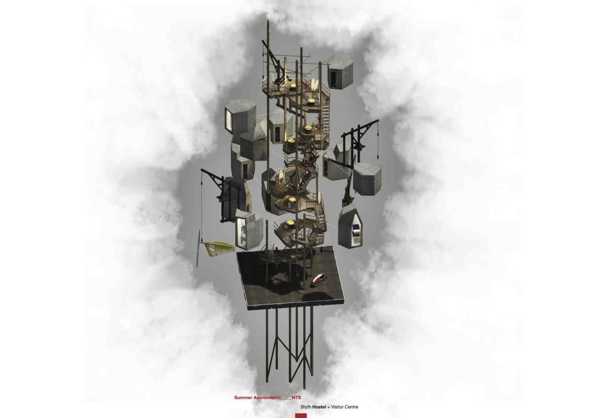 In Praise Of Nests & Other Things Part 1 Project 2013 Thomas Savage Northumbria University Newcastle | UK The project is located on the outskirts of Blyth, the most populous town in Northumberland. The port remains active, but Blyth’s legacy of heavy industry has slowly been replaced with offshore and clean energy technologies. The project seeks to capitalise on the extraordinary, sweeping beaches of the north east coast. A distinct change in visitors and uses occurs between winter and summer. This is highlighted by the project, which switches functions (for its human inhabitants) between bird-watching in winter and spring and water sports in summer and autumn. The scheme provides for both human and avian occupants to take temporary ‘roost’, each during their season.The scheme has two sites: The visitor centre on the banks above the promenade and the hostel towers on the beach and in the water. The two buildings are linked by raised reciprocal views from viewing platforms that wrap around the structures.The hostel towers, located between the high and low tide lines, are exposed steel structures, twisting around concrete pods, framing spectacular views along the Northumbrian coastline. Each level embraces a communal dwelling area where summer occupants can cook and congregate and winter occupants can nest. Large wooden cranes hoist water sports equipment out of the water for the night.The original concept designs were made from off cuts of other architectural models, mimicking the nature of birds’ nests which depend on found materials in their construction. These were photographed, superimposed and recombined to begin to define an architectural language.“so we dip ourselves into the dream world of nests, recreating a surreal atmosphere” Manuel Fonseca Gallego Tutor(s) Sebastian Messer