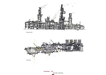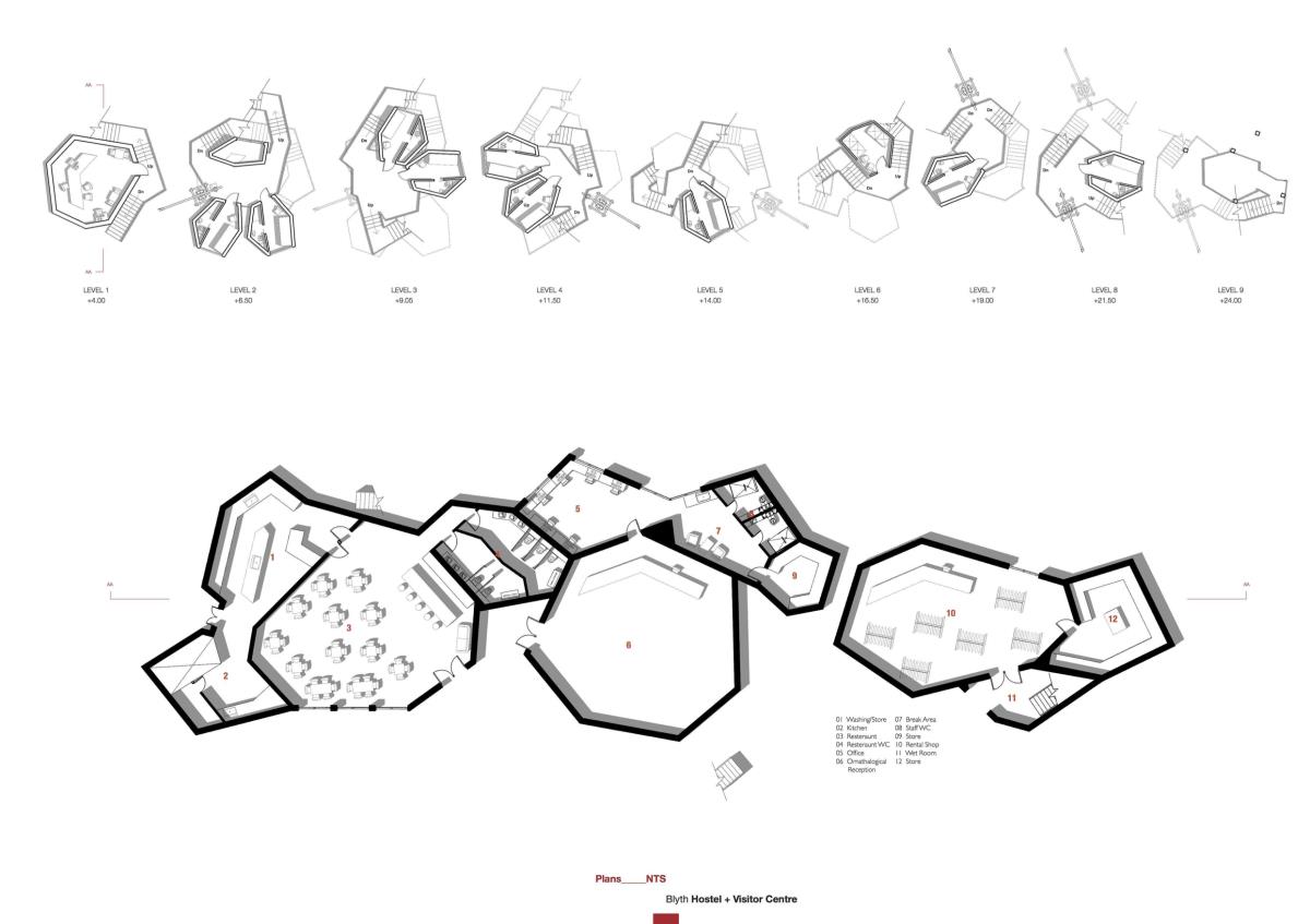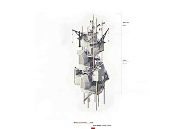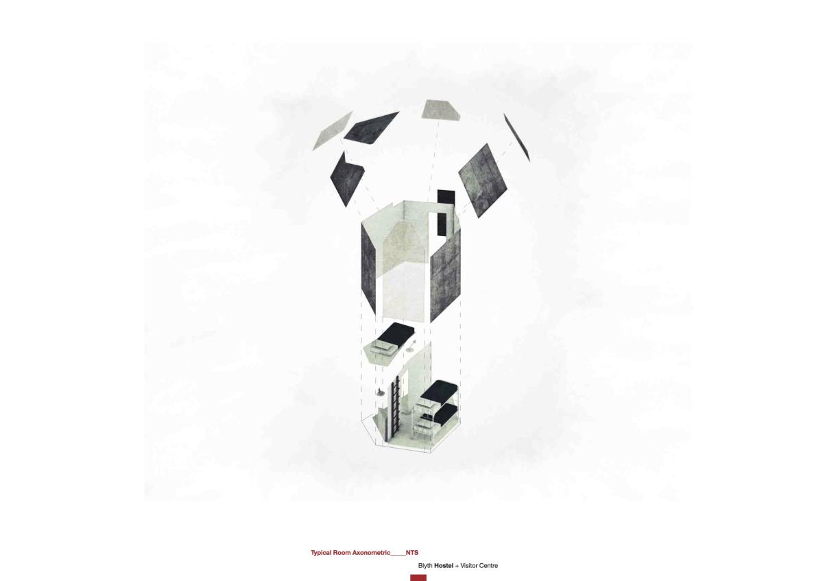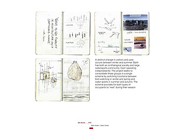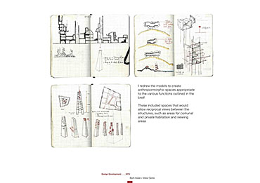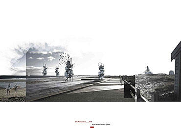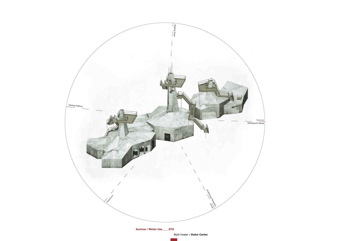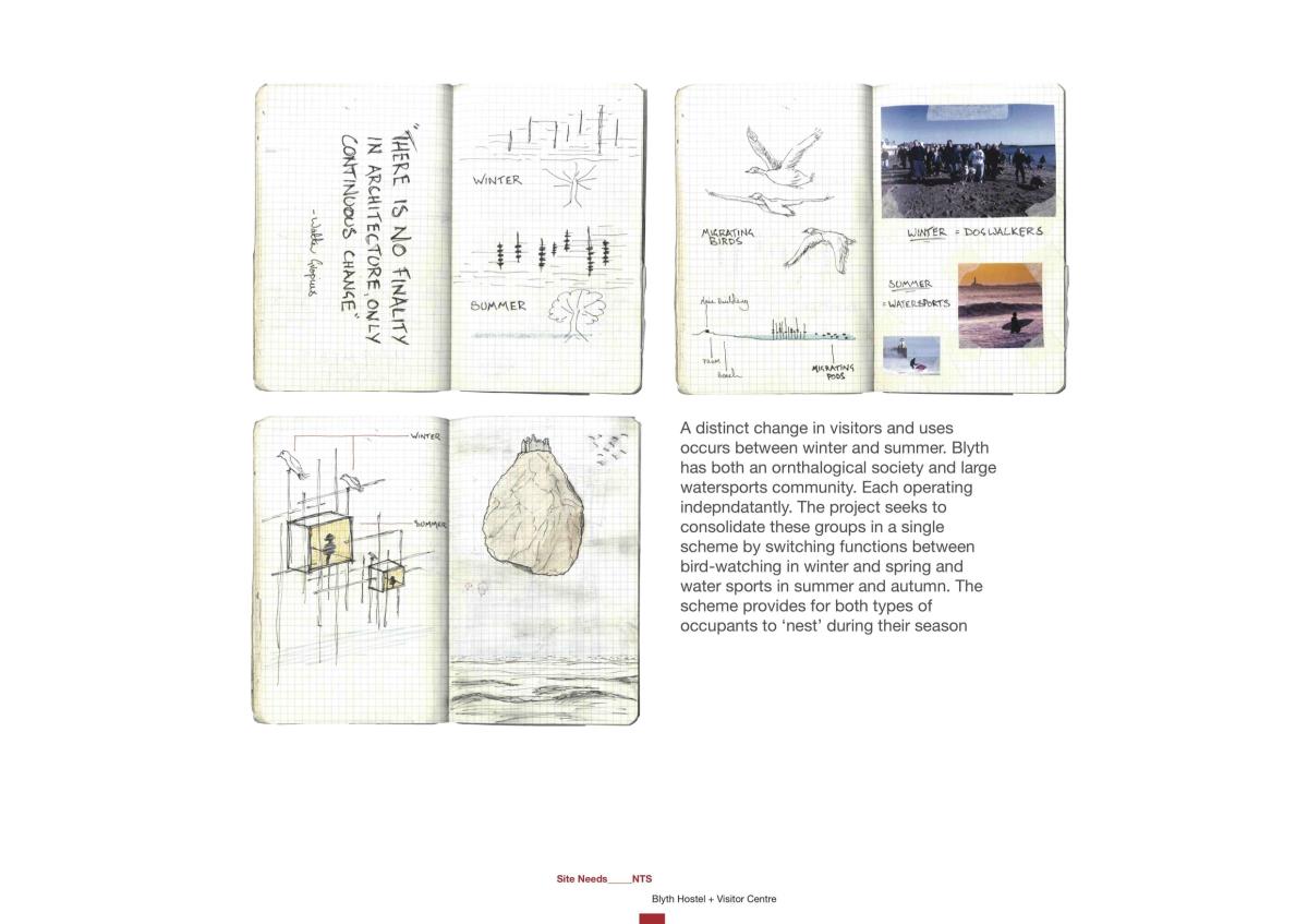 In Praise Of Nests & Other Things Part 1 Project 2013 Thomas Savage Northumbria University Newcastle | UK The project is located on the outskirts of Blyth, the most populous town in Northumberland. The port remains active, but Blyth’s legacy of heavy industry has slowly been replaced with offshore and clean energy technologies. The project seeks to capitalise on the extraordinary, sweeping beaches of the north east coast. A distinct change in visitors and uses occurs between winter and summer. This is highlighted by the project, which switches functions (for its human inhabitants) between bird-watching in winter and spring and water sports in summer and autumn. The scheme provides for both human and avian occupants to take temporary ‘roost’, each during their season.The scheme has two sites: The visitor centre on the banks above the promenade and the hostel towers on the beach and in the water. The two buildings are linked by raised reciprocal views from viewing platforms that wrap around the structures.The hostel towers, located between the high and low tide lines, are exposed steel structures, twisting around concrete pods, framing spectacular views along the Northumbrian coastline. Each level embraces a communal dwelling area where summer occupants can cook and congregate and winter occupants can nest. Large wooden cranes hoist water sports equipment out of the water for the night.The original concept designs were made from off cuts of other architectural models, mimicking the nature of birds’ nests which depend on found materials in their construction. These were photographed, superimposed and recombined to begin to define an architectural language.“so we dip ourselves into the dream world of nests, recreating a surreal atmosphere” Manuel Fonseca Gallego Tutor(s) Sebastian Messer