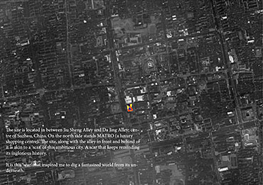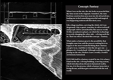 F A N 1348 Part 1 Project 2013 Lijia Bao Xi'an Jiaotong-Liverpool University | China When I was on the site, the place looks so dead that the time seems to be stagnant. Somehow, the rumbustious construction area near my site attracted me, leading me to feel something powerful and magical was happening underneath this dusty area.Like a huge machine, carrying the whole city’s underground. Like a quart, someday, it will reveal itself and people will be astonished by this unseen world. Or like an unknown planet, on which the technology is secretly changing the other side – a living earth for us. That was when I decided this concept – Fantasy.What makes a fantasy great is the possibility that it might come true and the process waiting for it to happen is the most wonderful thing that a fantasy can give to us. And this is what the site gave me – a glimpse of a ‘wonderland’. Nothing was happening on the site, however, I believe I saw a world, a world I envisioned, fantasized.FAN1348 itself is a fantasy created by me. It is a fancy I had on the site. A living building, a moving system, which introduced my dream to fantasized reality. For me, it is the process, which a fantasy turns into a living dream, and then gets connected with the real world. Tutor(s) Theodoros Dounas