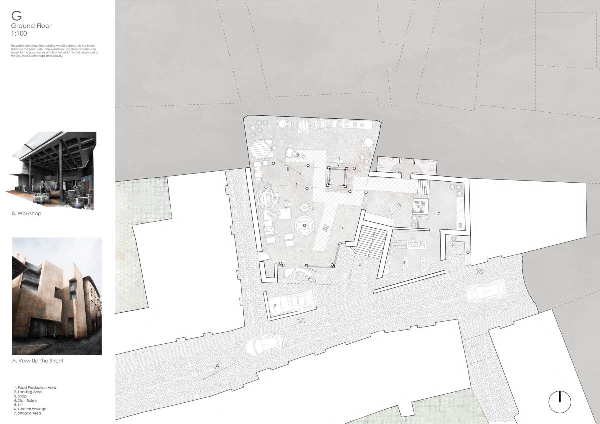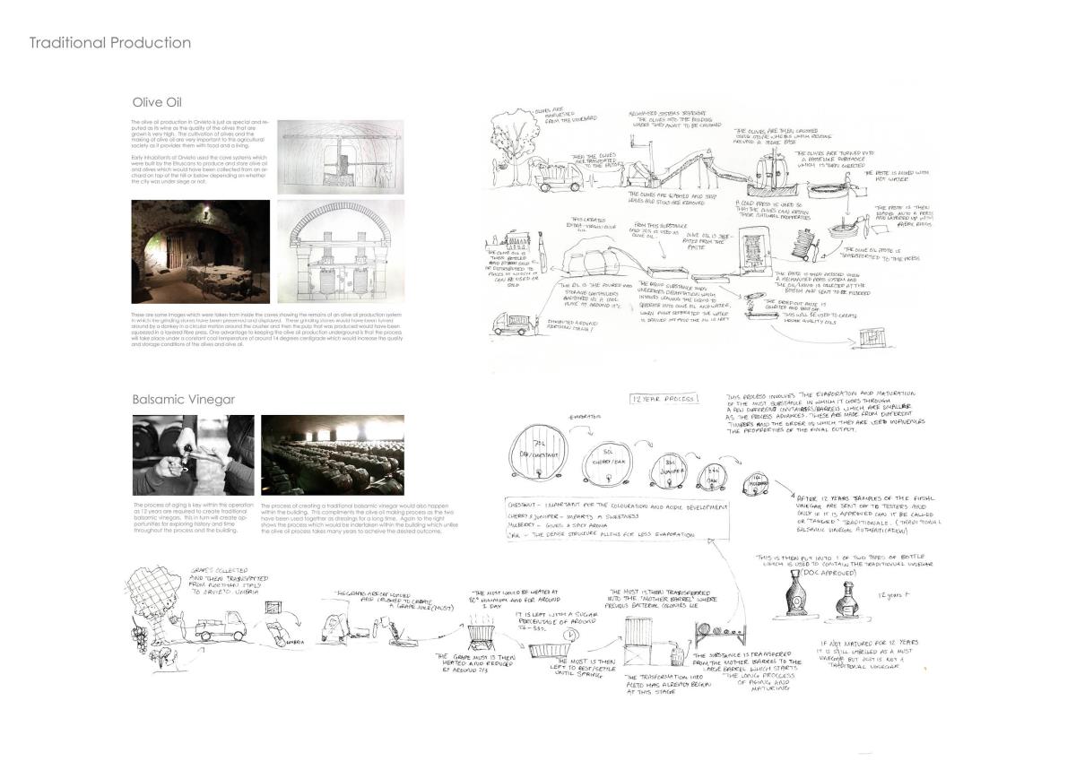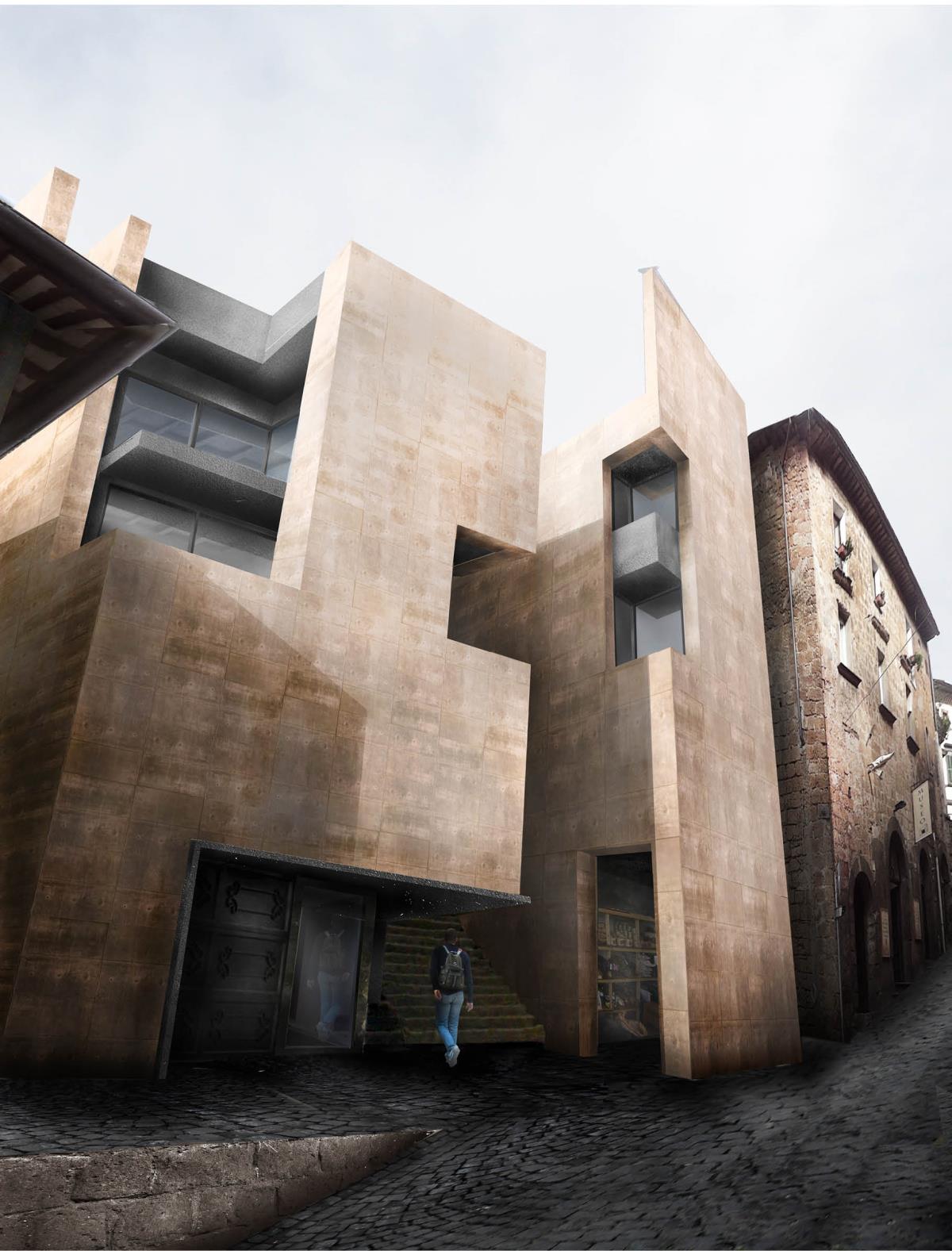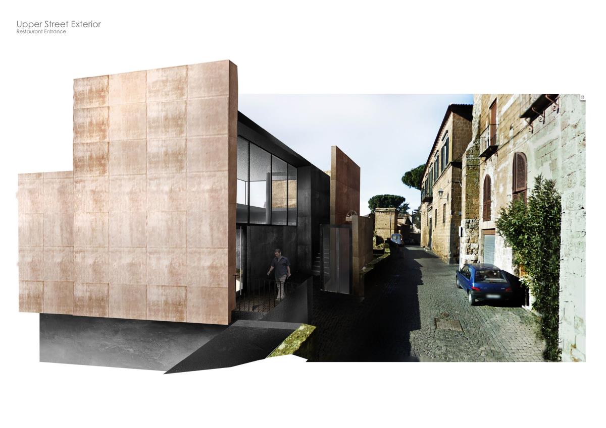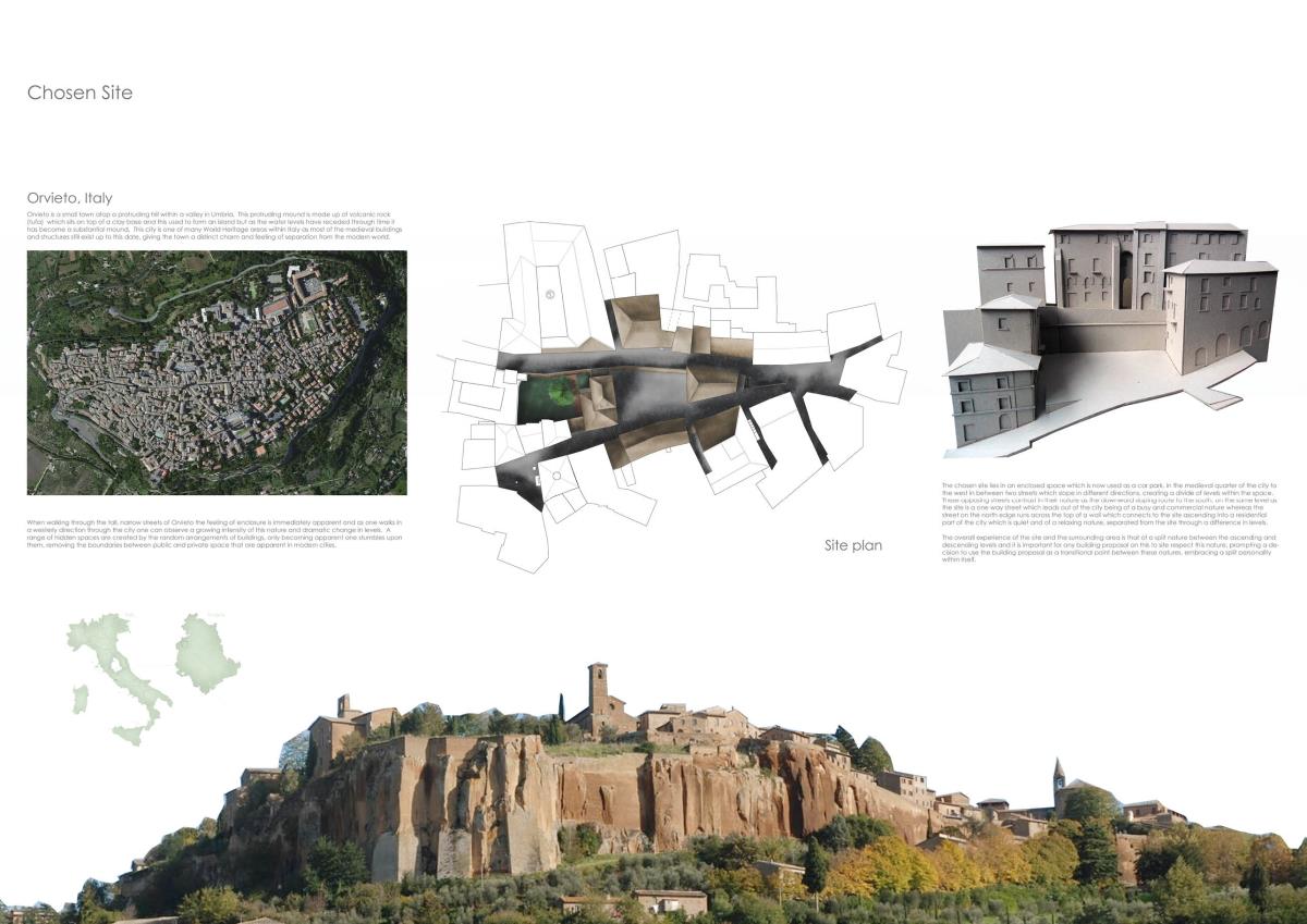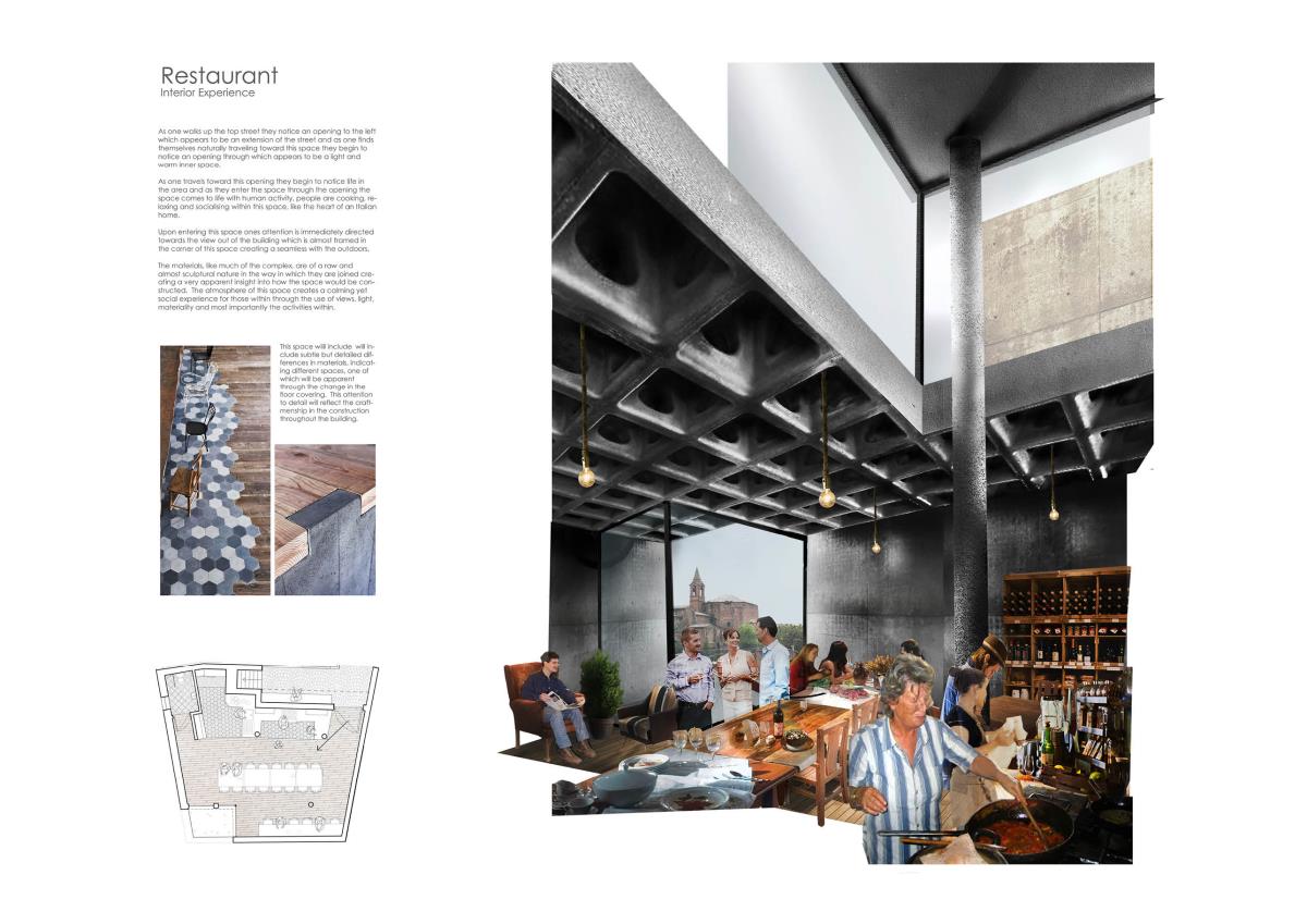 La Pietra (The Stone) Part 1 Project 2013 Thomas Saunders De Montfort University | UK Orvieto hosts a rich variety of local culinary delicacies and food products which can be seen in the shops and restaurants throughout the area, acting as one of the defining features, reflecting the role of food in the culture of its people. It is important that the processes and techniques involved in the creation of these products and dishes are preserved, as Orvieto is a city frozen in time. ‘La Pietra’ would stand in Orvieto as a symbol of defence against cultural change. This also suggests that the building itself is not restricted to one sole use as times change and it may be seen fit for a different purpose in the future. However the name and what it symbolises would live on. The building proposal addresses the link between the two streets which it is connected to, through a public path which one would take to access the different areas of the building. This central passage reflects the nature and journeys experienced throughout daily life in Orvieto, making reference to the random street patterns and the ‘hidden’ spaces created by them. The aim of the proposal is to respect the harmony of the patterns and nature of the surrounding streets and buildings, to act as a transitional point in which the business of the city and the tranquillity of the countryside can be married.The building will house a scheme which will aim to preserve and sustain local culinary tradition and culture through the teaching and preparation of local food products. This will involve the younger generations of Orvieto who are currently struggling to find work within the area, being forced out and away from their families. This scheme will keep these young people in work around the area so that they can remain close to their families keeping the deep rooted family culture of Italy and Umbria alive. Tutor(s) Sam Causer