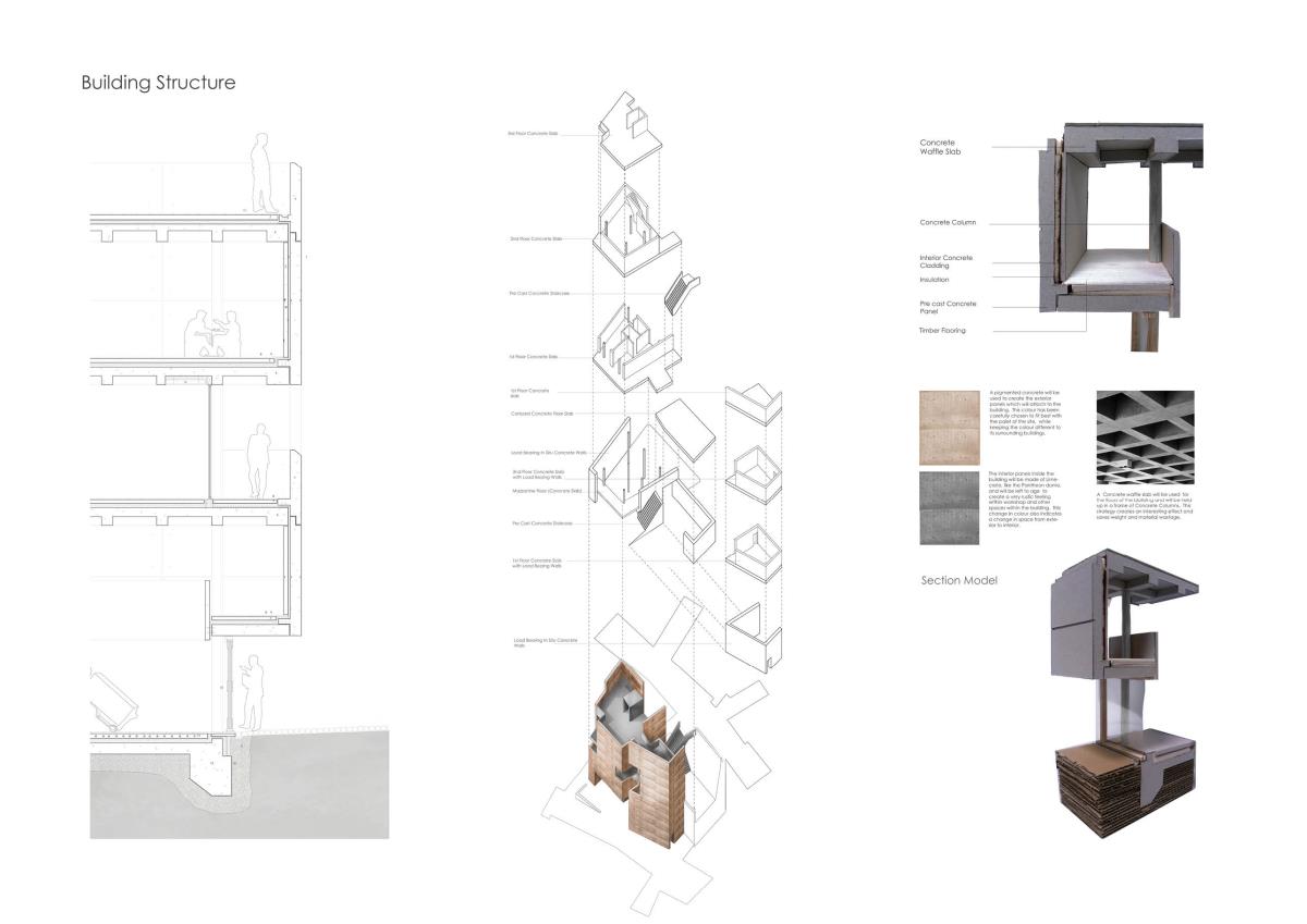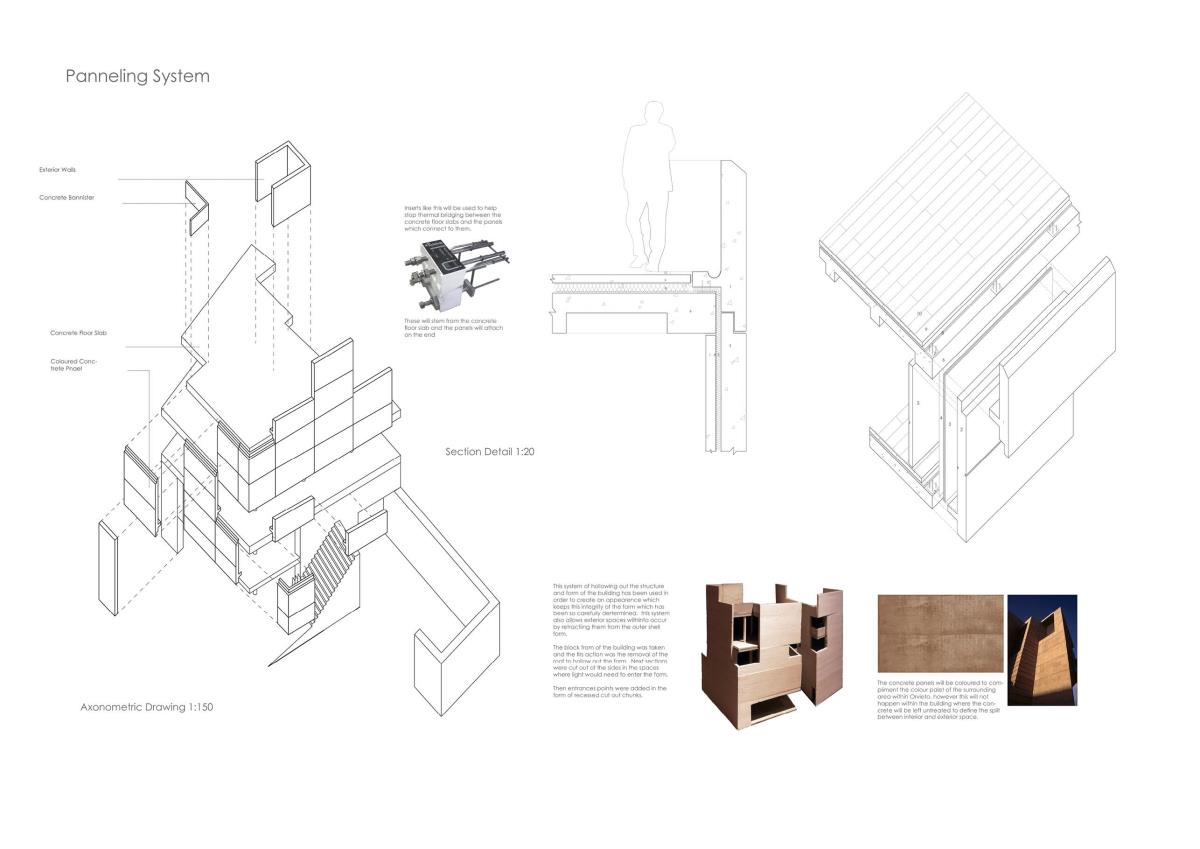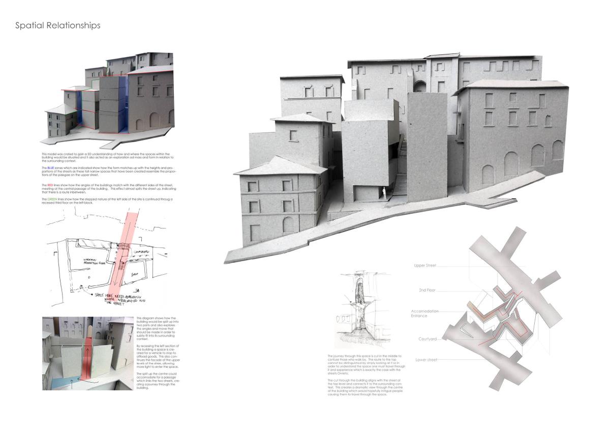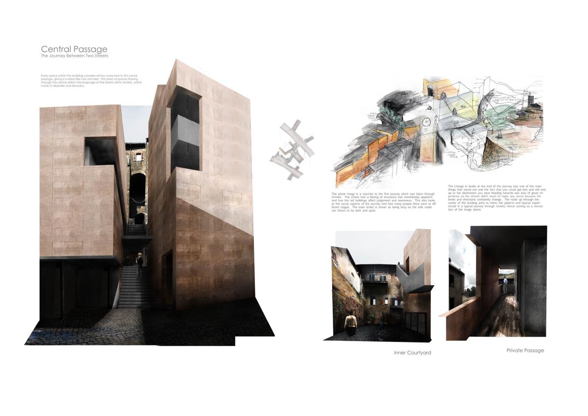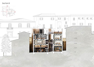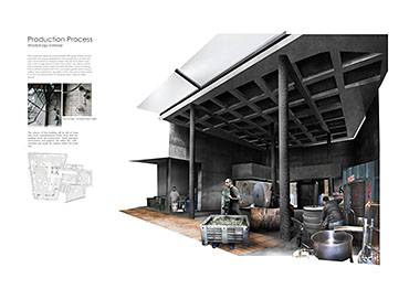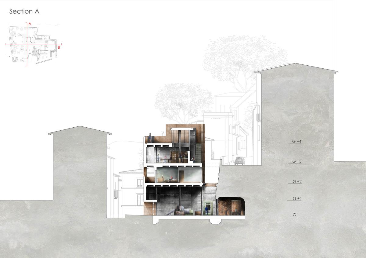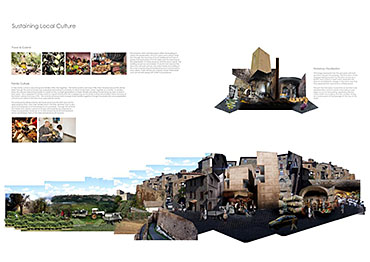 La Pietra (The Stone) Part 1 Project 2013 Thomas Saunders De Montfort University | UK Orvieto hosts a rich variety of local culinary delicacies and food products which can be seen in the shops and restaurants throughout the area, acting as one of the defining features, reflecting the role of food in the culture of its people. It is important that the processes and techniques involved in the creation of these products and dishes are preserved, as Orvieto is a city frozen in time. ‘La Pietra’ would stand in Orvieto as a symbol of defence against cultural change. This also suggests that the building itself is not restricted to one sole use as times change and it may be seen fit for a different purpose in the future. However the name and what it symbolises would live on. The building proposal addresses the link between the two streets which it is connected to, through a public path which one would take to access the different areas of the building. This central passage reflects the nature and journeys experienced throughout daily life in Orvieto, making reference to the random street patterns and the ‘hidden’ spaces created by them. The aim of the proposal is to respect the harmony of the patterns and nature of the surrounding streets and buildings, to act as a transitional point in which the business of the city and the tranquillity of the countryside can be married.The building will house a scheme which will aim to preserve and sustain local culinary tradition and culture through the teaching and preparation of local food products. This will involve the younger generations of Orvieto who are currently struggling to find work within the area, being forced out and away from their families. This scheme will keep these young people in work around the area so that they can remain close to their families keeping the deep rooted family culture of Italy and Umbria alive. Tutor(s) Sam Causer