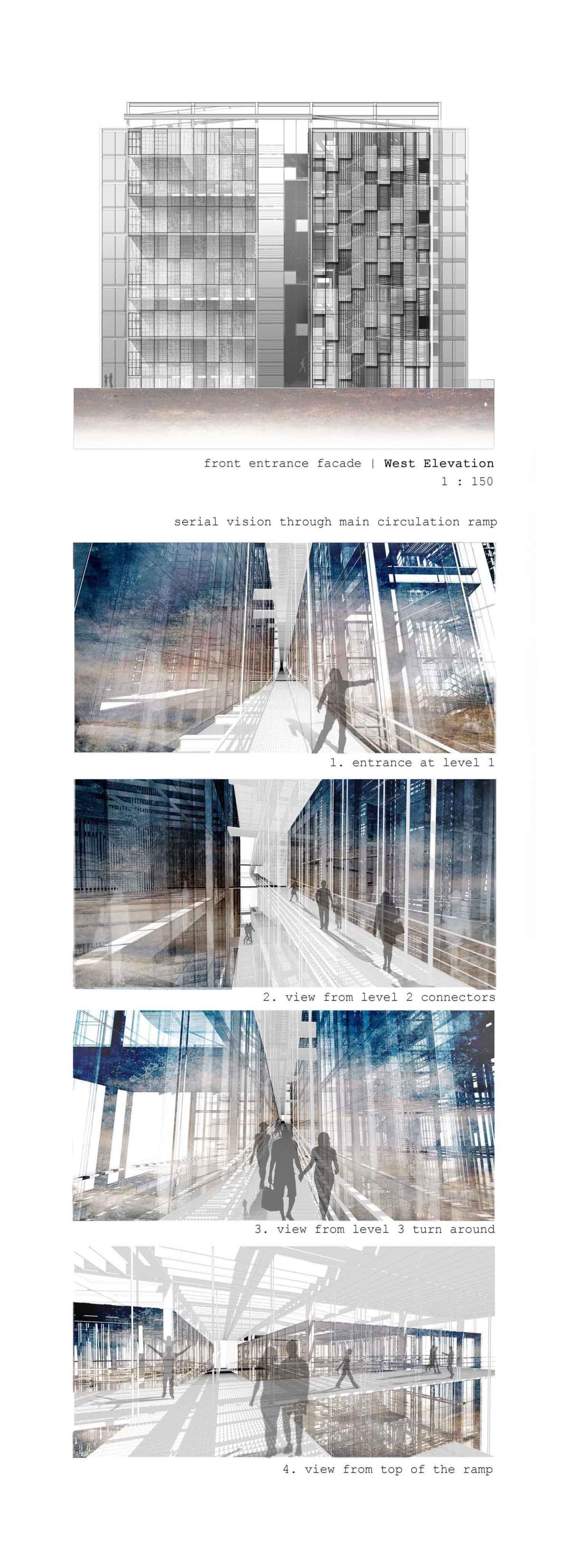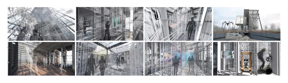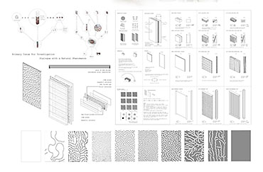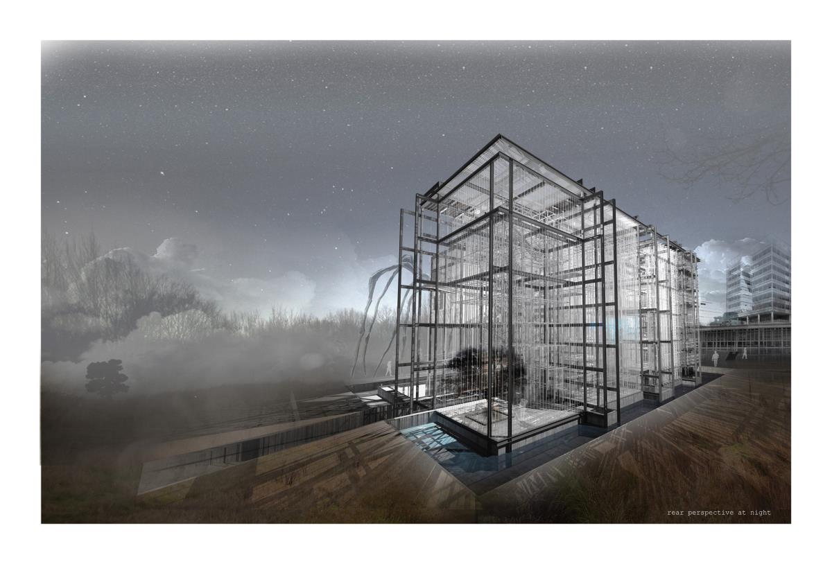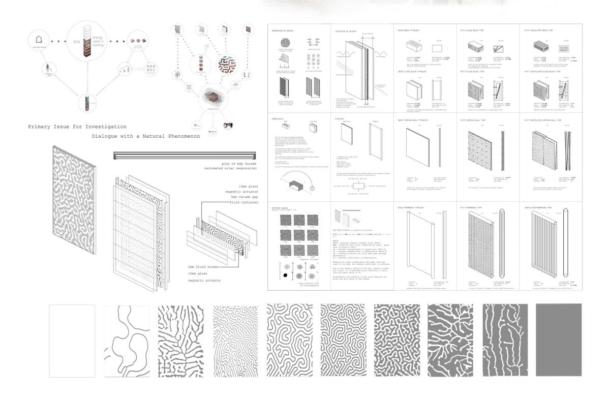 Magnetic Ferrofluid Pattern Facade Technology: Atmospheric light mitigating facade for digital art science museum Part 2 Project 2013 Zi Tong Teo National University of Singapore | Singapore The thesis seeks to engage in a dialogue with a natural phenomenon, operating between the artistic quality of light modification to create a presence in space, as well as the technical invention of solar radiation mitigating system.Natural PhenomenonFaçade technology, particularly curtain wall, is re-examined as the primary source of heat gap through buildings. The materiality and solar heat with the use of magnetism as secondary addition to the curtain wall are investigated. The properties of ferrofluid, a fluid that contains iron, can be magnetized and its loses strength with increasing temperature. The Ferrofluid create a natural labyrinth pattern with different porosity affected by the distance to the magnets.Moving PrintsThe façade is divided into combinations of magnetic fluid containers, each with a 2mm gap of ferrofluid within, and magnetic actuators comprising of small magnets kept in place in two layers that creates an air gap. With the increasing solar heat gain, the actuator is activated and the magnetic fluid spreads across the curtain wall forming a type of solar screening. Electromagnets could be used for manual control of the porosity independant of the heat actuators, for social interaction and atmospheric control.Republic PolytechnicProposed as an extension to and for the residents of the area in woodlands, a digital art science museum with primary servings to the students of the campus of Republic PolytechnicPlaced within the woods, isolated but in grid physically and programmatically with the existing school buildings, the digital art science museum is connected yet distinct architecturally.The museum is kept simply as 8 blocks with each block having different experiential spaces.Museum TypologyEach distinctive block varies in method of deploying the effect of porosity and screening of the m.f.p technology to create spaces which vary in natural light and spaces. The 4.5 of the 8 block strategy is natural ventilated as well as the main circulation ramp.SustainabilityFerrofluid facade as a potential solution for reducing the cooling load of tropical tall buildings. Its light control properties enable new atmospheric spaces to be created with a natural pattern. Tutor(s)Assc. Prof Joseph Lim Ee Man
