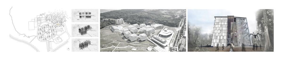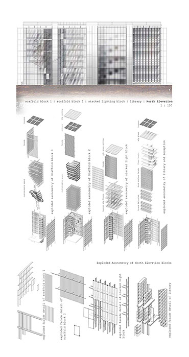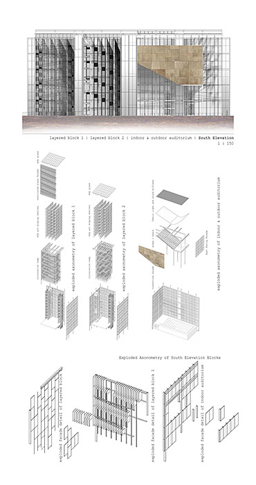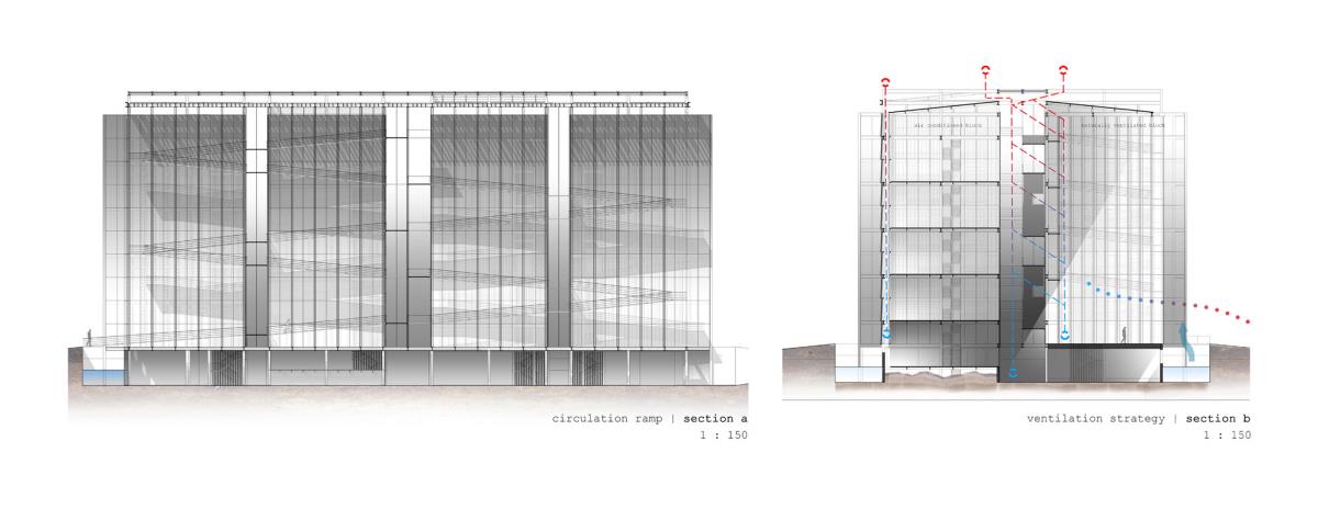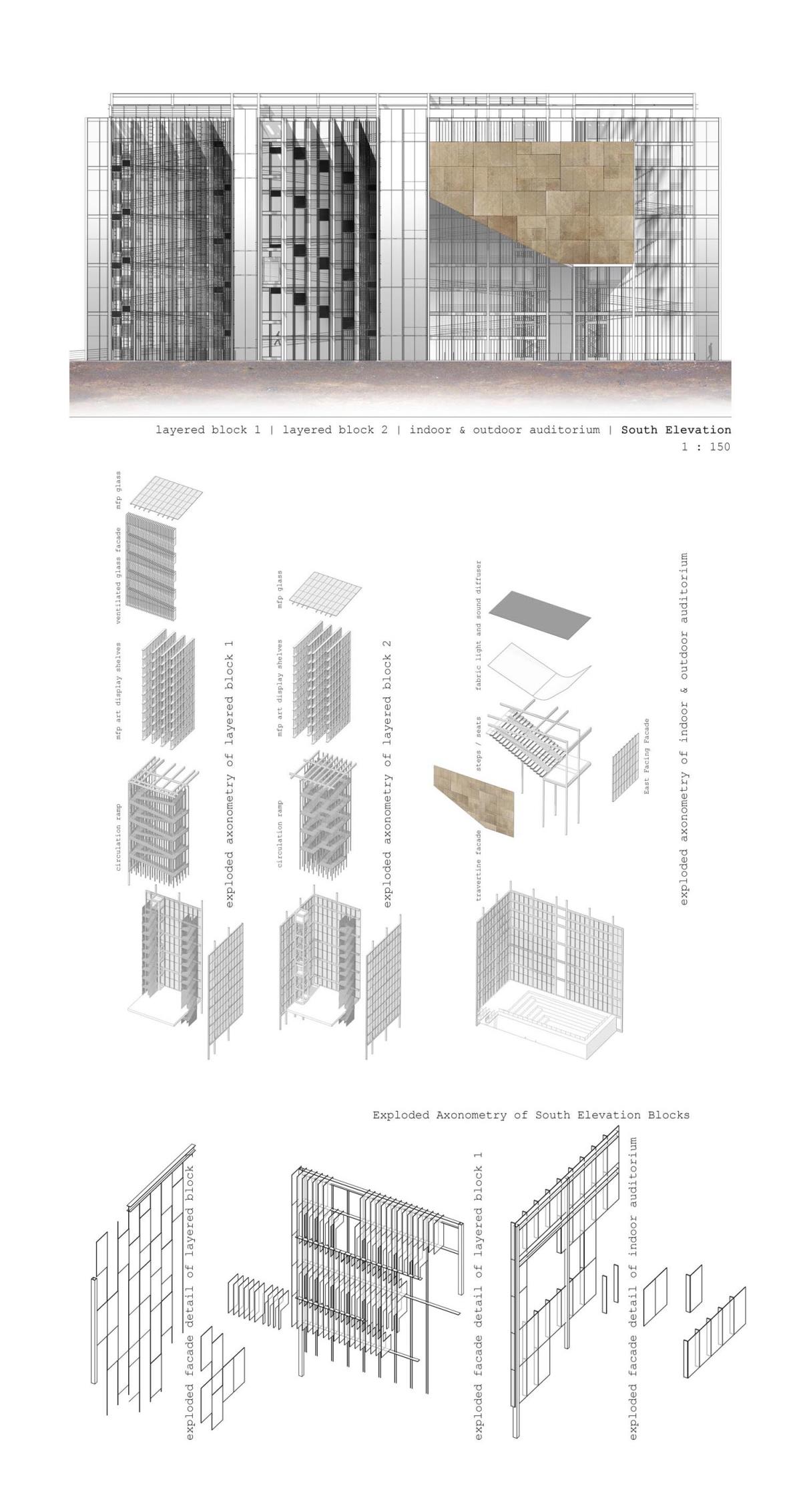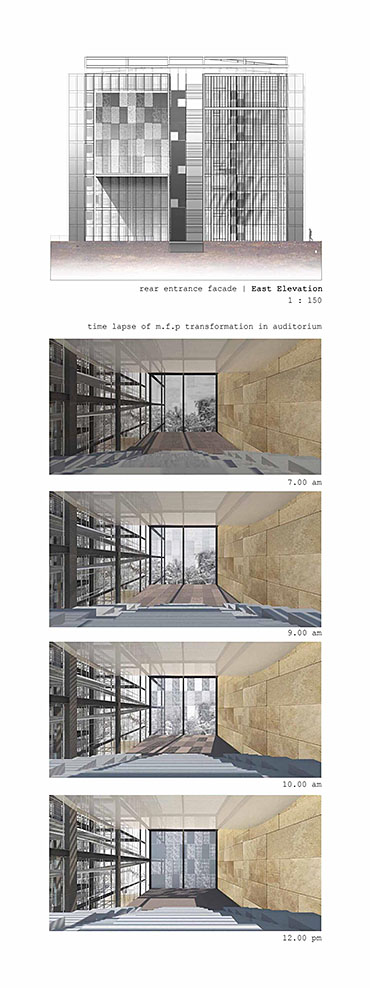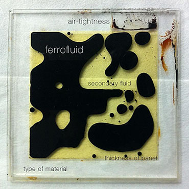 Magnetic Ferrofluid Pattern Facade Technology: Atmospheric light mitigating facade for digital art science museum Part 2 Project 2013 Zi Tong Teo National University of Singapore | Singapore The thesis seeks to engage in a dialogue with a natural phenomenon, operating between the artistic quality of light modification to create a presence in space, as well as the technical invention of solar radiation mitigating system.Natural PhenomenonFaçade technology, particularly curtain wall, is re-examined as the primary source of heat gap through buildings. The materiality and solar heat with the use of magnetism as secondary addition to the curtain wall are investigated. The properties of ferrofluid, a fluid that contains iron, can be magnetized and its loses strength with increasing temperature. The Ferrofluid create a natural labyrinth pattern with different porosity affected by the distance to the magnets.Moving PrintsThe façade is divided into combinations of magnetic fluid containers, each with a 2mm gap of ferrofluid within, and magnetic actuators comprising of small magnets kept in place in two layers that creates an air gap. With the increasing solar heat gain, the actuator is activated and the magnetic fluid spreads across the curtain wall forming a type of solar screening. Electromagnets could be used for manual control of the porosity independant of the heat actuators, for social interaction and atmospheric control.Republic PolytechnicProposed as an extension to and for the residents of the area in woodlands, a digital art science museum with primary servings to the students of the campus of Republic PolytechnicPlaced within the woods, isolated but in grid physically and programmatically with the existing school buildings, the digital art science museum is connected yet distinct architecturally.The museum is kept simply as 8 blocks with each block having different experiential spaces.Museum TypologyEach distinctive block varies in method of deploying the effect of porosity and screening of the m.f.p technology to create spaces which vary in natural light and spaces. The 4.5 of the 8 block strategy is natural ventilated as well as the main circulation ramp.SustainabilityFerrofluid facade as a potential solution for reducing the cooling load of tropical tall buildings. Its light control properties enable new atmospheric spaces to be created with a natural pattern. Tutor(s)Assc. Prof Joseph Lim Ee Man