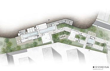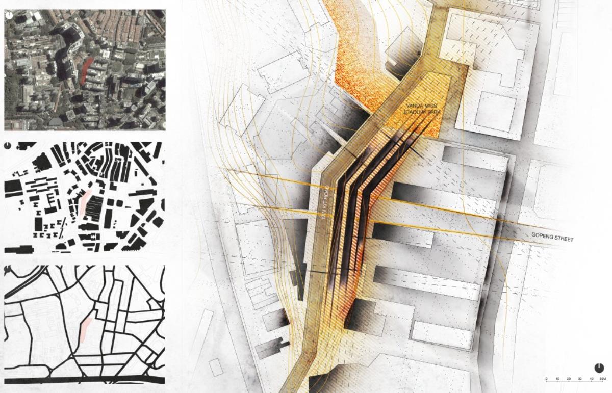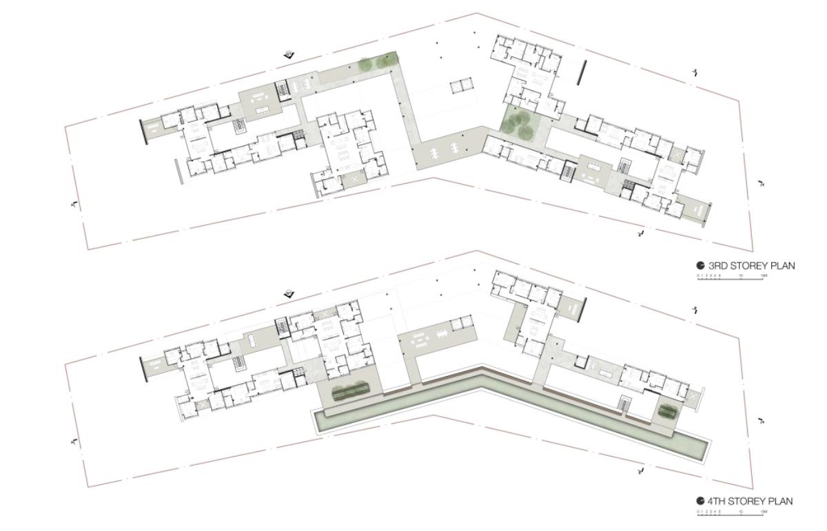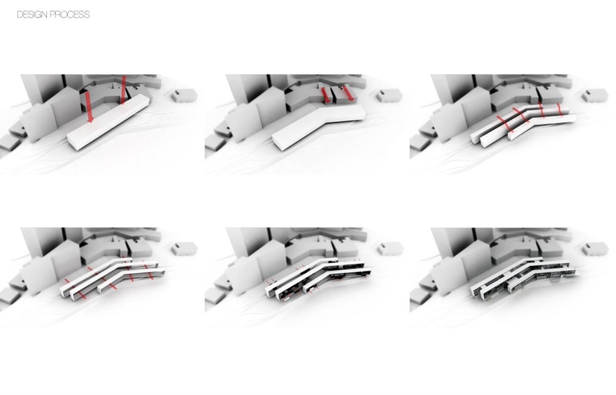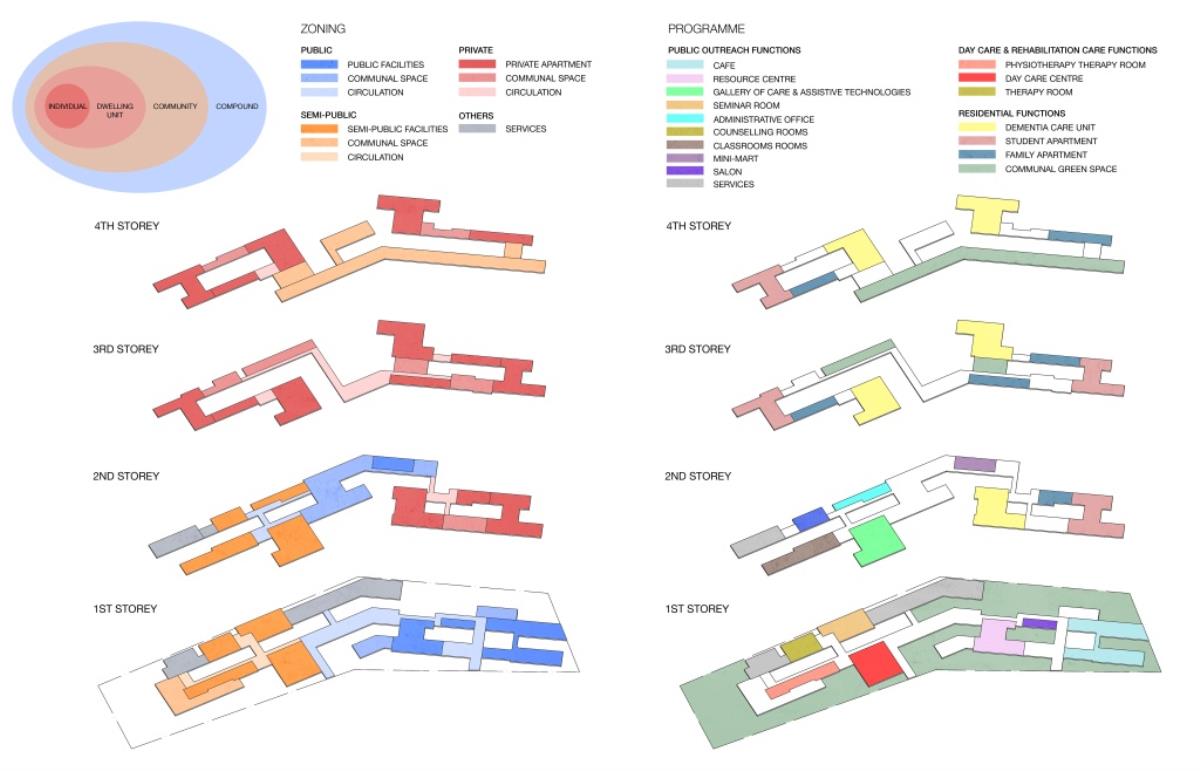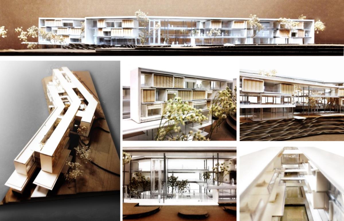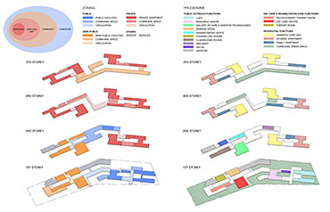 Rest Villa Part 1 Project 2013 Kah Hoe Leong National University of Singapore | Singapore In the pursuit of an emerging new typology of a medical institution, this project endeavours to achieve what is not commonly perceived, by eradicating the stereotypical ideas of what constitutes towards the final built environment. Singapore is currently facing problems of an ageing population; resulting in the pressing demand for elderly care. The project explores possibilities of retaining a sense of normalcy for elderly dementia patients by fabricating non-institutional healing environments within familiar settings whilst engaging them simultaneously with the neighbouring communities through everyday activities. This contemporary development will house the dementia patients, young families and students along with public amenities such as cafés and art galleries.Nestled amongst the high density, high-rise periphery of the central business district of Singapore; the linear Yan Kit Road site is sandwiched between high-rise developments such as the Pinnacle @ Duxton and Tanjong Pagar Complex. The site bore challenging design issues with narrow site constraints, irregular topographical conditions, alongside with towering neighbours, thus the development had to be tailored meticulously with internal linear courtyards and allow for maximum natural ventilation and daylight penetration internally.The project desires to extract the essence of courtyards and communal spaces that attributes to the healing environments of the medical institutions greatly. By imposing the elements together with a supplementary ‘green’ component throughout the design, on each level and within each dwelling unit, it conceives spaces of opportunities for both dementia patients and residents to congregate and socialize. The design of the unconventional institution is expressed by three bands spanning across the tapered site, each band containing a vertically extruded frame, functioning as a framework for the horizontal insertion of boxes of dwelling units and facilities. The installation of full height vertical bi-folding screens allows for porosity and openness, which exemplifies the notion for limitless visual communication between residents and their surroundings. The encompassment of young families, students and the public in a dementia institution, alters the presumption of a singular function for such facilities. The incorporation of various groups challenges the design to be made universal and all-inclusive, both architecturally and socially. Tutor(s) Peter Sim