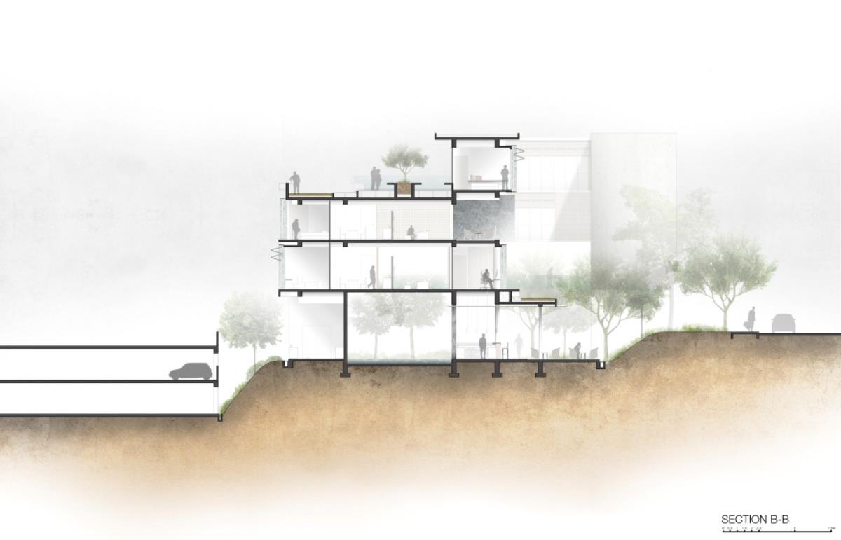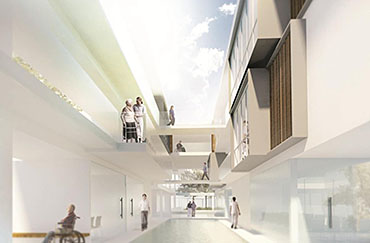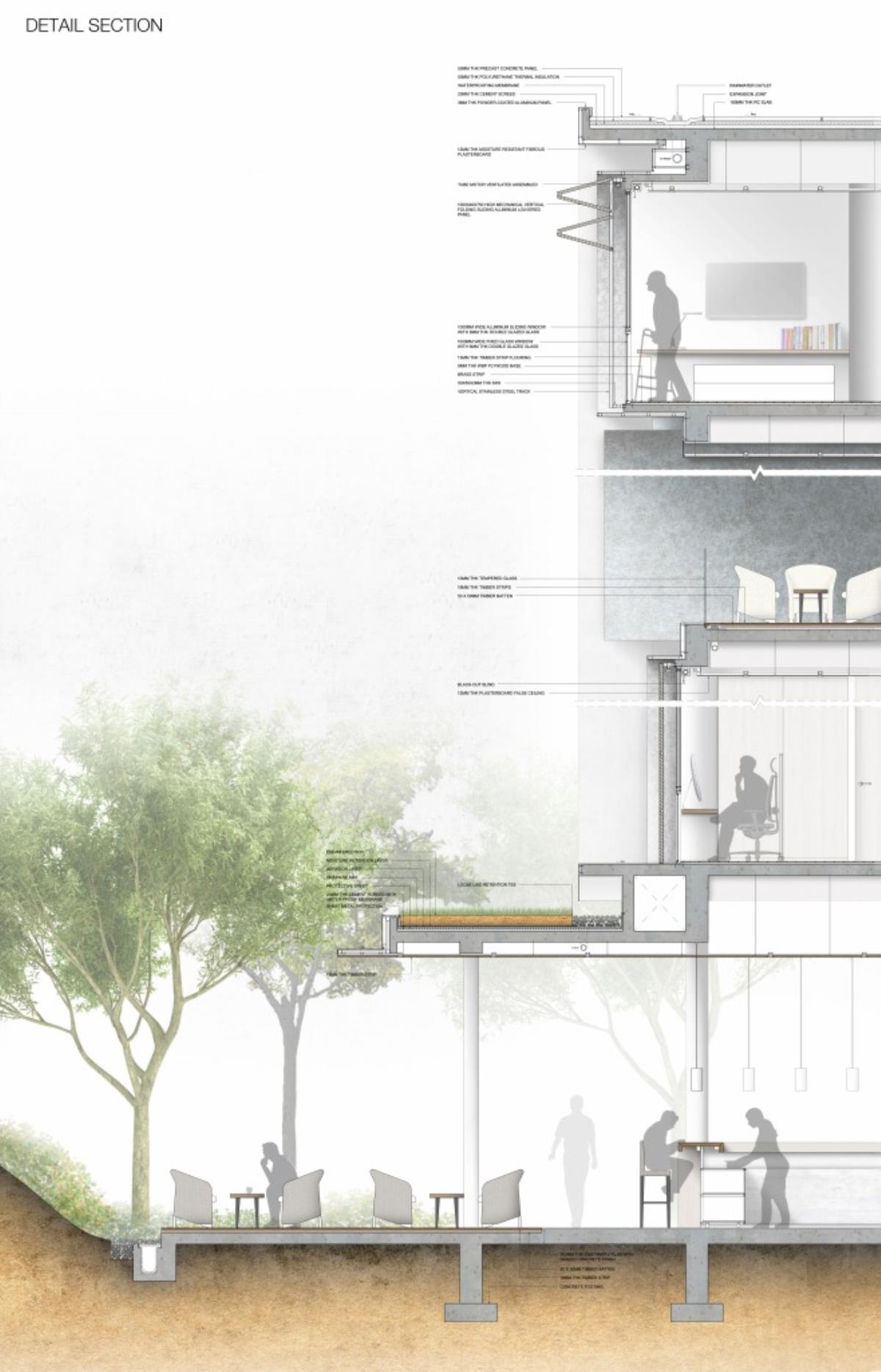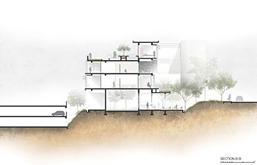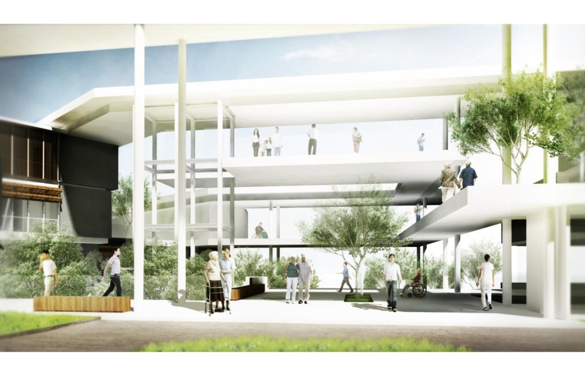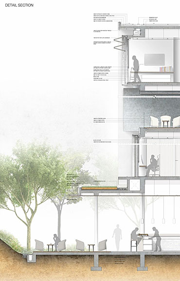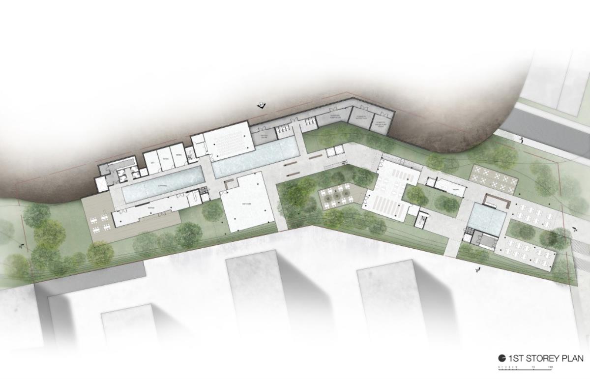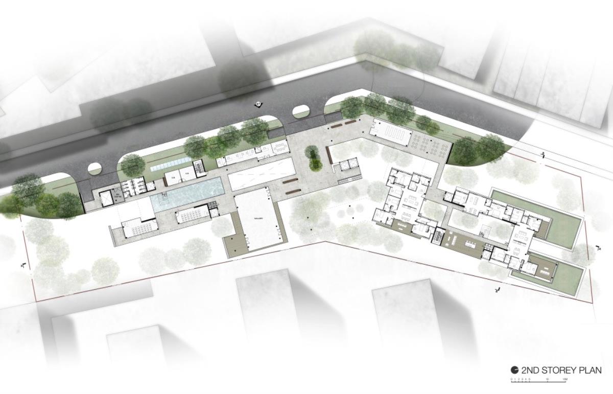 Rest Villa Part 1 Project 2013 Kah Hoe Leong National University of Singapore | Singapore In the pursuit of an emerging new typology of a medical institution, this project endeavours to achieve what is not commonly perceived, by eradicating the stereotypical ideas of what constitutes towards the final built environment. Singapore is currently facing problems of an ageing population; resulting in the pressing demand for elderly care. The project explores possibilities of retaining a sense of normalcy for elderly dementia patients by fabricating non-institutional healing environments within familiar settings whilst engaging them simultaneously with the neighbouring communities through everyday activities. This contemporary development will house the dementia patients, young families and students along with public amenities such as cafés and art galleries.Nestled amongst the high density, high-rise periphery of the central business district of Singapore; the linear Yan Kit Road site is sandwiched between high-rise developments such as the Pinnacle @ Duxton and Tanjong Pagar Complex. The site bore challenging design issues with narrow site constraints, irregular topographical conditions, alongside with towering neighbours, thus the development had to be tailored meticulously with internal linear courtyards and allow for maximum natural ventilation and daylight penetration internally.The project desires to extract the essence of courtyards and communal spaces that attributes to the healing environments of the medical institutions greatly. By imposing the elements together with a supplementary ‘green’ component throughout the design, on each level and within each dwelling unit, it conceives spaces of opportunities for both dementia patients and residents to congregate and socialize. The design of the unconventional institution is expressed by three bands spanning across the tapered site, each band containing a vertically extruded frame, functioning as a framework for the horizontal insertion of boxes of dwelling units and facilities. The installation of full height vertical bi-folding screens allows for porosity and openness, which exemplifies the notion for limitless visual communication between residents and their surroundings. The encompassment of young families, students and the public in a dementia institution, alters the presumption of a singular function for such facilities. The incorporation of various groups challenges the design to be made universal and all-inclusive, both architecturally and socially. Tutor(s) Peter Sim
