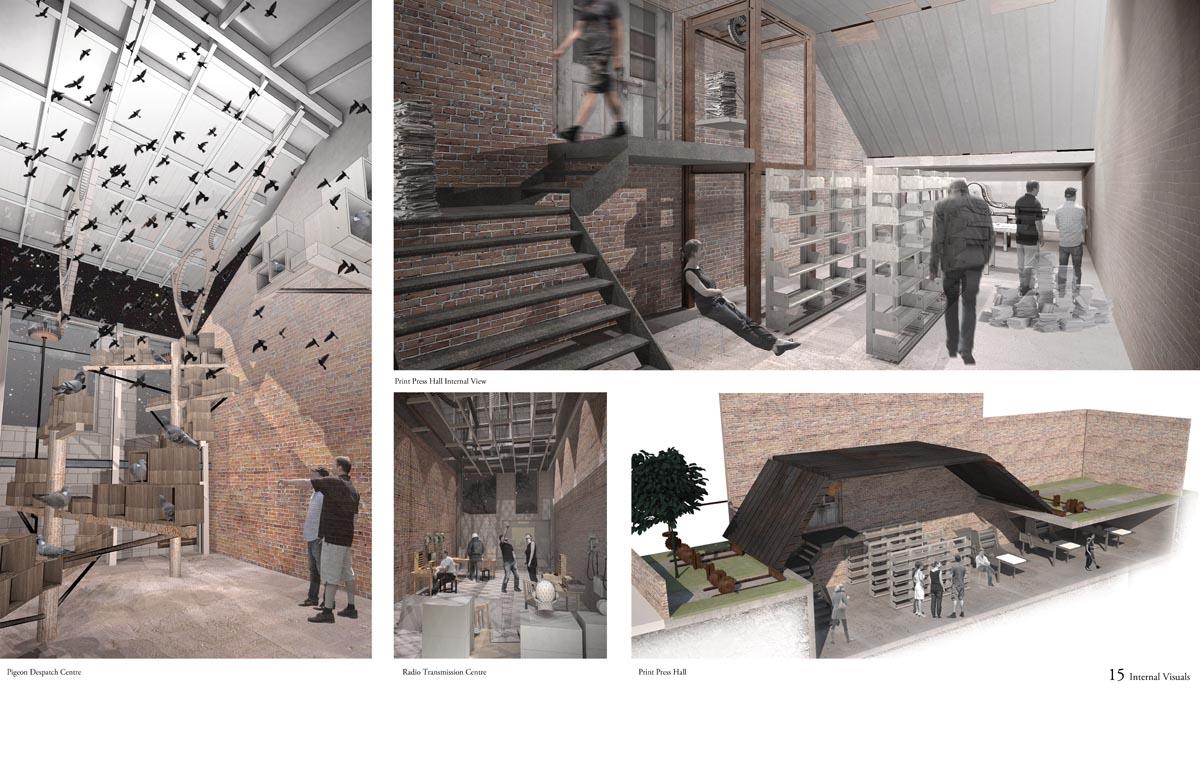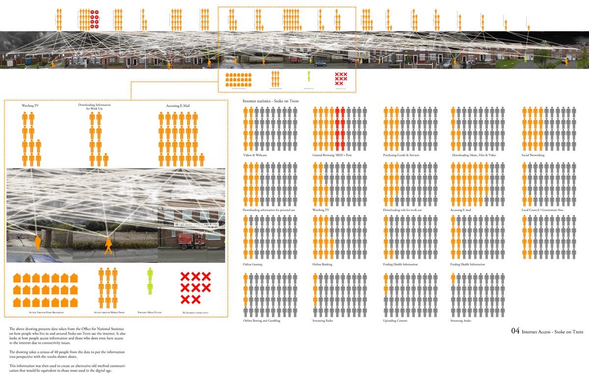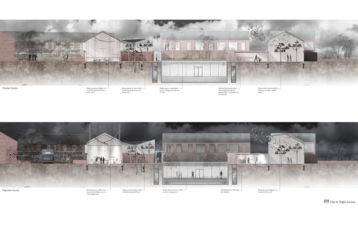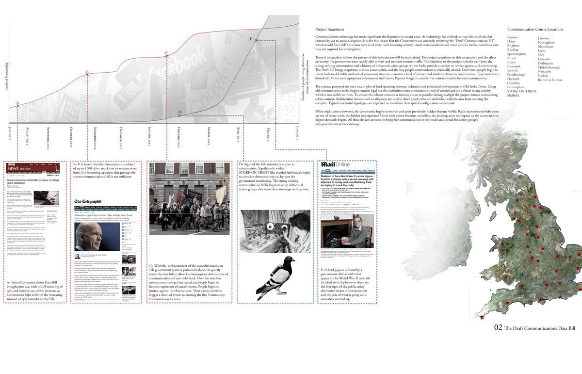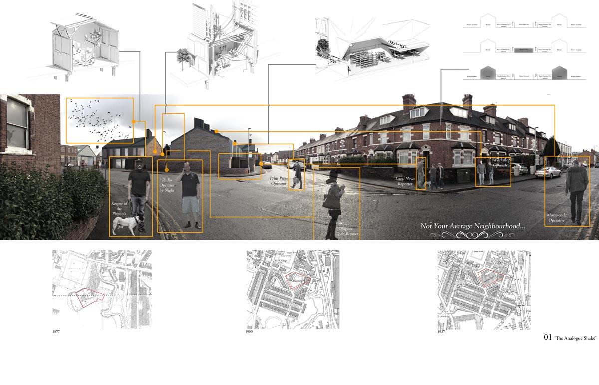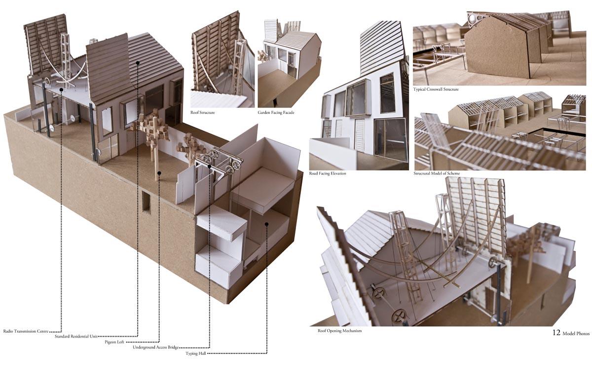 Analogue Shake Part 1 Project 2013 Michael Day Birmingham City University | UK Communication technology has made significant developments in recent years. As technology has evolved, so have the methods that criminality use to cause disruption. It is for this reason that the Government are currently reviewing the “Draft Communications Bill” which would force ISP’s to retain records of every users browsing activity, email correspondence and voice calls for twelve months in case they are required for investigation.There is uncertainty to how the privacy of this information will be maintained. The project speculates on this uncertainty and the effect on society if a government were readily able to view and monitor internet traffic. The backdrop to this project is Stoke-on-Trent, the strong existing communities and a history of influential action groups within Stoke provide a catalyst to revoke against such monitoring. The Draft Bill brings scepticism to these communities and the way people communicate is drastically altered. Over time, people begin to revert back to old stable methods of communications to maintain a level of privacy and solidarity between communities. Type-writers are dusted off, Morse code equipment rejuvenated and Carrier Pigeons bought to enable free communication between communities.The scheme proposed sits on a vacant plot of land spanning between industrial and residential development in Old Stoke Town. Using old communicative technologies remains legal but the authorities want to maintain a level of control and see a threat to any activity which is not visible to them. To ensure the scheme remains as inconspicuous as possible during daylight the project mimics surrounding urban context. Architectural devices such as alleyways are used to deter people who are unfamiliar with the area from entering the complex. Typical residential typologies are exploited to transform their spatial configuration on demand.When night comes however, the community begins to morph and areas previously hidden become visible. Radio transmission hubs open up out of house roofs, the hidden underground Morse code centre becomes accessible, the printing press roof opens up for access and the pigeon despatch begins. All these devices are used to bring free communication to the locals and spread the action group’s anti-government privacy message. Tutor(s)Mr Kevin W Singh Jim Sloan