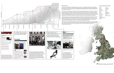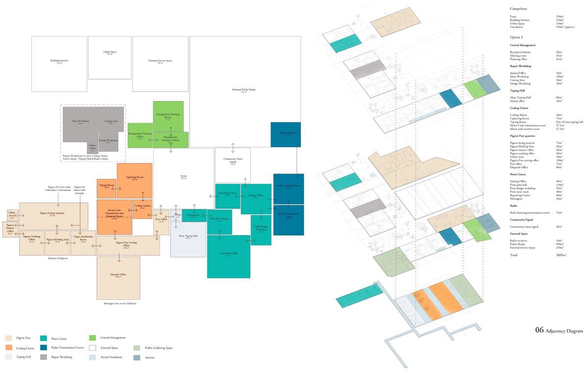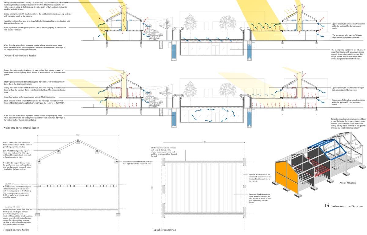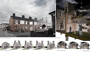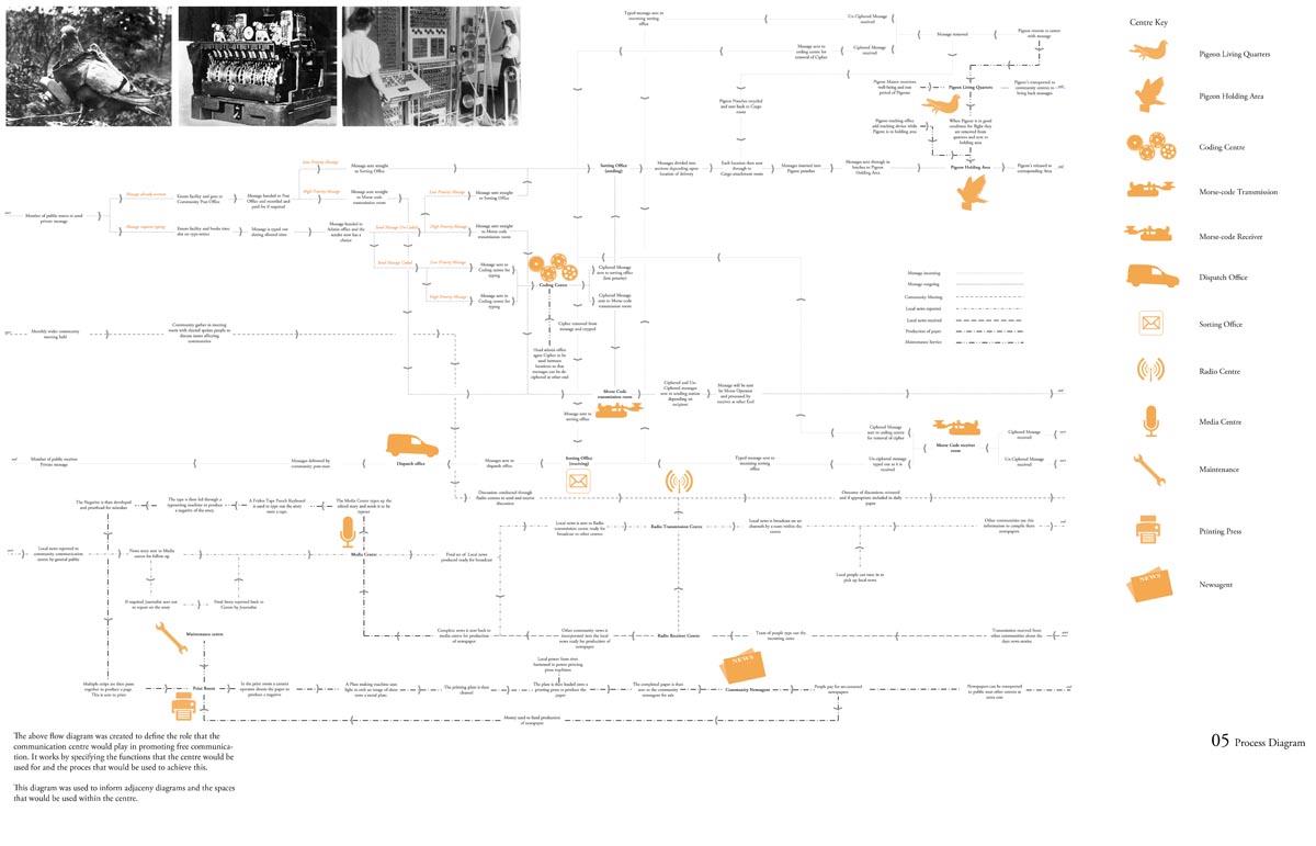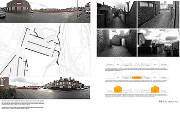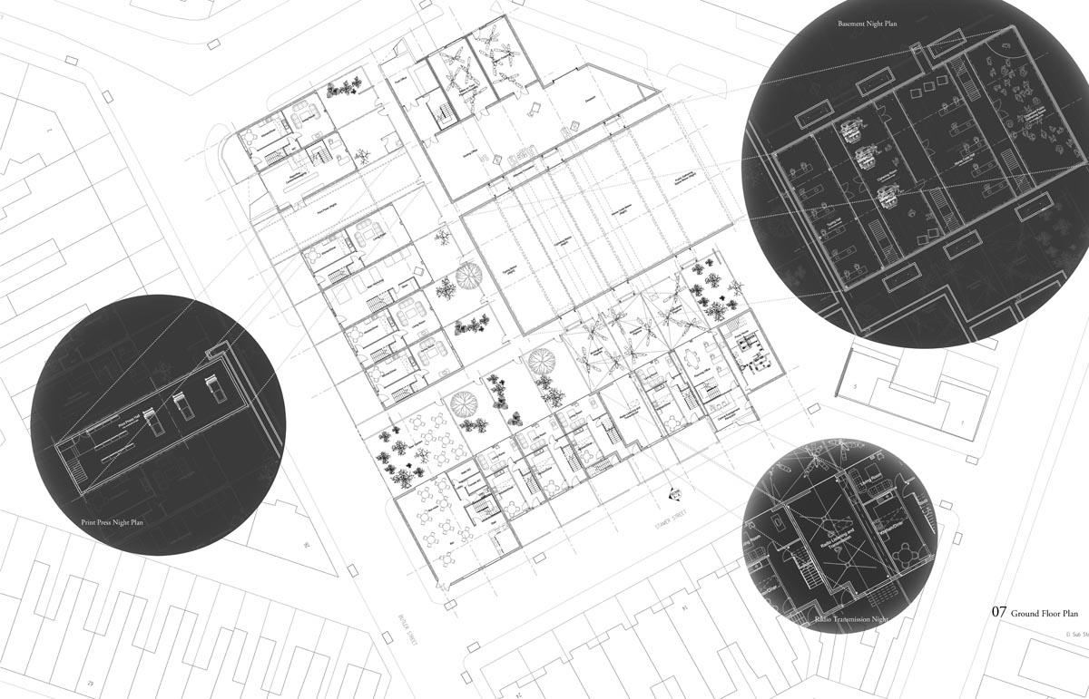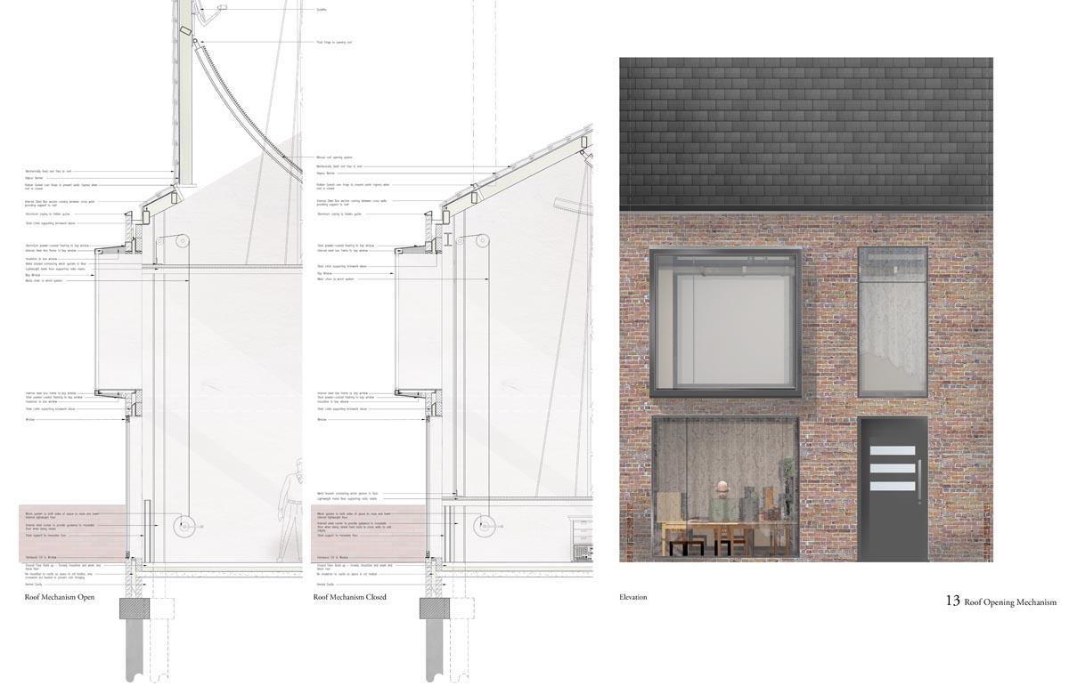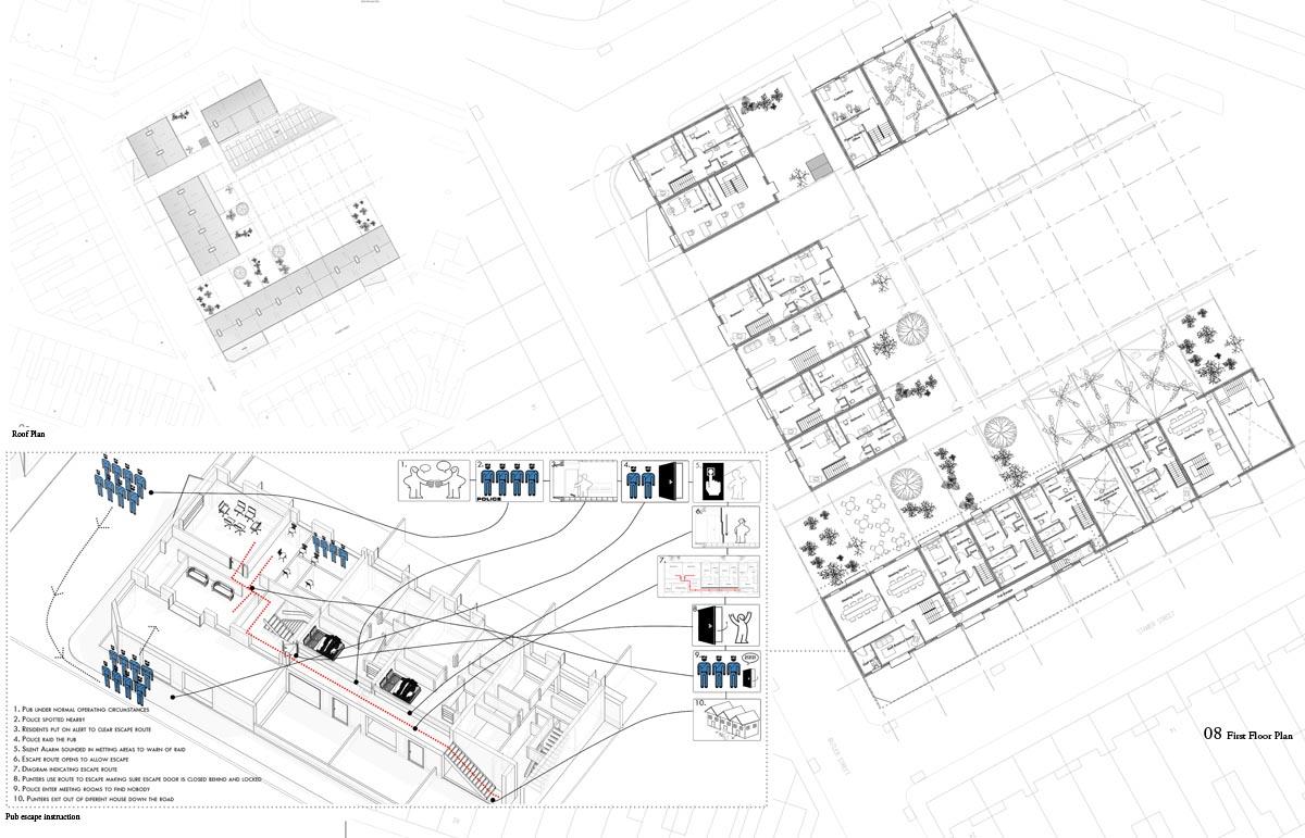 Analogue Shake Part 1 Project 2013 Michael Day Birmingham City University | UK Communication technology has made significant developments in recent years. As technology has evolved, so have the methods that criminality use to cause disruption. It is for this reason that the Government are currently reviewing the “Draft Communications Bill” which would force ISP’s to retain records of every users browsing activity, email correspondence and voice calls for twelve months in case they are required for investigation.There is uncertainty to how the privacy of this information will be maintained. The project speculates on this uncertainty and the effect on society if a government were readily able to view and monitor internet traffic. The backdrop to this project is Stoke-on-Trent, the strong existing communities and a history of influential action groups within Stoke provide a catalyst to revoke against such monitoring. The Draft Bill brings scepticism to these communities and the way people communicate is drastically altered. Over time, people begin to revert back to old stable methods of communications to maintain a level of privacy and solidarity between communities. Type-writers are dusted off, Morse code equipment rejuvenated and Carrier Pigeons bought to enable free communication between communities.The scheme proposed sits on a vacant plot of land spanning between industrial and residential development in Old Stoke Town. Using old communicative technologies remains legal but the authorities want to maintain a level of control and see a threat to any activity which is not visible to them. To ensure the scheme remains as inconspicuous as possible during daylight the project mimics surrounding urban context. Architectural devices such as alleyways are used to deter people who are unfamiliar with the area from entering the complex. Typical residential typologies are exploited to transform their spatial configuration on demand.When night comes however, the community begins to morph and areas previously hidden become visible. Radio transmission hubs open up out of house roofs, the hidden underground Morse code centre becomes accessible, the printing press roof opens up for access and the pigeon despatch begins. All these devices are used to bring free communication to the locals and spread the action group’s anti-government privacy message. Tutor(s)Mr Kevin W Singh Jim Sloan