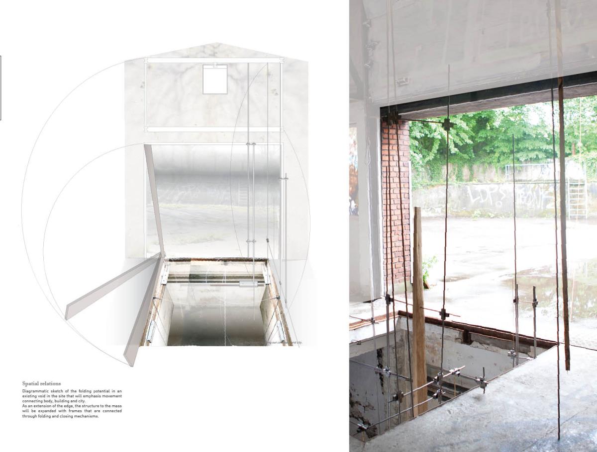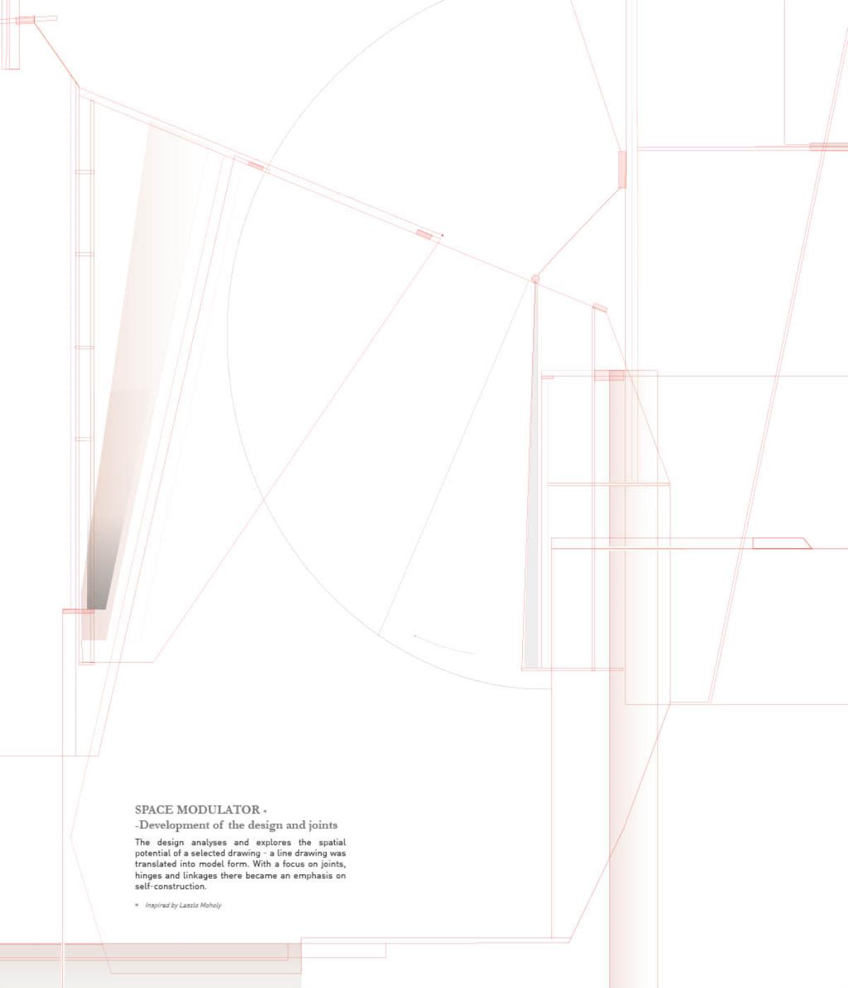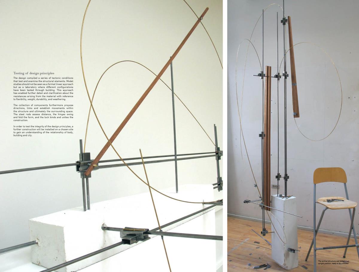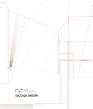 Space modulator Part 2 Project 2013 Kaja Sofie Skytte Jensen Aarhus School of Architecture | Denmark This project is an exploration into an investigative way of working rather than a linear design and build approach. Through working with the natural characteristics of materials the project explores and develops through building and testing with a structure that ultimately becomes an expression of the material itself.The project focuses upon sequence and the transition between spaces with emphasis on the binding of elements through joints, linkages and hinges. With a focus on collecting, coupling and connecting, the project critically analyses the selected site on a body-, building- and city-scale. Interconnections between an existing site and proposed construction create new meetings where old and new are juxtaposed. Studies of these meetings identify new potentials for the relationship between spaces, forming new connections and transitions.Firmly rooted in the art of making, the structural proposal is developed through a series of scale models and mock-ups. This hands-on approach to design explores the testing of materials from micro scale to a full 1:1 construction on a chosen site.Different drop and level shifts characterize the site – an old cheese store and machine shop, situated on the edge of a gap between cultural institutions, residential areas, the underground rail facilities, cargo space and the city. The design and location have developed together to allow for new spatial potentials and transitions that are unobtrusive. The construction is therefore purely site specific and represents a dialogue between a sensitive architectural intervention and site location. The meeting of elements both in materiality and form works to enforce the character of the existing spaceThe movement of the installation through hinged parts emphasises the flexibility of construction and approach to the existing site characteristics, and ultimately the relation between the structure and human form.The overall building form was thoroughly examined to give a unique proposal that works directly with the site’s potential. Within this context, the site was used as a laboratory where joints and materials were tested and examined through the methodology of making, testing and on site exploration.The design synthesis has been documented in three parts; space, construction and assembly. Tutor(s) Claudia Carbone