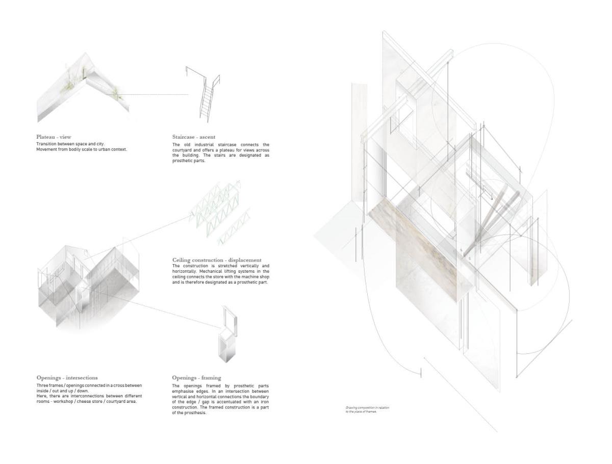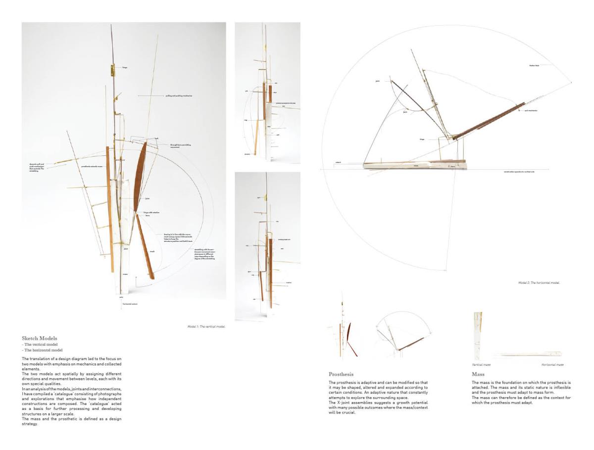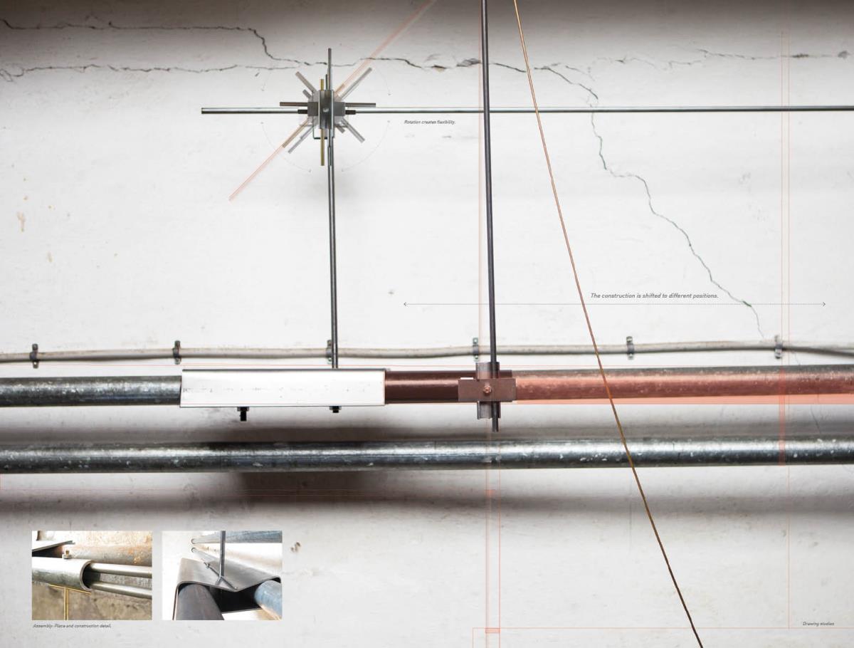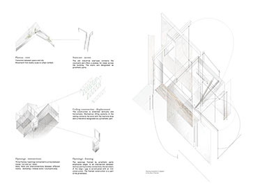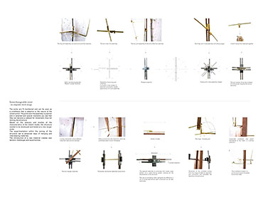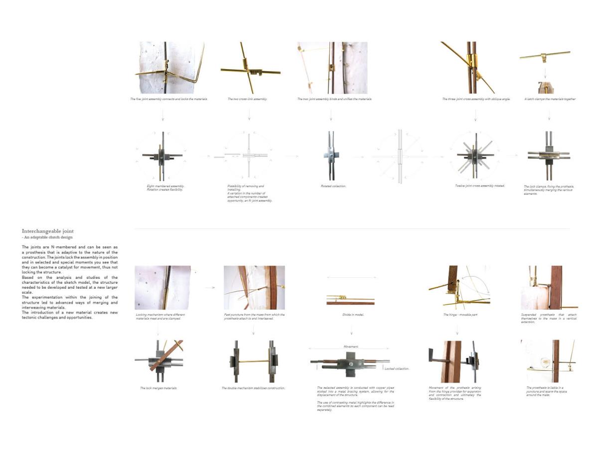 Space modulator Part 2 Project 2013 Kaja Sofie Skytte Jensen Aarhus School of Architecture | Denmark This project is an exploration into an investigative way of working rather than a linear design and build approach. Through working with the natural characteristics of materials the project explores and develops through building and testing with a structure that ultimately becomes an expression of the material itself.The project focuses upon sequence and the transition between spaces with emphasis on the binding of elements through joints, linkages and hinges. With a focus on collecting, coupling and connecting, the project critically analyses the selected site on a body-, building- and city-scale. Interconnections between an existing site and proposed construction create new meetings where old and new are juxtaposed. Studies of these meetings identify new potentials for the relationship between spaces, forming new connections and transitions.Firmly rooted in the art of making, the structural proposal is developed through a series of scale models and mock-ups. This hands-on approach to design explores the testing of materials from micro scale to a full 1:1 construction on a chosen site.Different drop and level shifts characterize the site – an old cheese store and machine shop, situated on the edge of a gap between cultural institutions, residential areas, the underground rail facilities, cargo space and the city. The design and location have developed together to allow for new spatial potentials and transitions that are unobtrusive. The construction is therefore purely site specific and represents a dialogue between a sensitive architectural intervention and site location. The meeting of elements both in materiality and form works to enforce the character of the existing spaceThe movement of the installation through hinged parts emphasises the flexibility of construction and approach to the existing site characteristics, and ultimately the relation between the structure and human form.The overall building form was thoroughly examined to give a unique proposal that works directly with the site’s potential. Within this context, the site was used as a laboratory where joints and materials were tested and examined through the methodology of making, testing and on site exploration.The design synthesis has been documented in three parts; space, construction and assembly. Tutor(s) Claudia Carbone