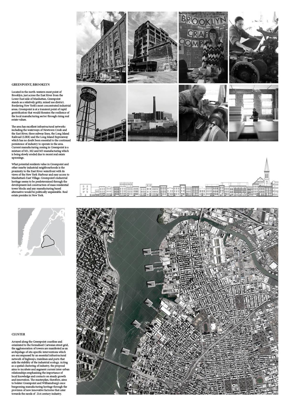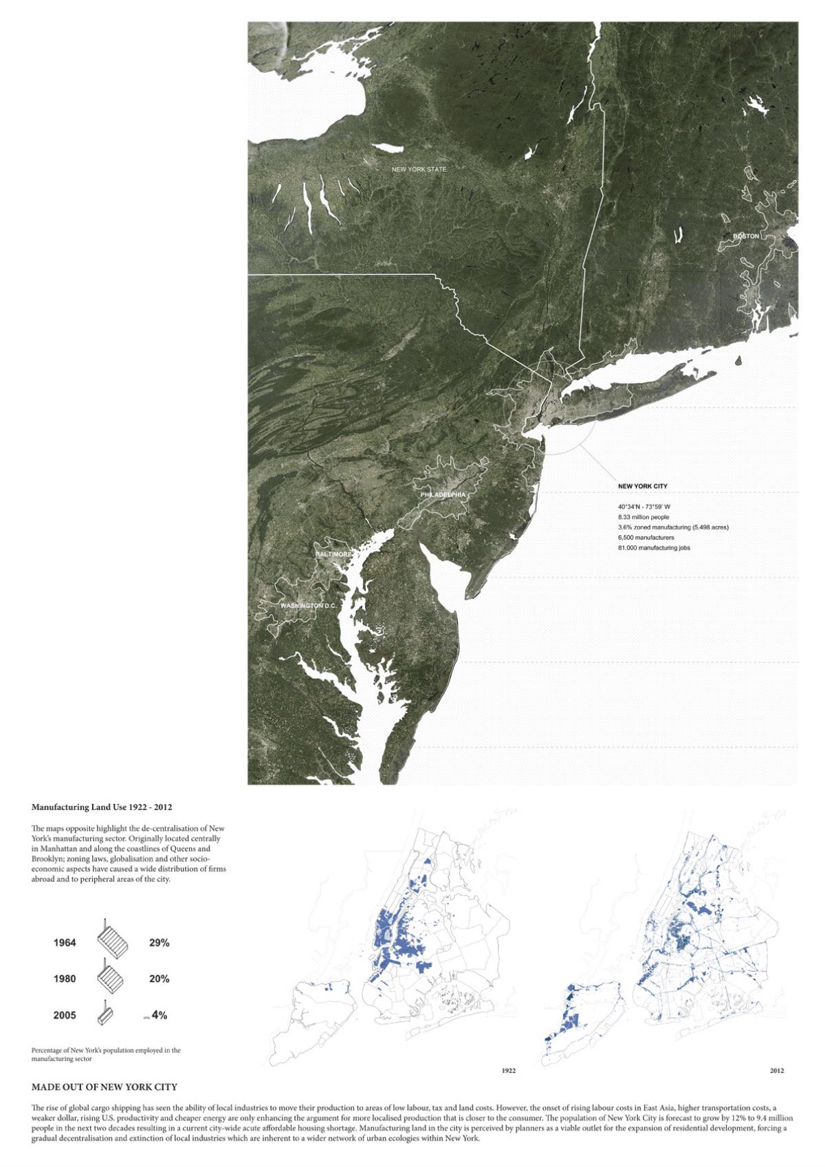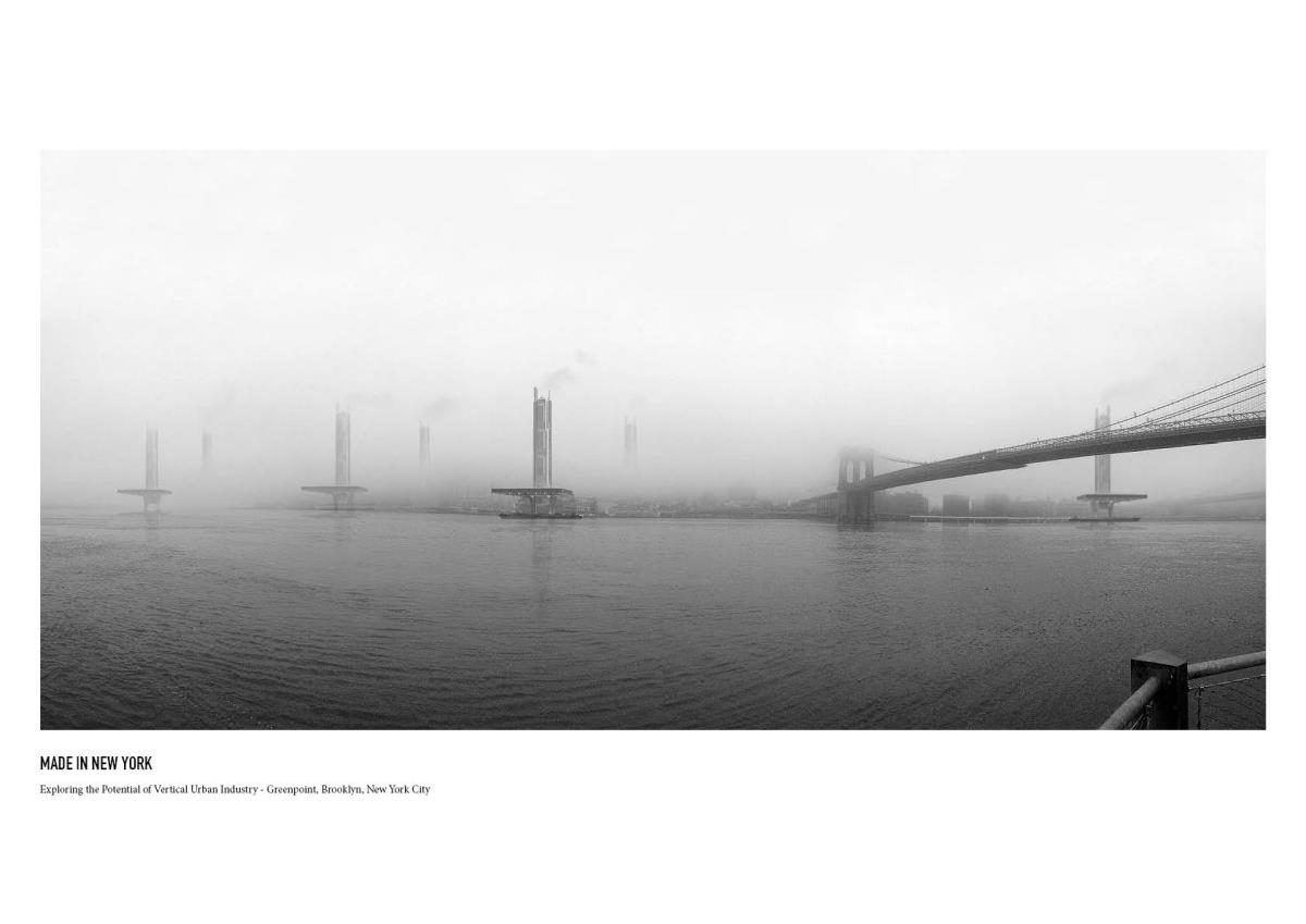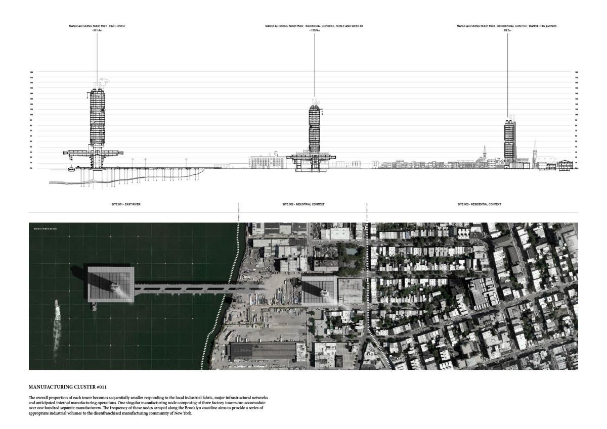 Made in New York – Exploring The Potential Of Vertical Urban Industry Part 2 Project 2014 Stuart Beattie University of Cambridge | UK In the past few decades the world economy has seen a global shift of industry eastwards to the emerging markets of China and India purely for economic efficiency but not innovation. The rate at which urban populations are expanding will impact upon how we perceive the strategies of sustaining our cities with regards to supply and demand. The rise of global cargo shipping has seen the ability of local industries to move their production to areas of low labour, tax and land costs. However, the onset of rising labour costs in East Asia, higher transportation costs, a weaker dollar, rising U.S. productivity and cheaper energy are only enhancing the argument for more localised production that is closer to the consumer.This project explores the possibility of an alternative to inefficient horizontal industrial sprawl by considering the prospect of a new vertiginous architectural typology in the form of a vertical factory devoted to the stabilisation and re-integration of manufacturing in inner city New York. Arrayed along the post-industrialised Brooklyn coastline, the industrial cluster, composed of seventeen uniform vertical factory towers, would cater towards the neglected light manufacturers thus acting as a physical and economic buffer to nearby development-led residential construction. The project is seen as not just another egotistical attempt to surpass height or imposition but for the project to serve as an example for the city, an industrial paradigm or archipelago to be read as one single entity within the eclectic skyline of New York.In addition to a declining manufacturing sector, not aided by recent re-zonings or passive policy measures, the pressure on manufacturers to relocate in the face of development-led socio-spatial conflicts will only grow exponentially with a burgeoning population and an ever increasing reliance on imports. By reconsidering the potential for a new industrial spatial paradigm, it could dramatically alter how we perceive strategies of making and consuming ultimately as an instrument for the retention of the local manufacturing base culminating in a more economically diverse, stable New York. Tutor(s) Ingrid Schröder