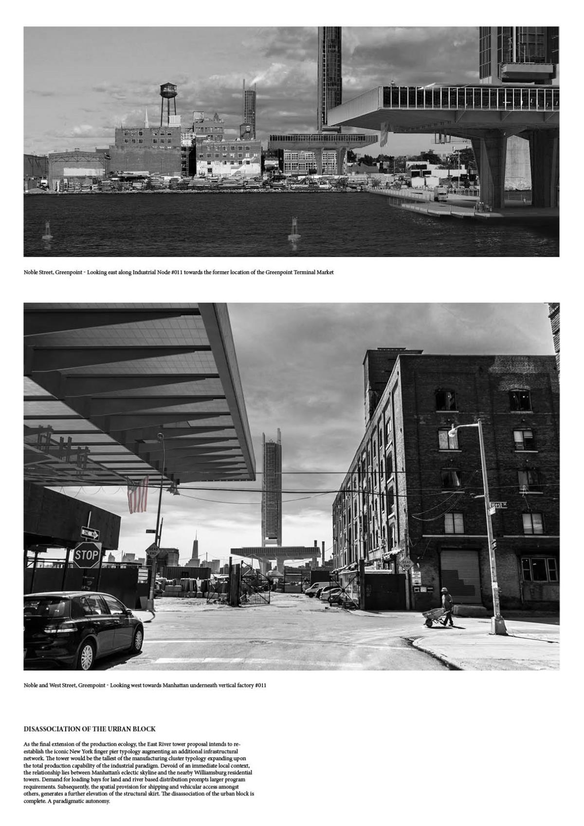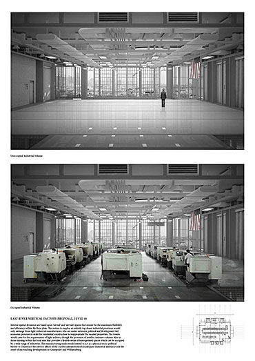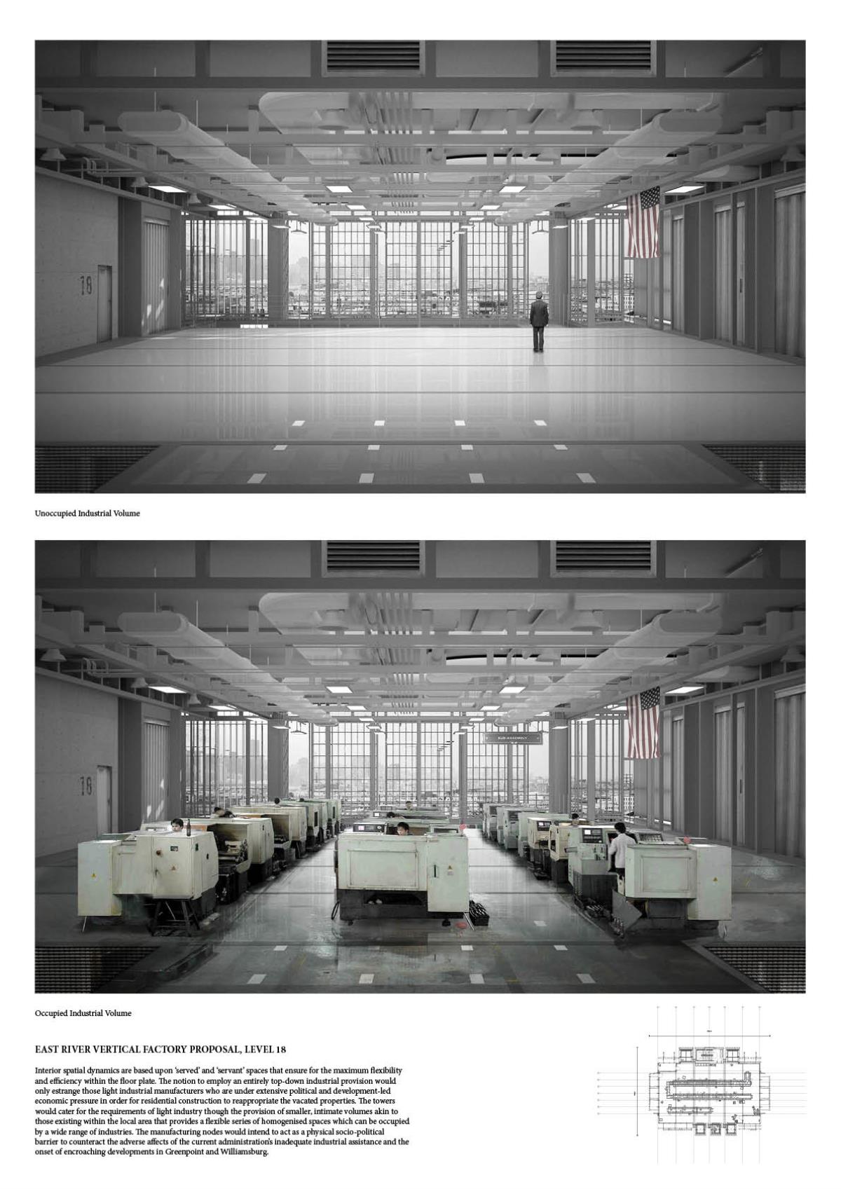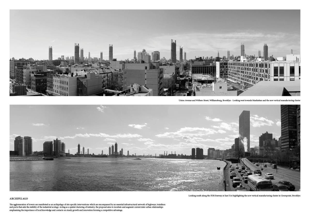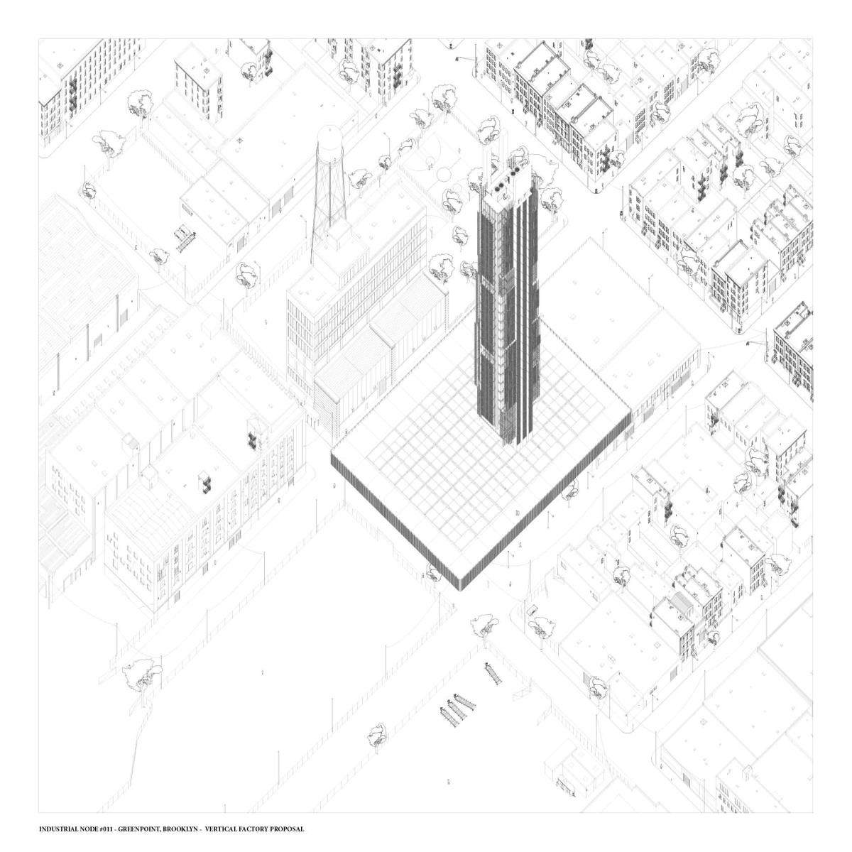 Made in New York – Exploring The Potential Of Vertical Urban Industry Part 2 Project 2014 Stuart Beattie University of Cambridge | UK In the past few decades the world economy has seen a global shift of industry eastwards to the emerging markets of China and India purely for economic efficiency but not innovation. The rate at which urban populations are expanding will impact upon how we perceive the strategies of sustaining our cities with regards to supply and demand. The rise of global cargo shipping has seen the ability of local industries to move their production to areas of low labour, tax and land costs. However, the onset of rising labour costs in East Asia, higher transportation costs, a weaker dollar, rising U.S. productivity and cheaper energy are only enhancing the argument for more localised production that is closer to the consumer.This project explores the possibility of an alternative to inefficient horizontal industrial sprawl by considering the prospect of a new vertiginous architectural typology in the form of a vertical factory devoted to the stabilisation and re-integration of manufacturing in inner city New York. Arrayed along the post-industrialised Brooklyn coastline, the industrial cluster, composed of seventeen uniform vertical factory towers, would cater towards the neglected light manufacturers thus acting as a physical and economic buffer to nearby development-led residential construction. The project is seen as not just another egotistical attempt to surpass height or imposition but for the project to serve as an example for the city, an industrial paradigm or archipelago to be read as one single entity within the eclectic skyline of New York.In addition to a declining manufacturing sector, not aided by recent re-zonings or passive policy measures, the pressure on manufacturers to relocate in the face of development-led socio-spatial conflicts will only grow exponentially with a burgeoning population and an ever increasing reliance on imports. By reconsidering the potential for a new industrial spatial paradigm, it could dramatically alter how we perceive strategies of making and consuming ultimately as an instrument for the retention of the local manufacturing base culminating in a more economically diverse, stable New York. Tutor(s) Ingrid Schröder