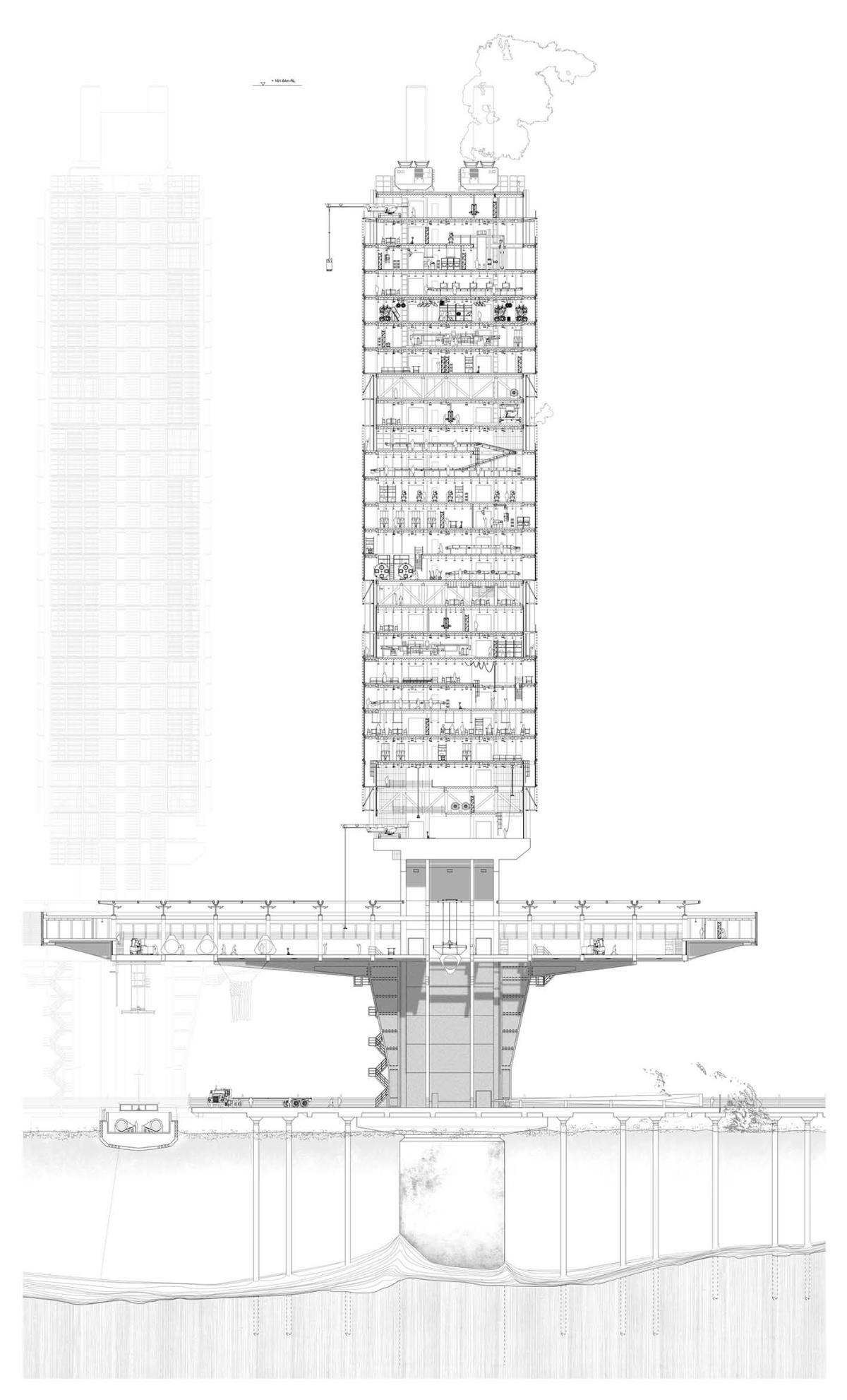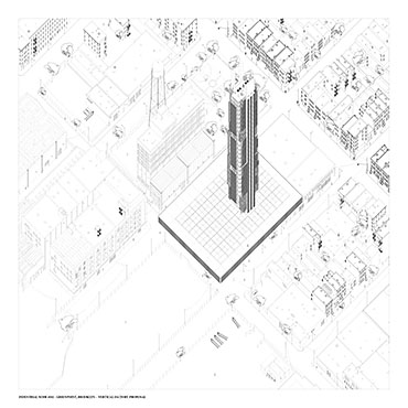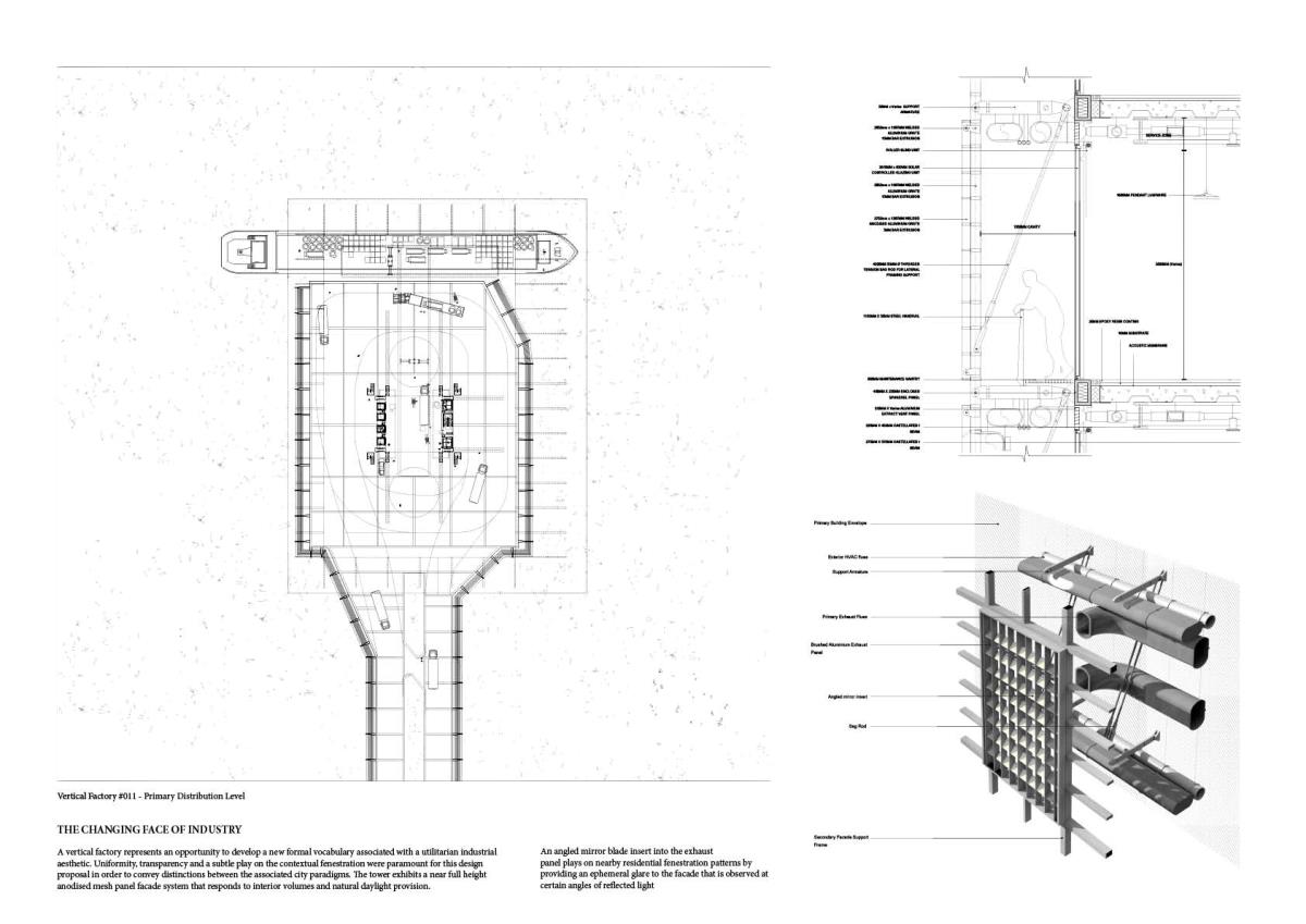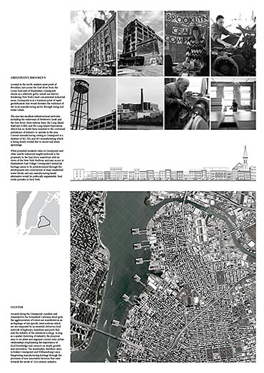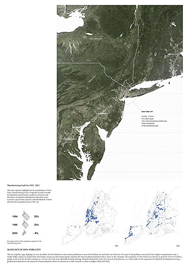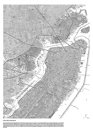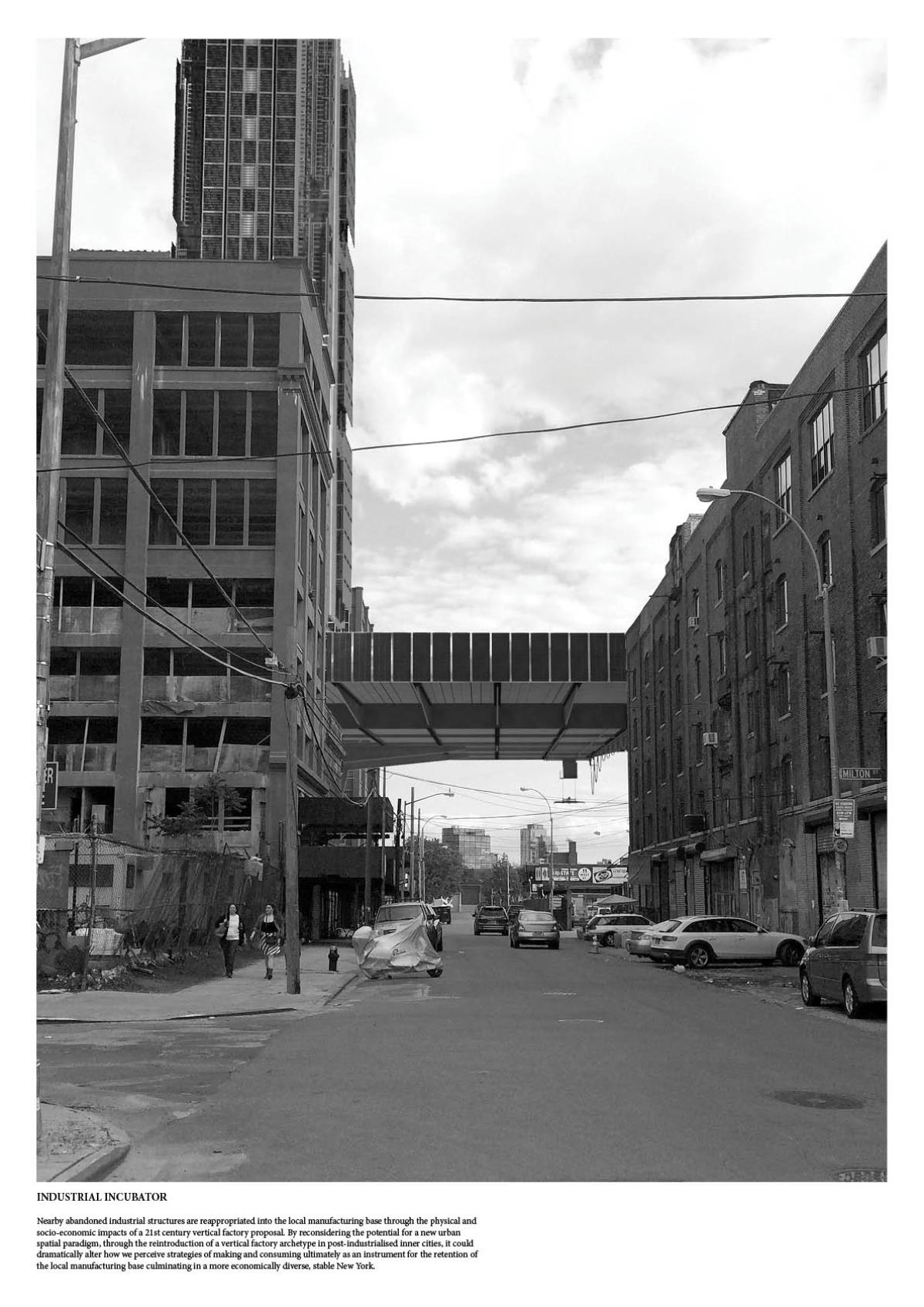 Made in New York – Exploring The Potential Of Vertical Urban Industry Part 2 Project 2014 Stuart Beattie University of Cambridge | UK In the past few decades the world economy has seen a global shift of industry eastwards to the emerging markets of China and India purely for economic efficiency but not innovation. The rate at which urban populations are expanding will impact upon how we perceive the strategies of sustaining our cities with regards to supply and demand. The rise of global cargo shipping has seen the ability of local industries to move their production to areas of low labour, tax and land costs. However, the onset of rising labour costs in East Asia, higher transportation costs, a weaker dollar, rising U.S. productivity and cheaper energy are only enhancing the argument for more localised production that is closer to the consumer.This project explores the possibility of an alternative to inefficient horizontal industrial sprawl by considering the prospect of a new vertiginous architectural typology in the form of a vertical factory devoted to the stabilisation and re-integration of manufacturing in inner city New York. Arrayed along the post-industrialised Brooklyn coastline, the industrial cluster, composed of seventeen uniform vertical factory towers, would cater towards the neglected light manufacturers thus acting as a physical and economic buffer to nearby development-led residential construction. The project is seen as not just another egotistical attempt to surpass height or imposition but for the project to serve as an example for the city, an industrial paradigm or archipelago to be read as one single entity within the eclectic skyline of New York.In addition to a declining manufacturing sector, not aided by recent re-zonings or passive policy measures, the pressure on manufacturers to relocate in the face of development-led socio-spatial conflicts will only grow exponentially with a burgeoning population and an ever increasing reliance on imports. By reconsidering the potential for a new industrial spatial paradigm, it could dramatically alter how we perceive strategies of making and consuming ultimately as an instrument for the retention of the local manufacturing base culminating in a more economically diverse, stable New York. Tutor(s) Ingrid Schröder