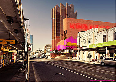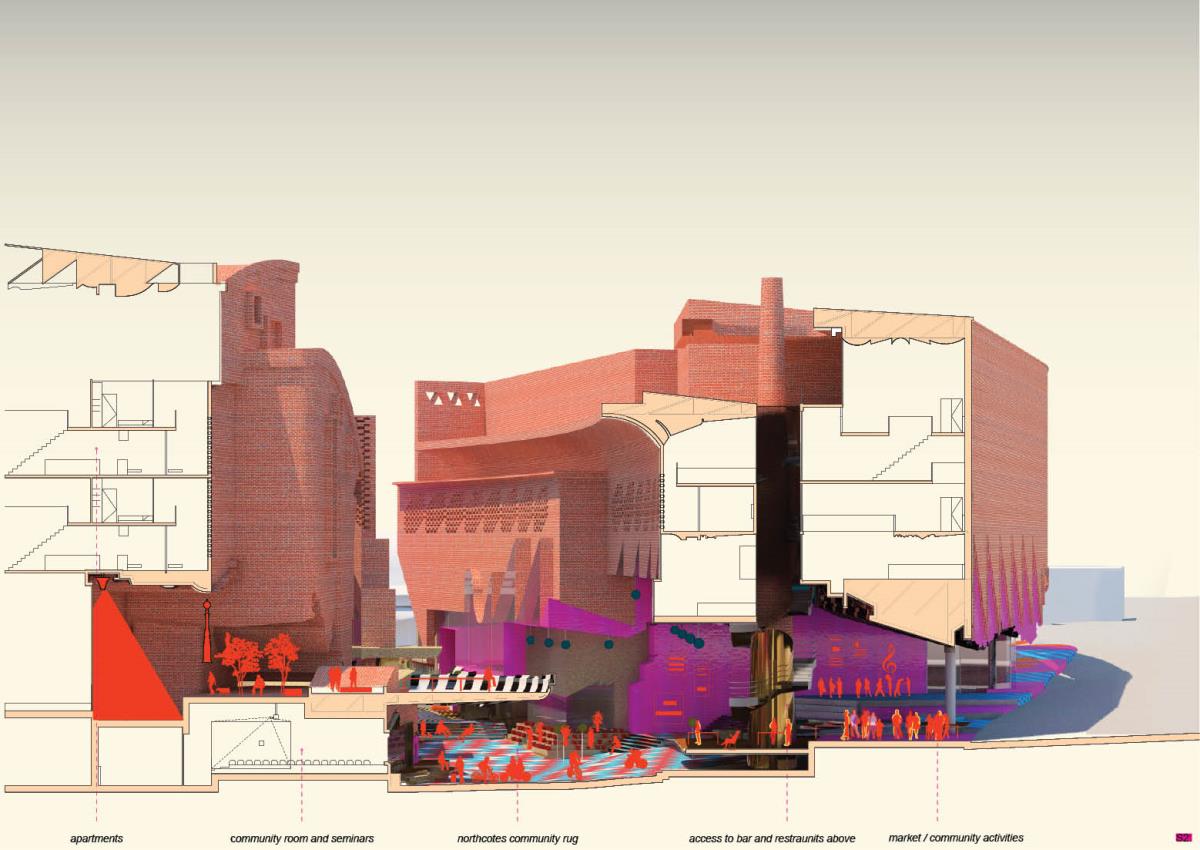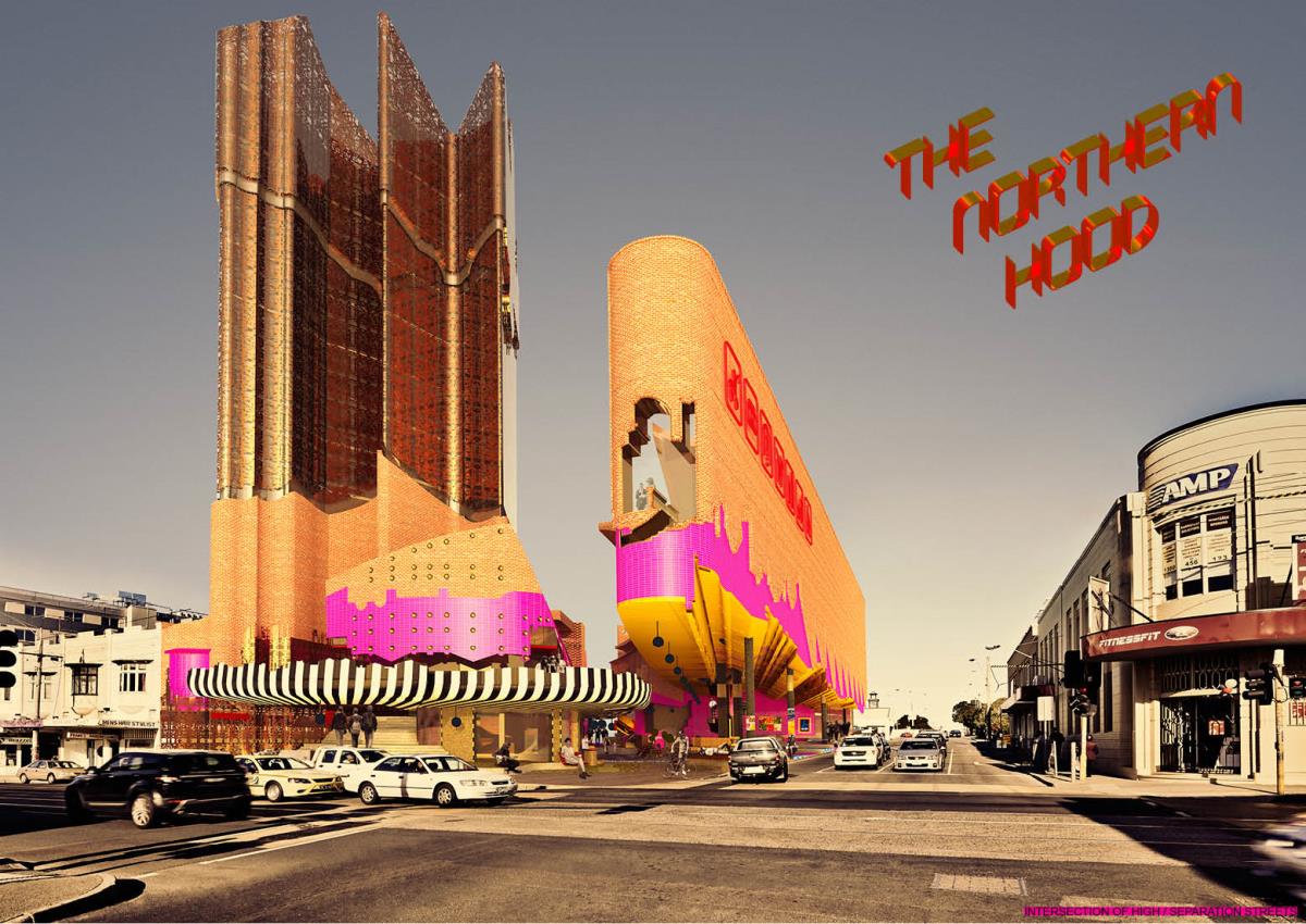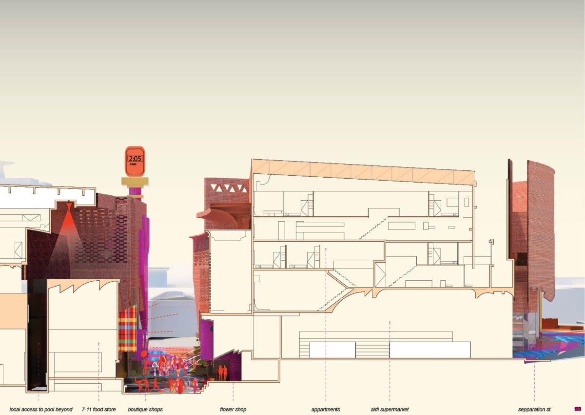 Sited in Northcote, a suburb 7 kms from Melbourne, this project does three things: it rescales the idea of the household living room to the scale of the urban environment; it consolidates existing site relationships to give Northcote a city centre; and it amplifies the character, culture and vibrancy of Northcote's High Street.