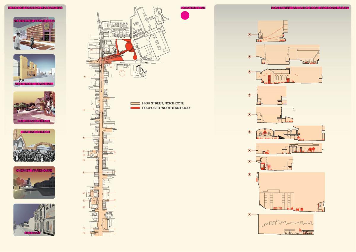 Northcote's character and identity is enriched with a "public living room" that extends the local residences and takes on the identity of the town. Idiosyncratic local details and forgotten memories are rescaled and redeployed to create a rich and vivid spatial conditions that meet the needs of growing communities within Northcote.
